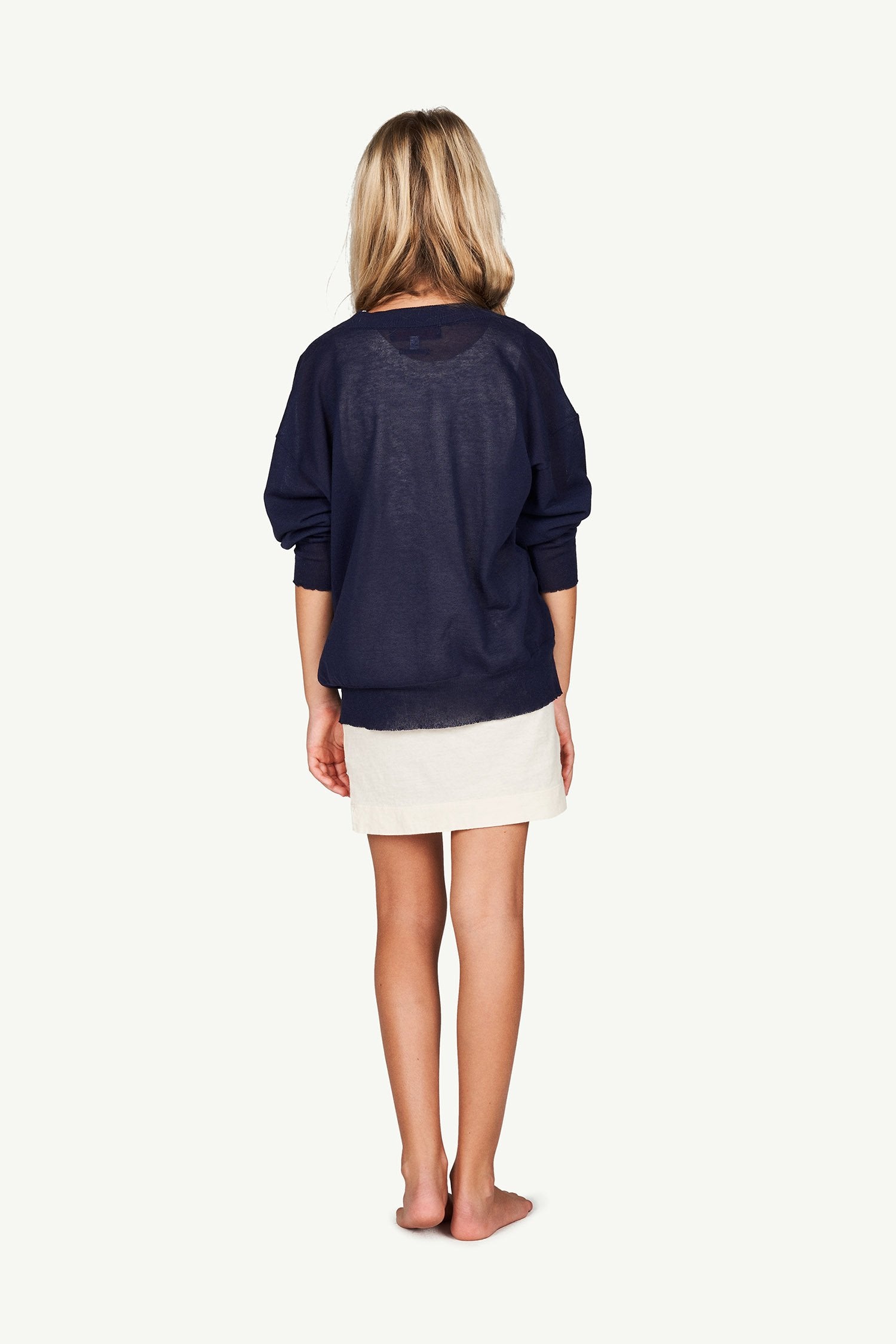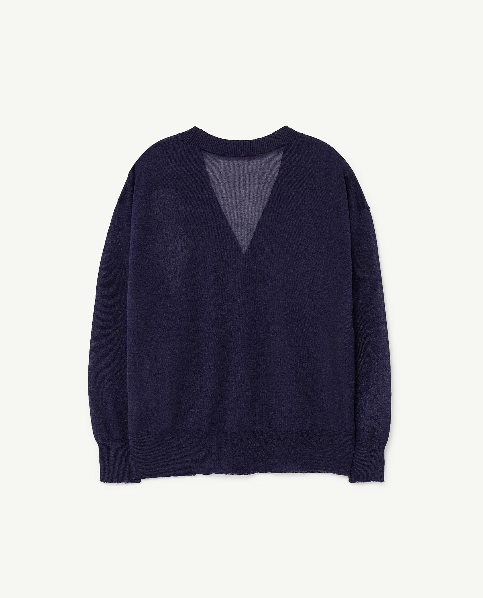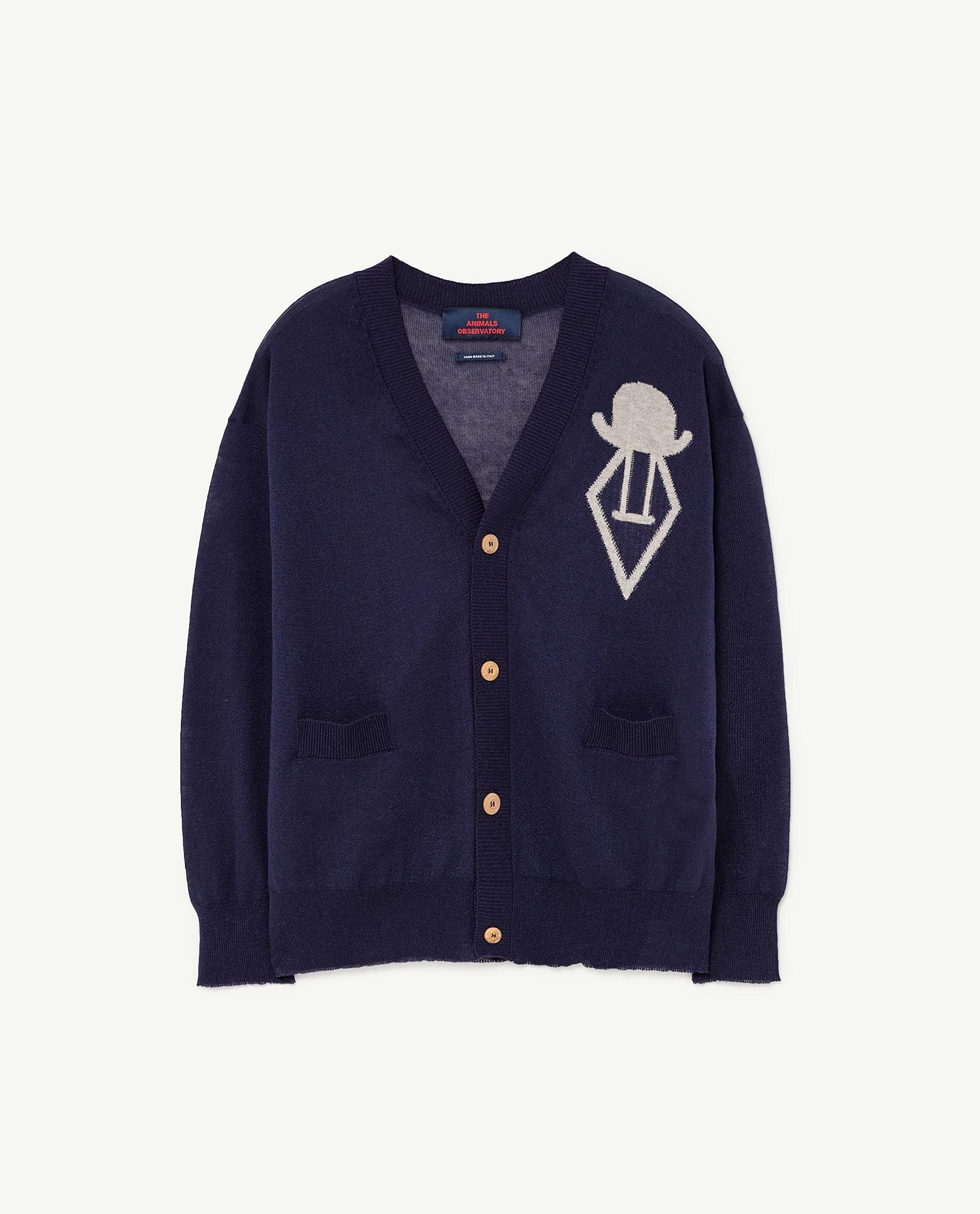 The Navy Racoon Cardigan is an elegant classic, featuring buttons, two pockets and the The Animals Observatory logo on the front.