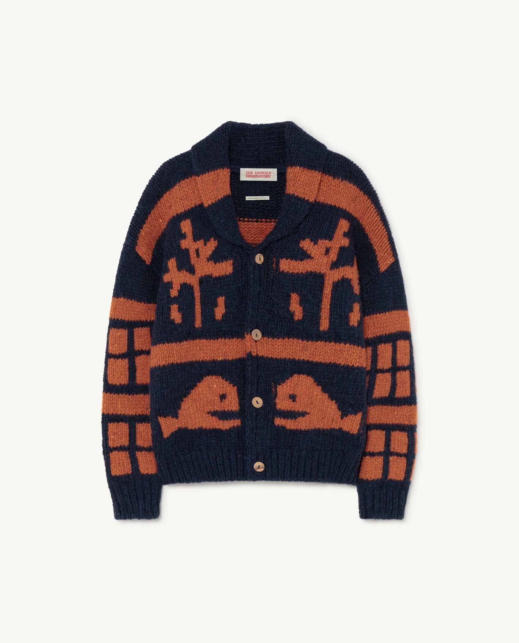 The ultimate in cosy winter style, this Navy Raven Cardigan has a funky whale print in contrasting blue and orange. Exclusively available on The Animals Observatory online shop.