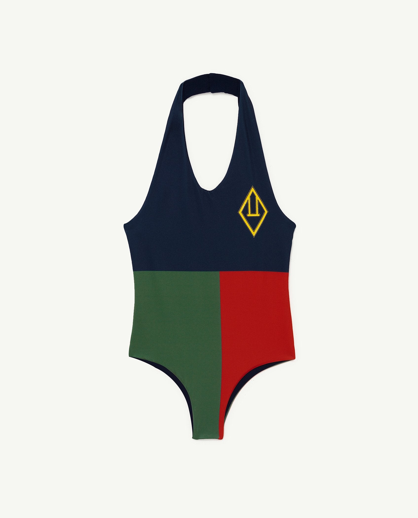 The Navy Squares Fish Swimsuit, a classic style swimsuit featuring a halter neck, colour-block and The Animals Observatory logo on the front. Made from recycled polyester (made from sea plastic) and with the added benefit of SPF50+ protection.