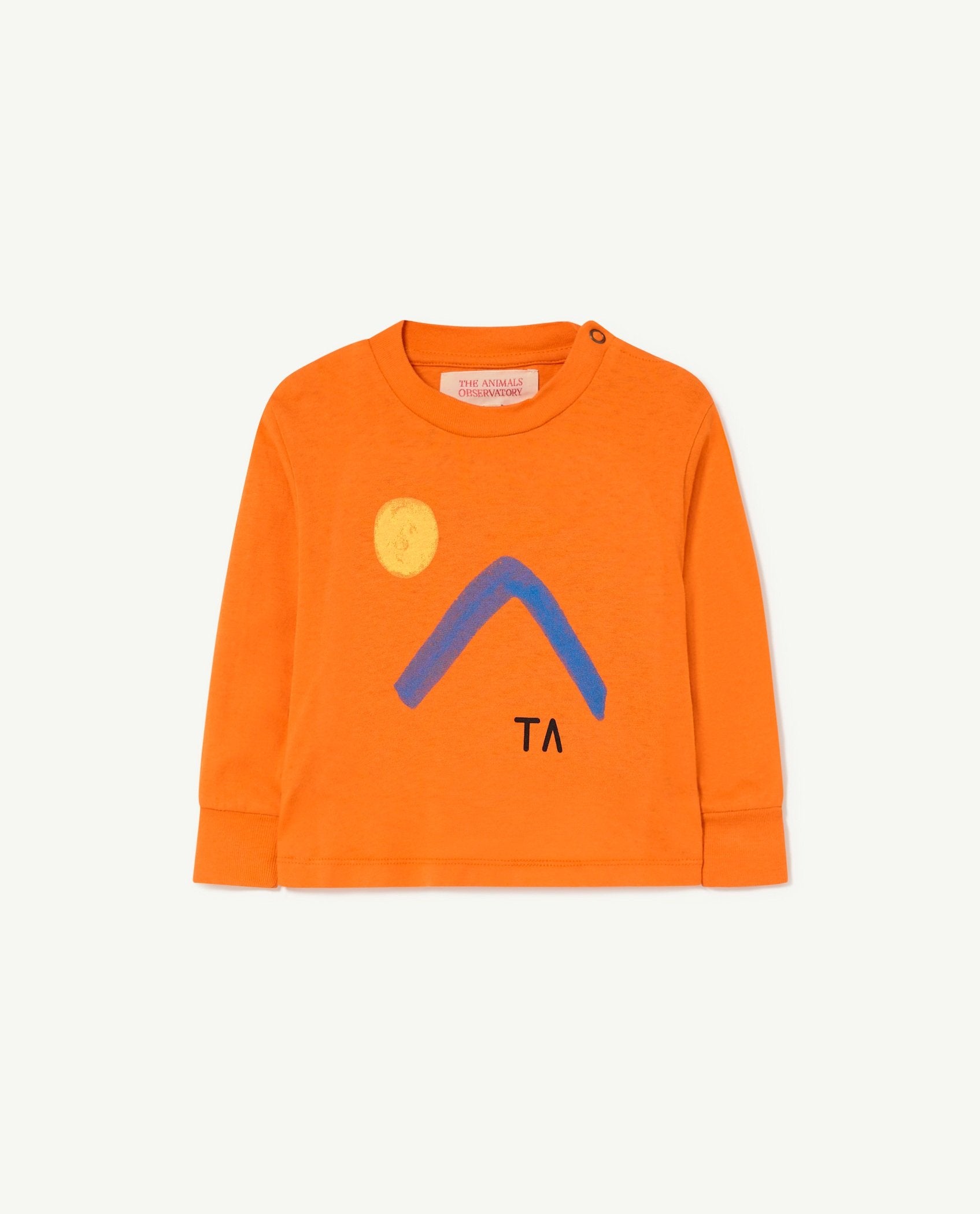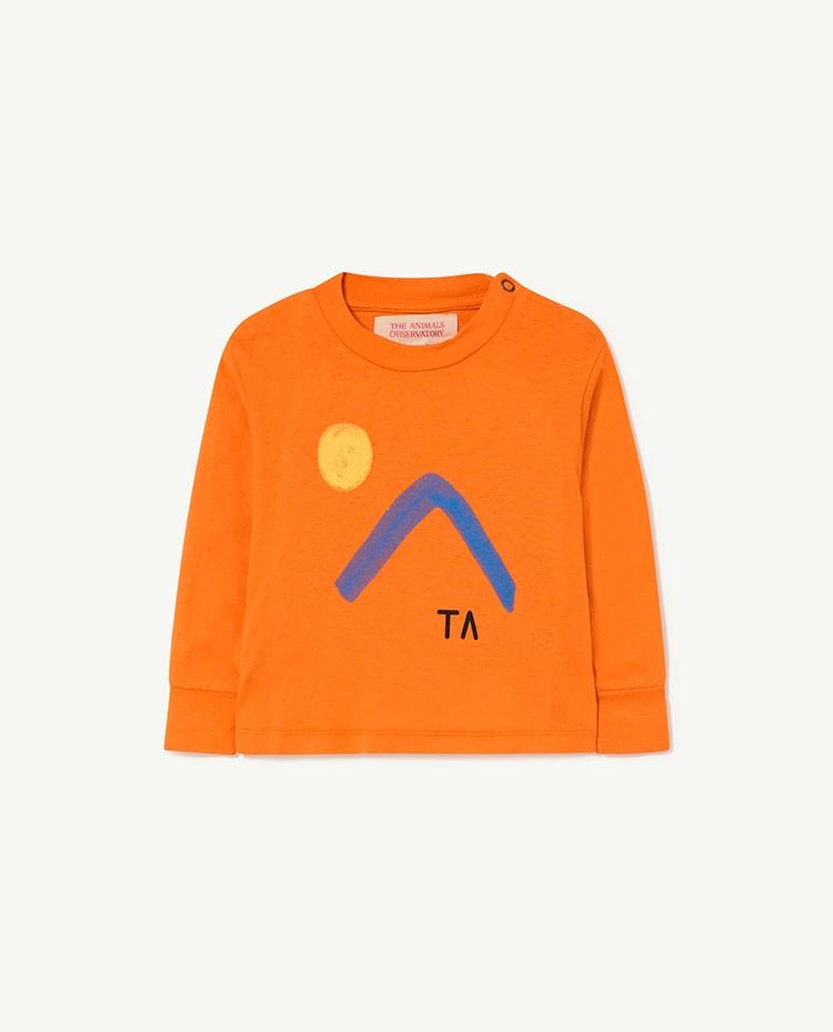 The Orange Dog Baby T-Shirt is 100% cotton made its cuffs are elastic. It is also a fantastic piece of layer for the colder times, and it features the sun rising behind a house. Its sizes go from 6 to 18 months.