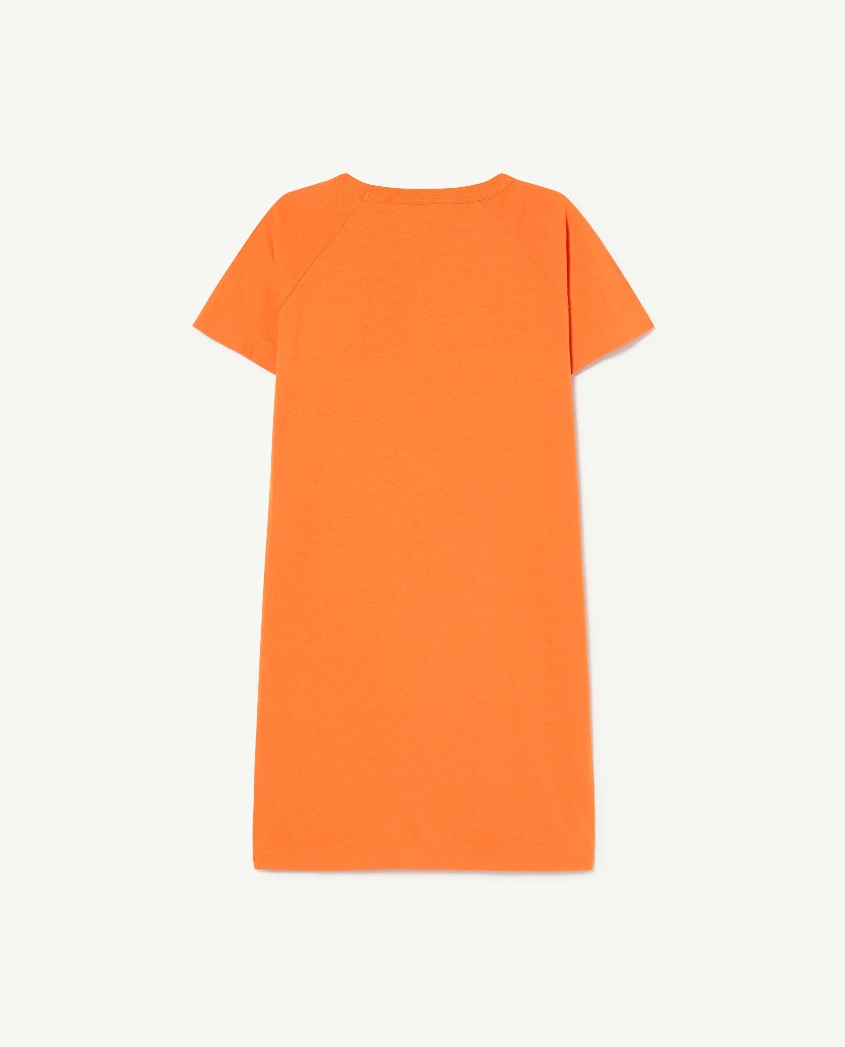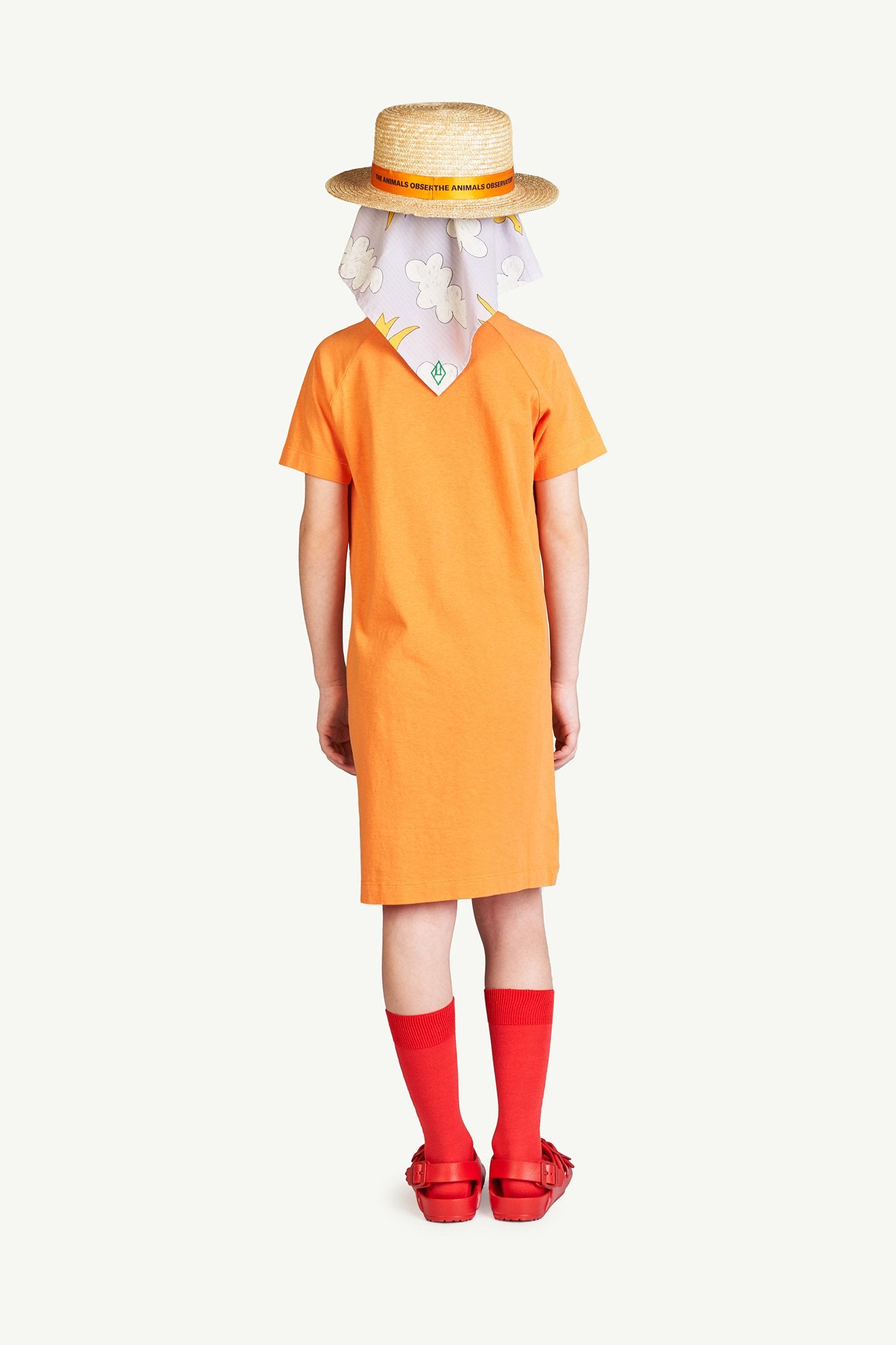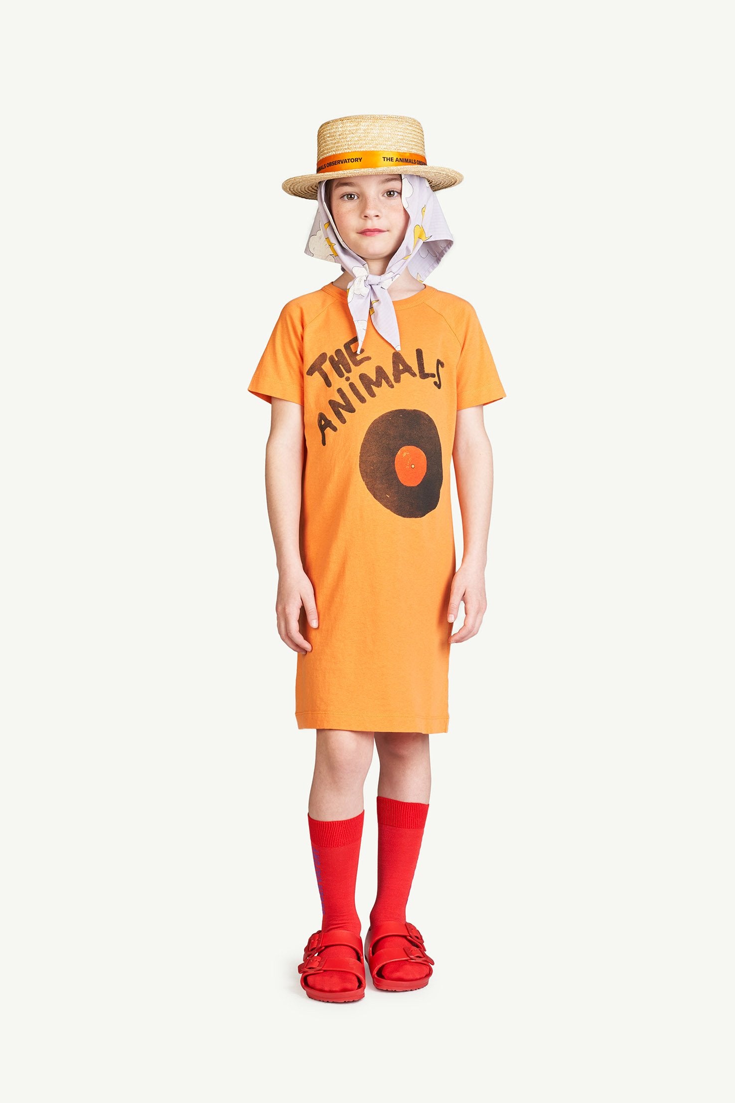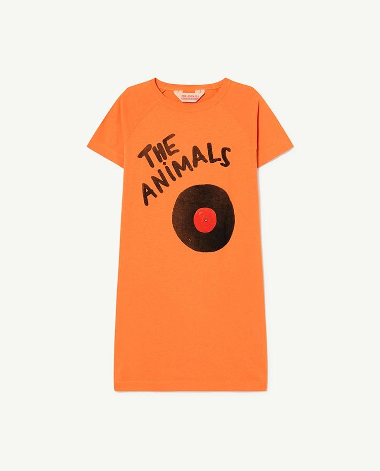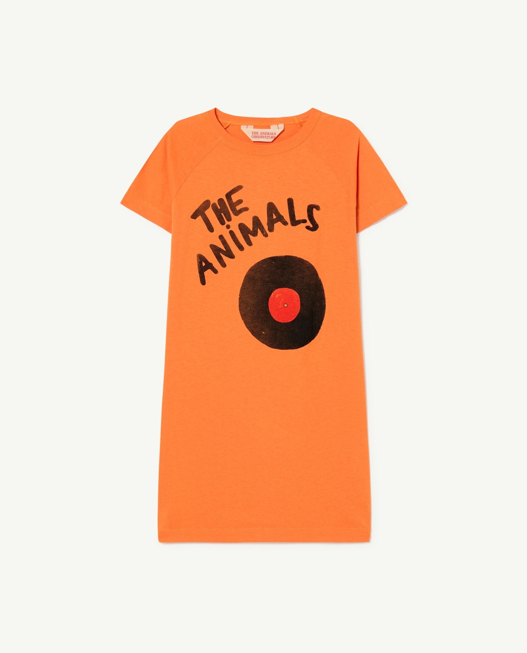 The Orange Gorilla Dress is a short-sleeves shift dres that features The Animals capital letters and an iconic print. 100% cotton made and fresh to move around. The model's height is 132 cm and is wearing size 8 years.