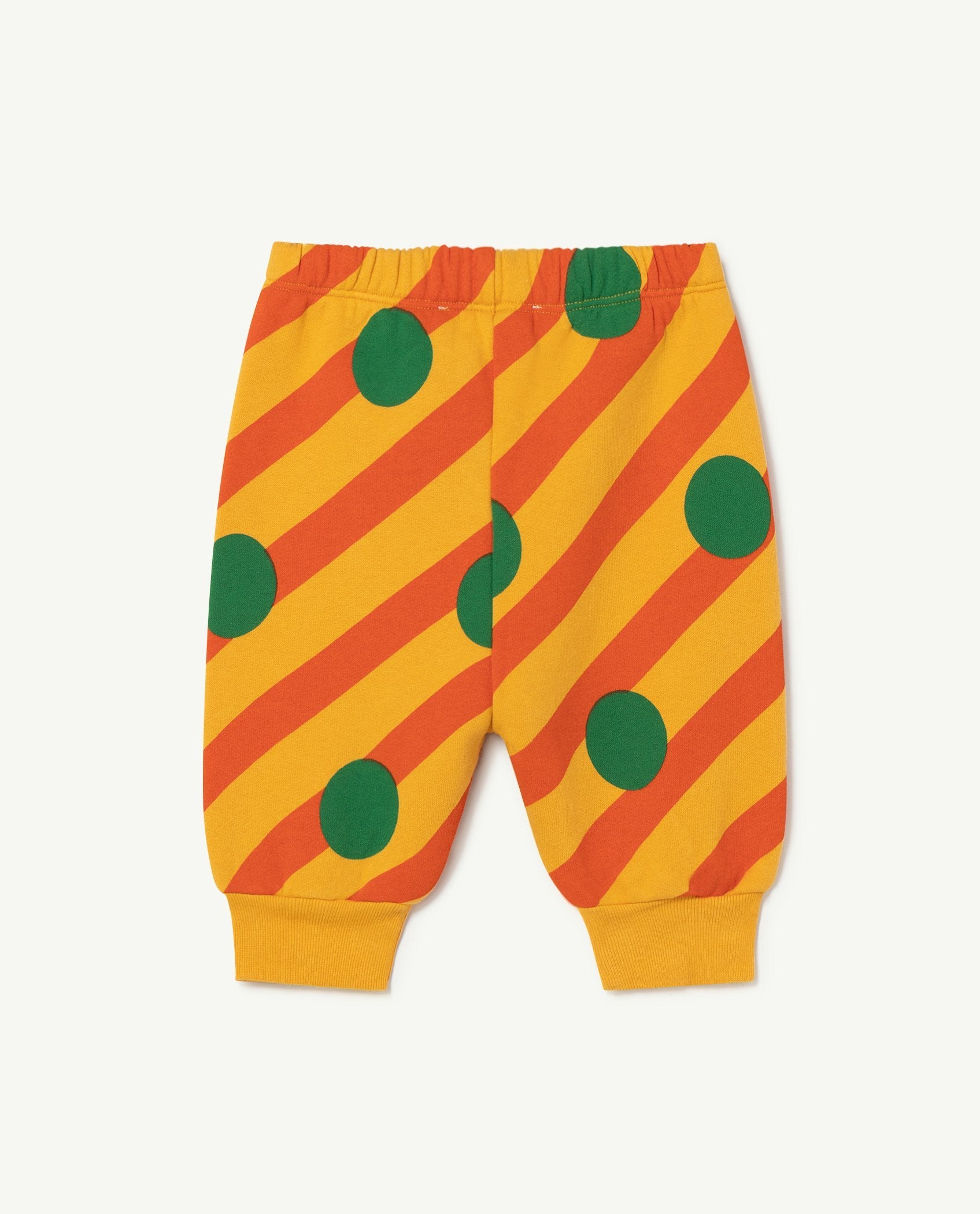 These 100% cotton Yellow Dromedary Baby Pants are so easy and comfortable they will want to wear them all the time. Featuring green dots and orange stripes.