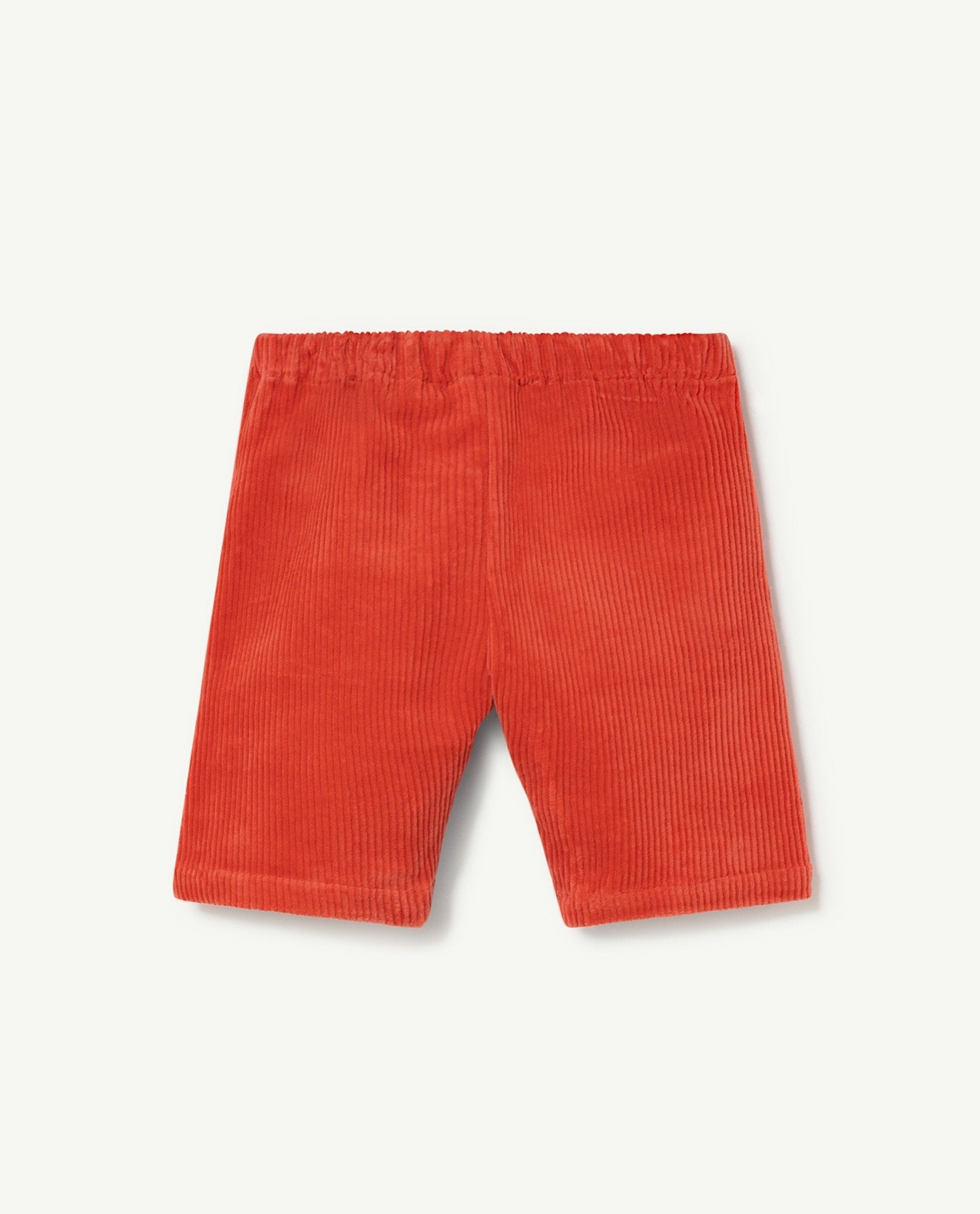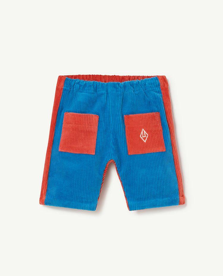 This wide leg Blue Emu Baby Pants combine red and blue. They have an elastic waist and two circular patch pockets on the front. The Animals Observatory logo is in the left front pocket. They are 100% cotton made.