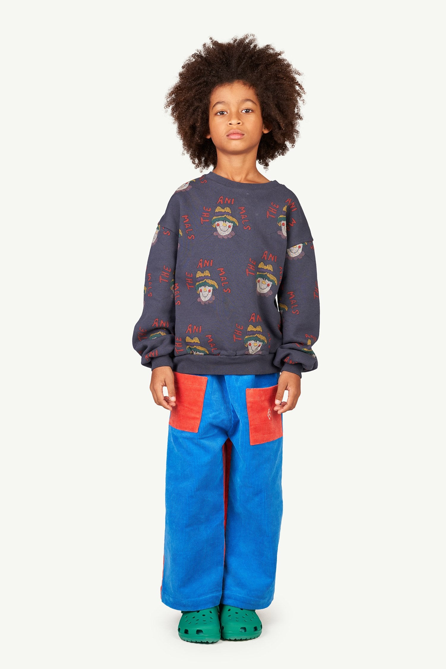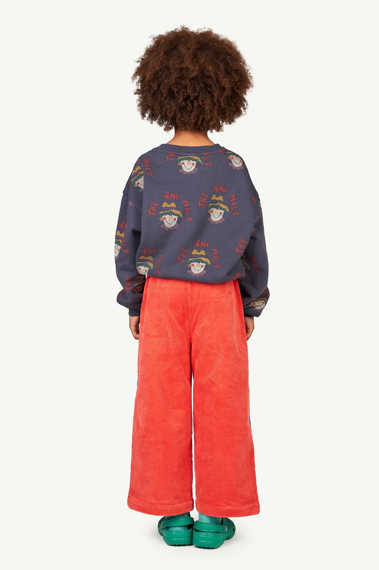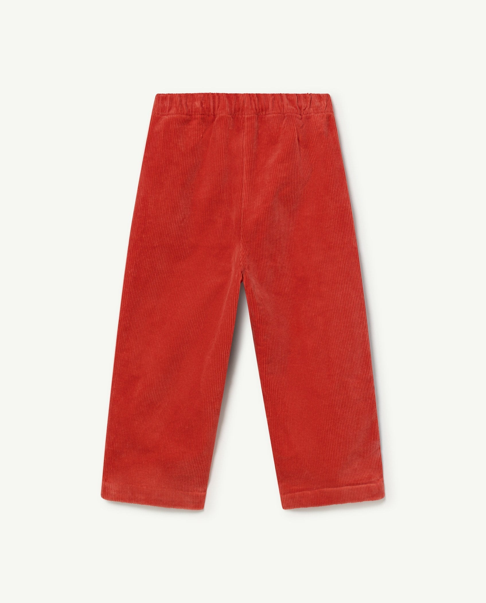 This wide leg pana Blue Emu Kids relaxed fit Pants combine red and blue. They have an elastic waist and two circular patch pockets on the front. The Animals Observatory logo is in the left front pocket. They are 100% cotton made. The model's height is 131 cm and is wearing size 8 years.