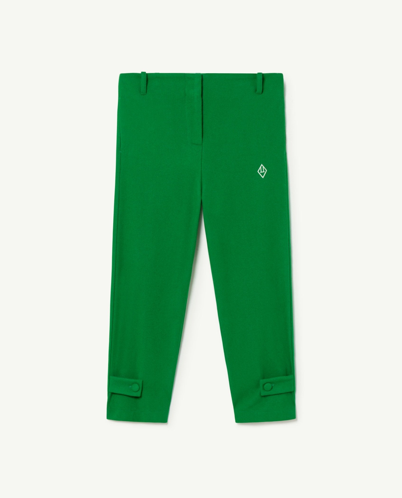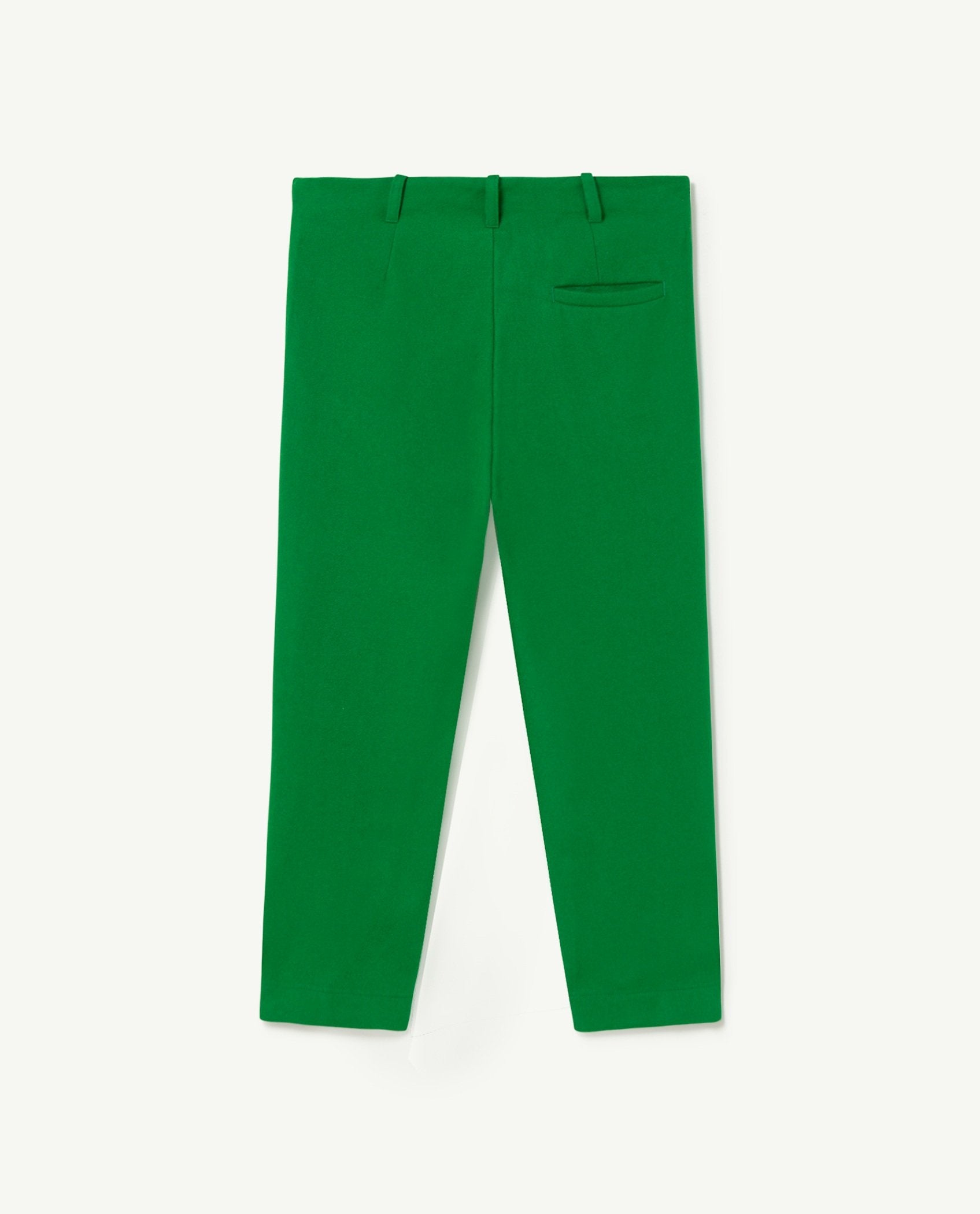 This wool Green Chicken Kids regular fit Pants capri inspired have a tub finish in the ankle and a belt loop. The Animals Observatory logo is in the front and two vertical pockets are on each side. There is also a back pocket on the right side. The model's height is 128 cm and is wearing size 8 years.