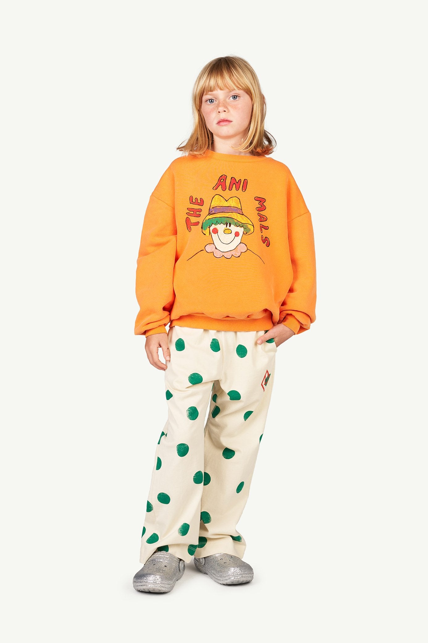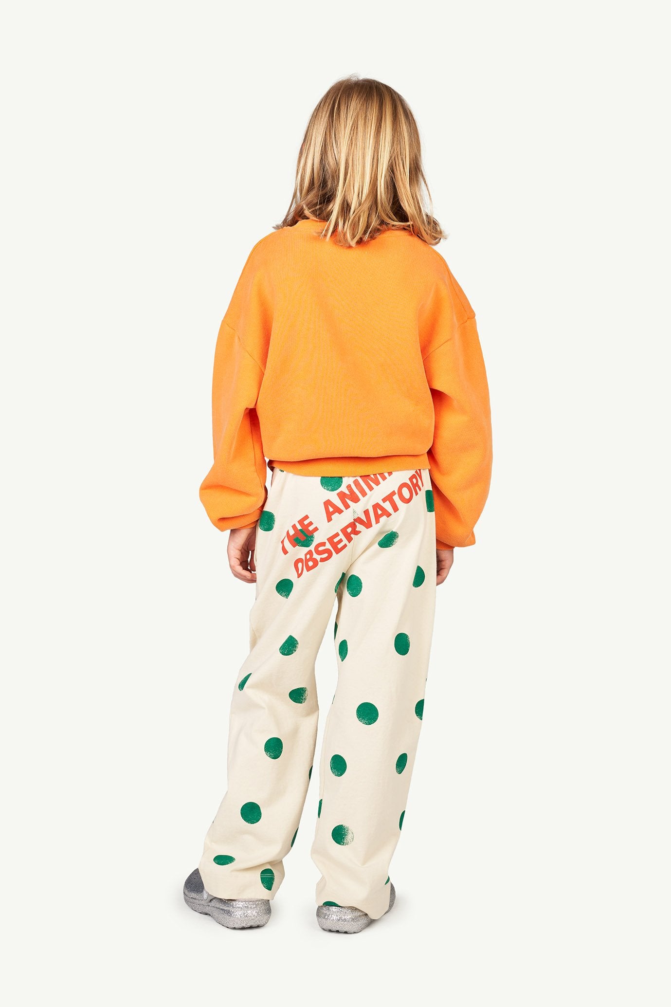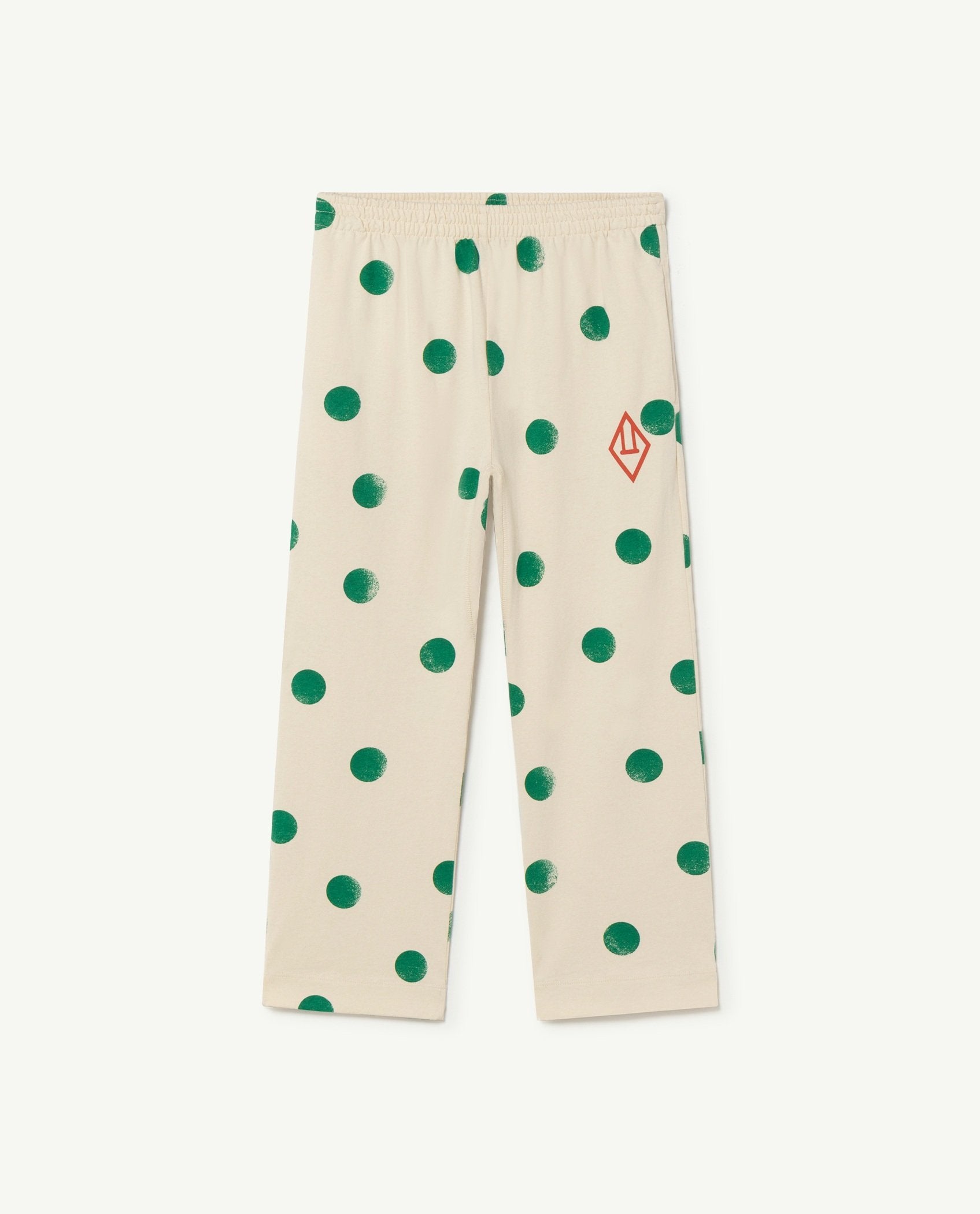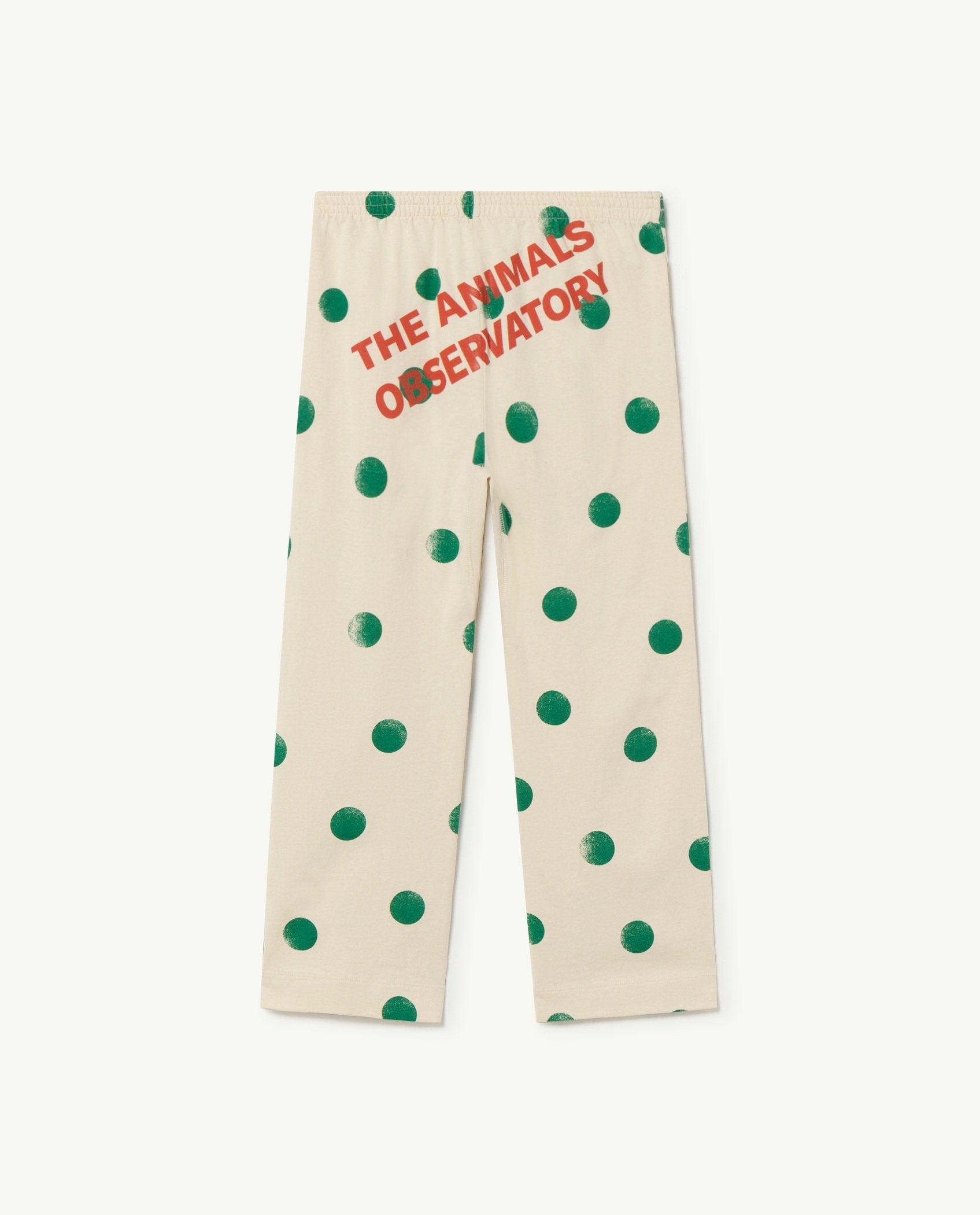 This green dots White Camaleon Kids regular fit Pants are stylish and easy to go around. With The Animals Observatory in red capital letters in the back and the logo in the front. Two vertical pockets are on each side. Only available in our online store. The model's height is 126 cm and is wearing size 8 years.