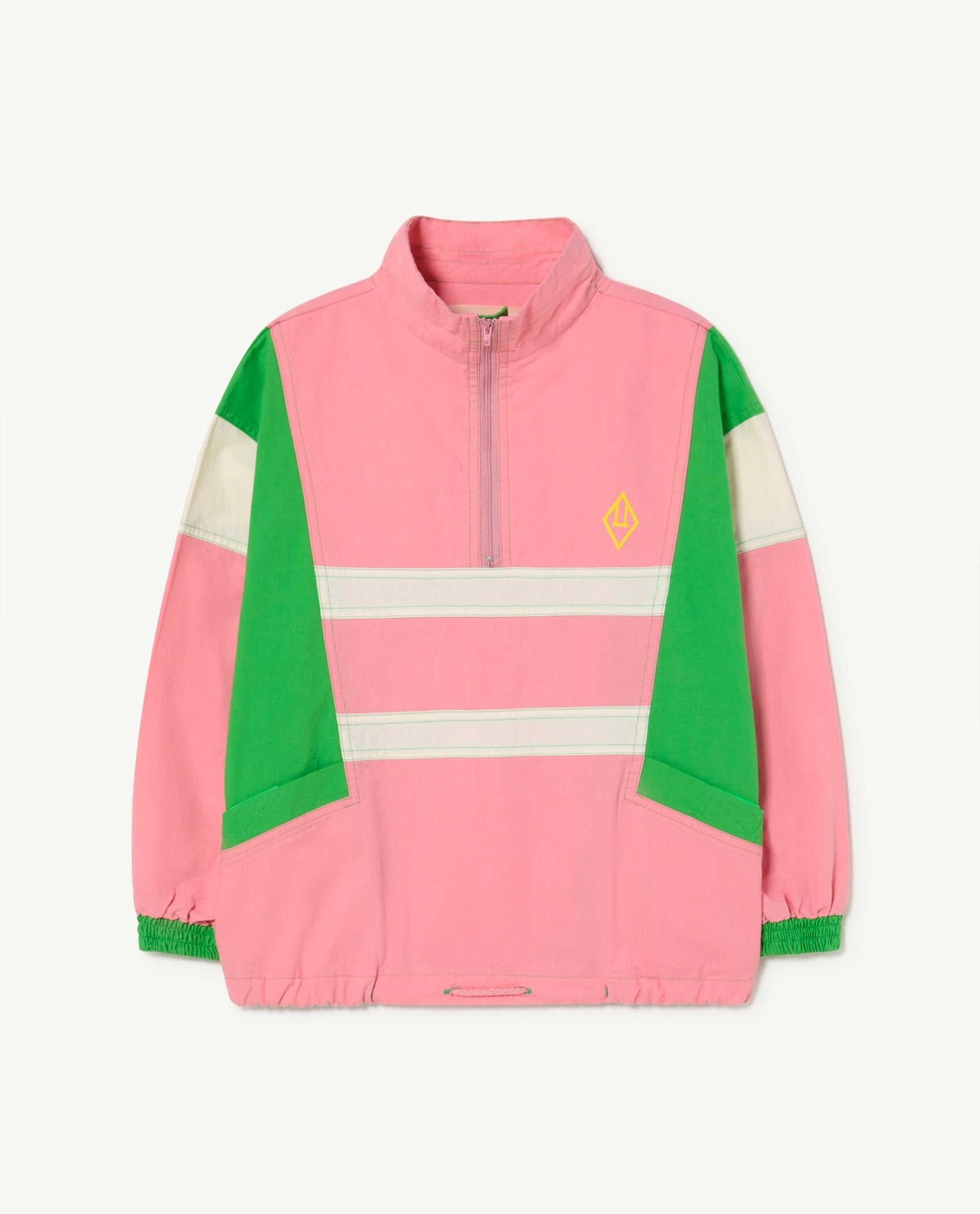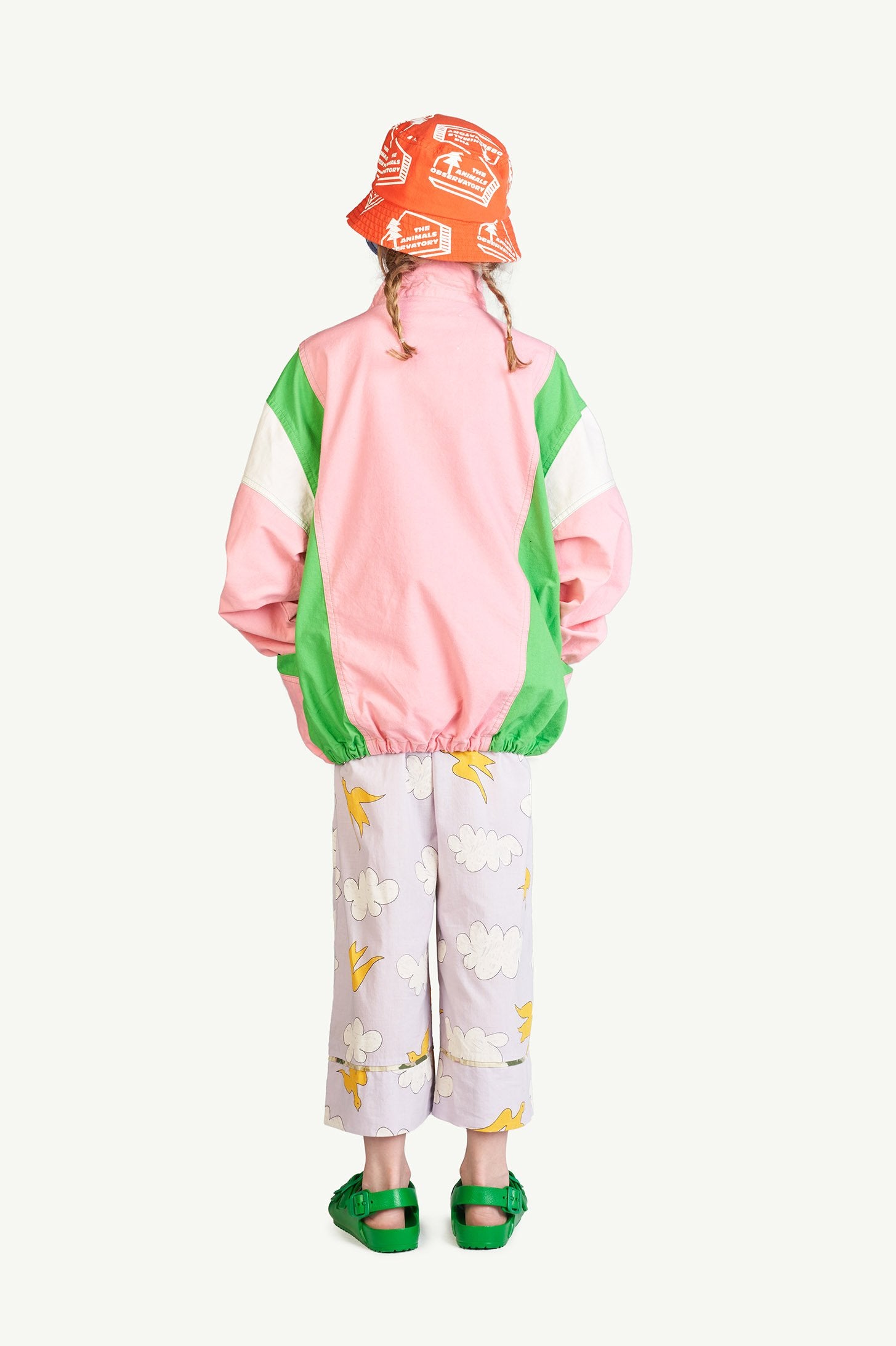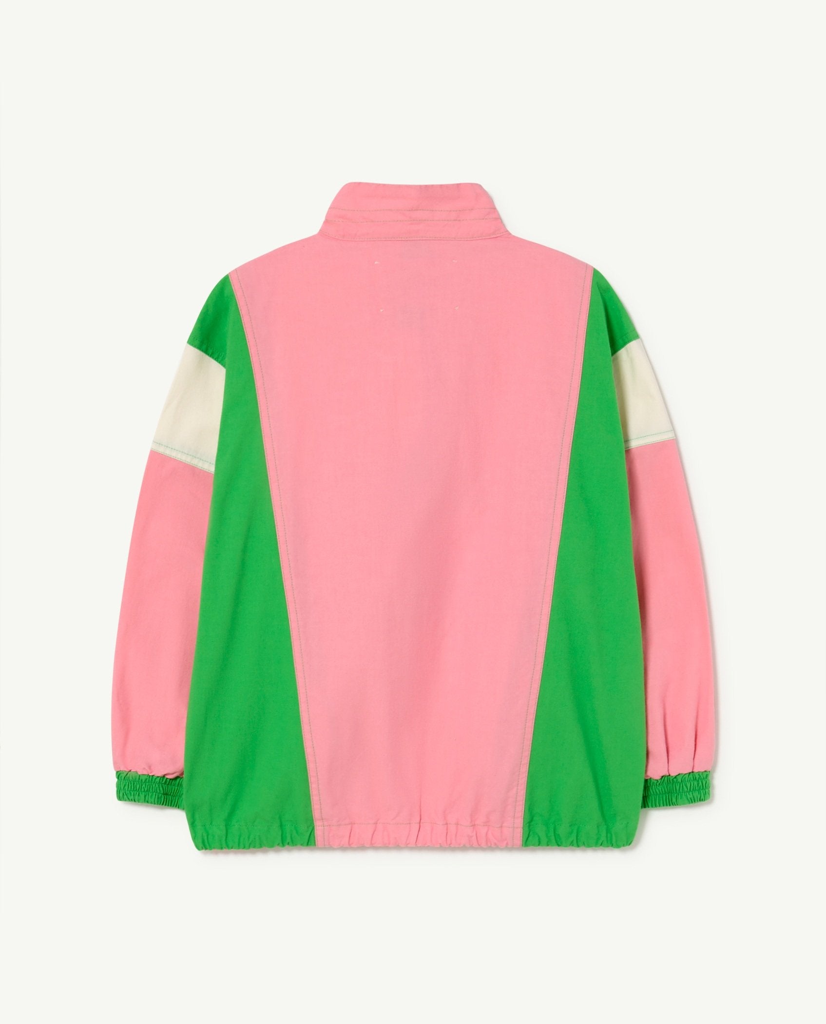 The Pink Carp Jacket is an oversize sportive jacket with a vintage vibe. Featuring a Mao neck and The Animals Observatory logo on the front side. It has an elastic waist and a velcro strap in the pockets. This is the perfect piece to protect your kids from a windy afternoon. The model's height is 132 cm and is wearing size 8 years.