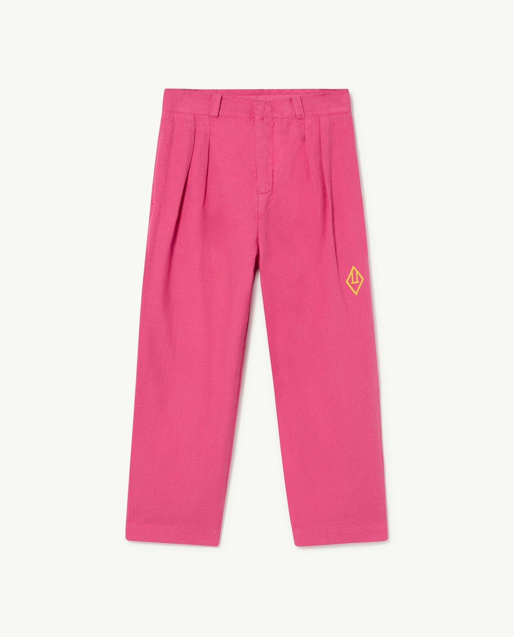 The Pink Colt Pants are a pair of tailored pants with a belt loop and featuring The Animals Observatory logo on the front side. The model's height is 132 cm and is wearing size 8 years.