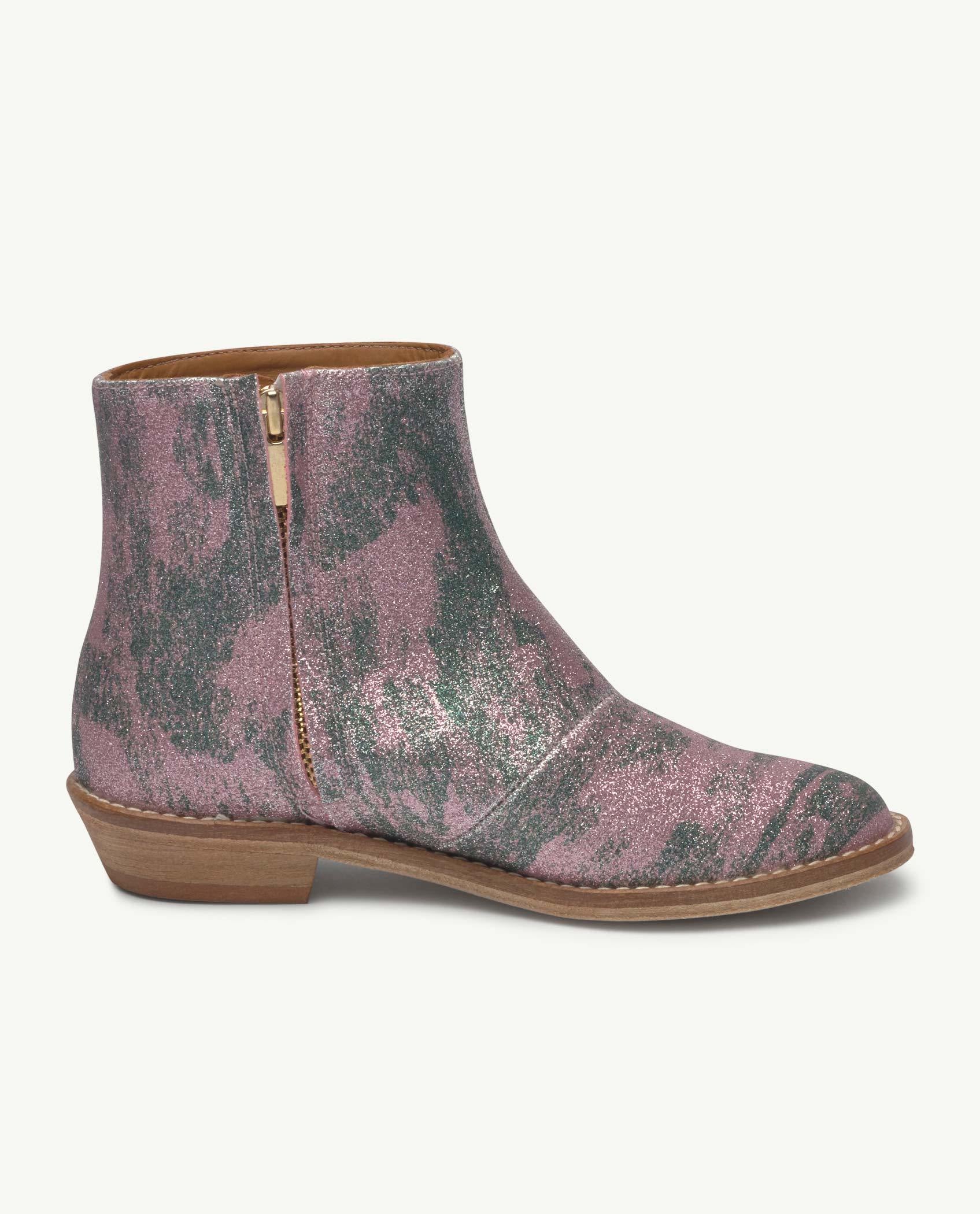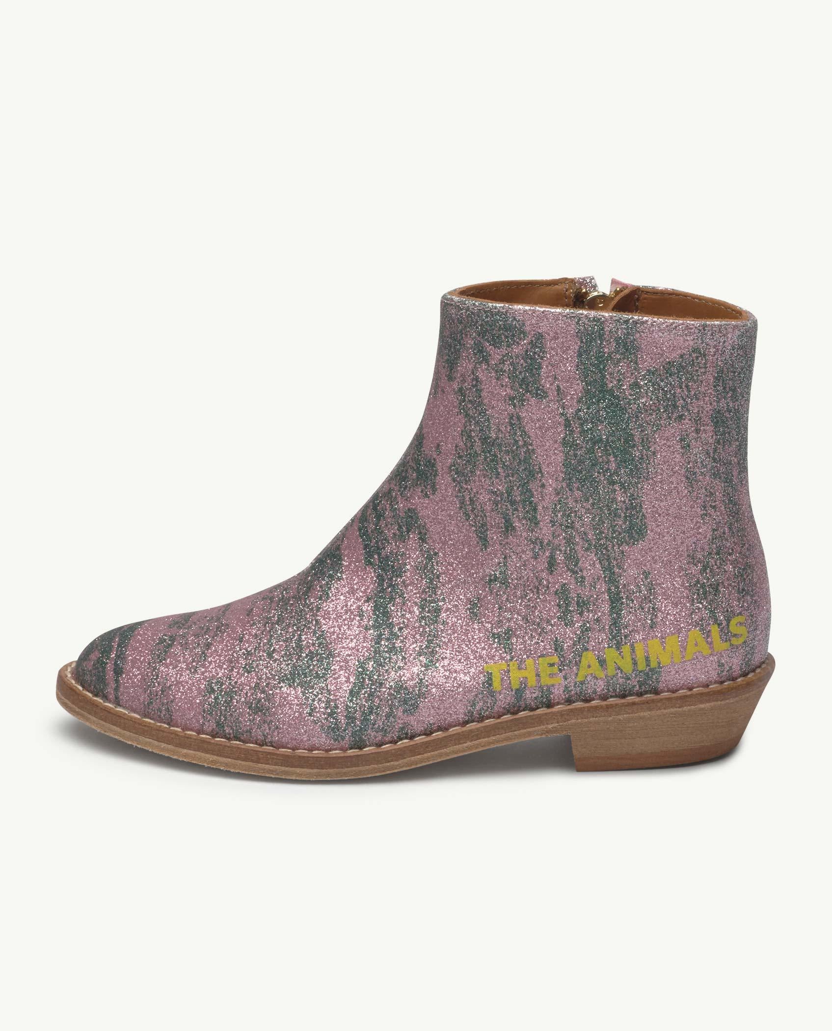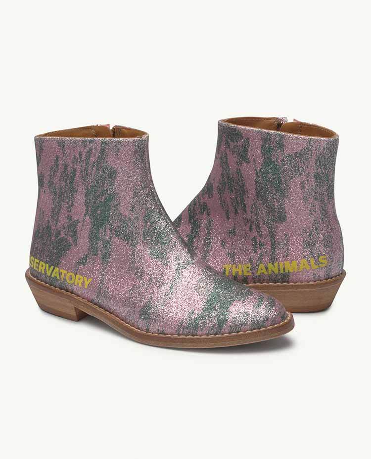 Wow-factor boots with a rounded toe in a faded pink glitter colour with The Animals Observatory logo on the side.