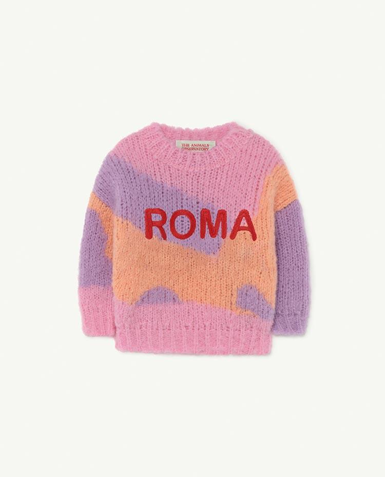 "They can express their individuality in this soft and cosy Pink Roma City Bull Baby Sweater, which features a colourful, arty design and ""Roma"" written across the front."
