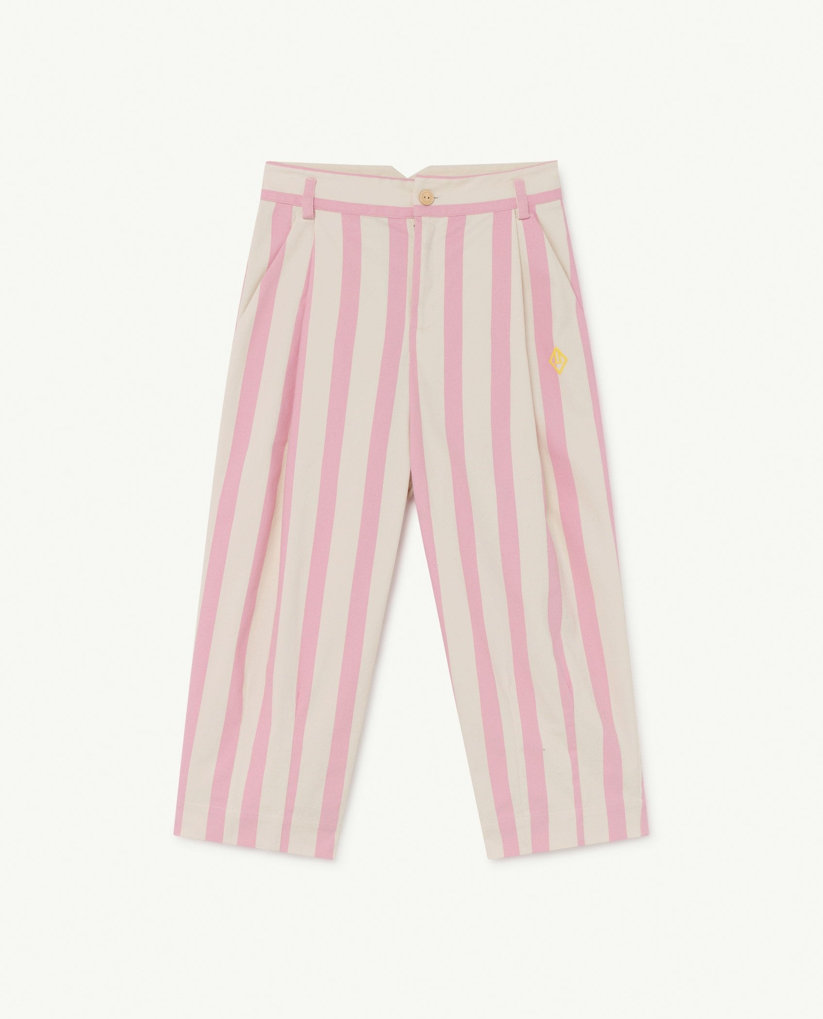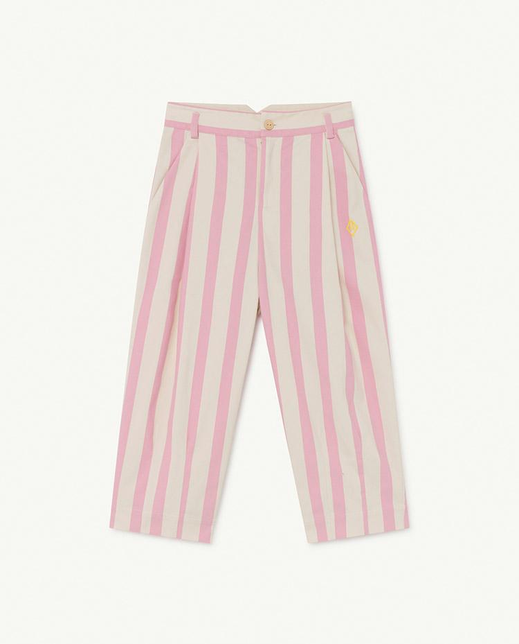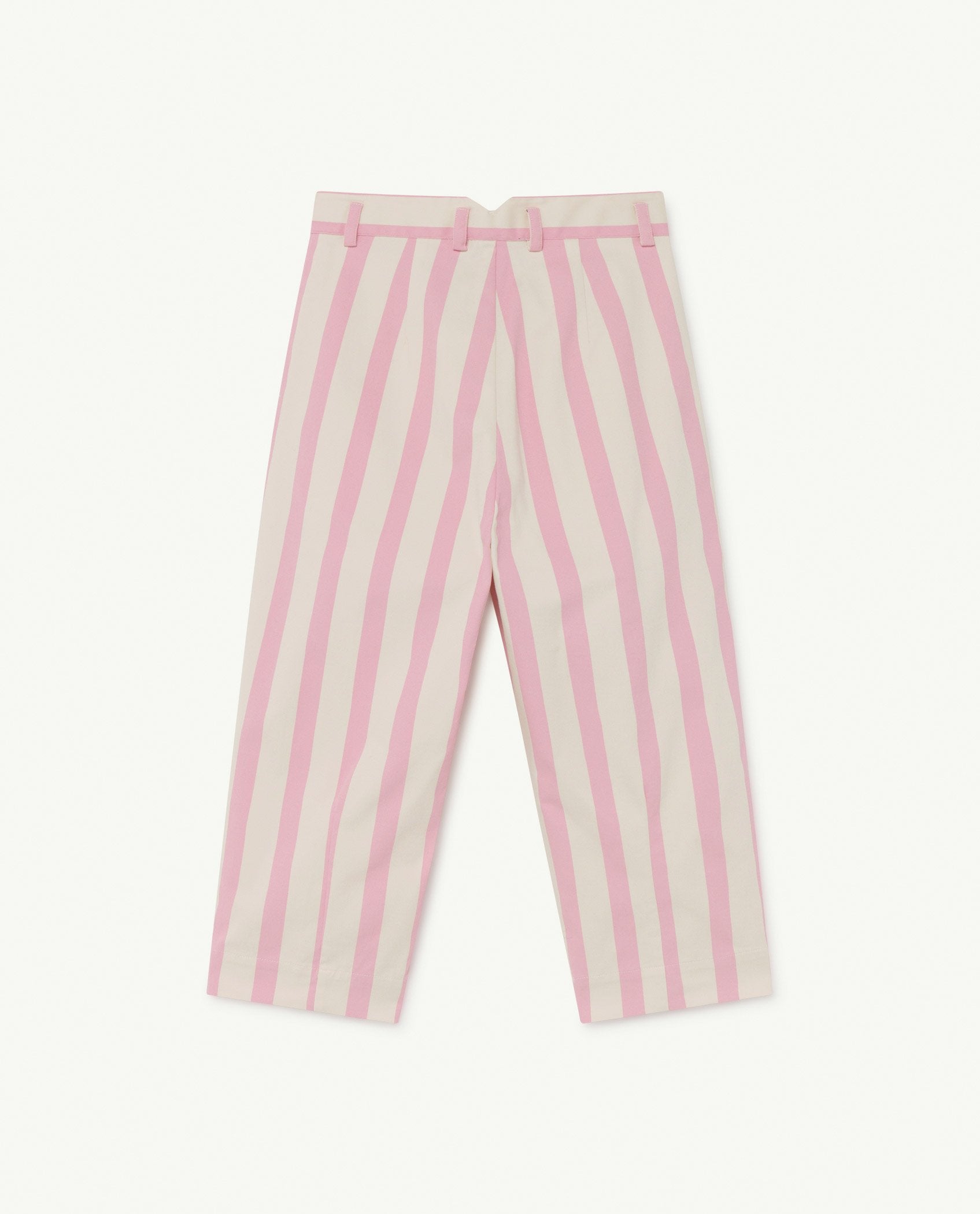 These tailored cotton Pink Stripes Emu Trousers are the ultimate in smart casual, in candy-cane stripe with a button-up waist. Exclusively available on The Animals Observatory online shop.