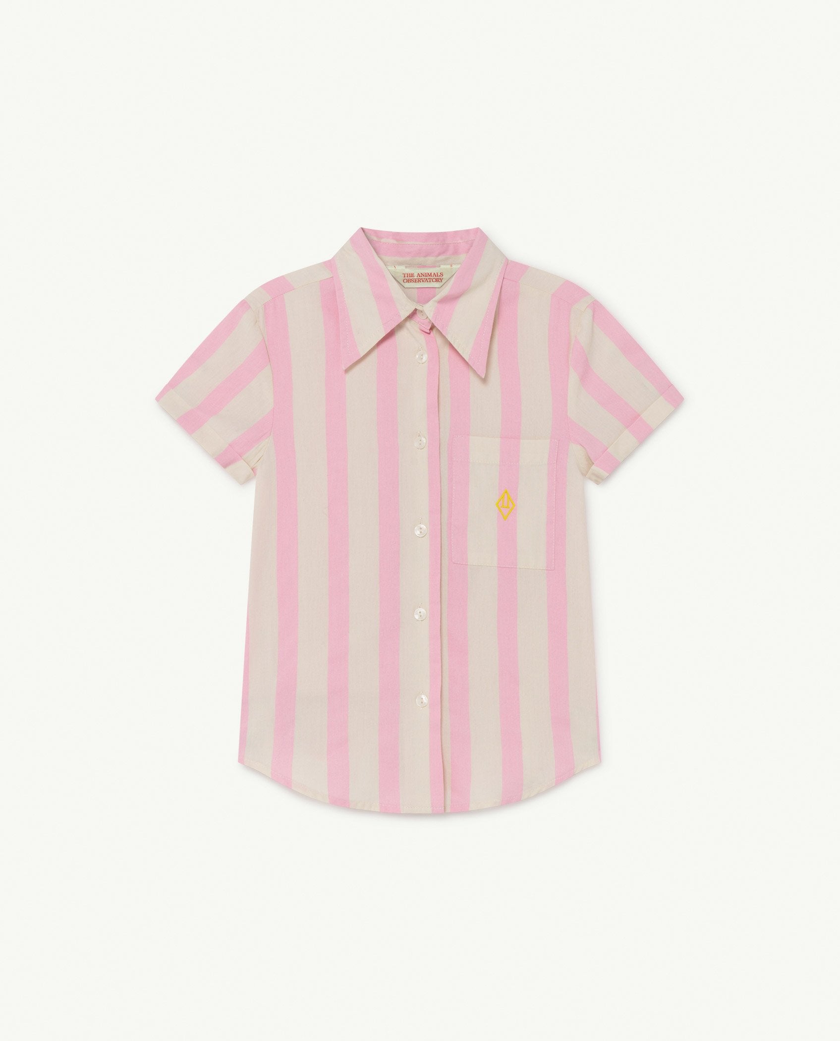 This short-sleeved Pink Stripes Kangaroo Shirt with its sharp collar is perfect for throwing on with jeans, featuring a candy cane stripe pattern and a small pocket with The Animals Observatory logo.