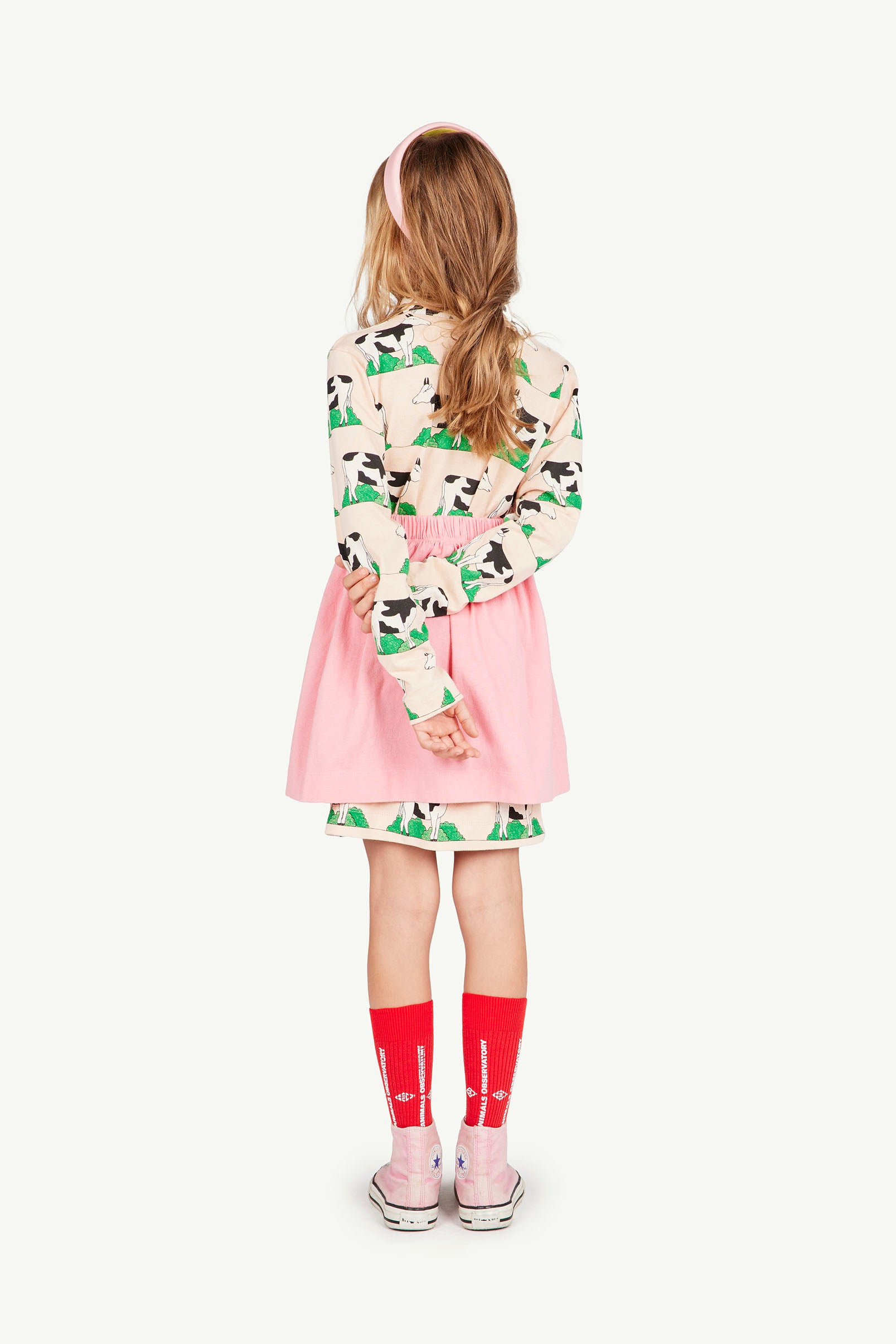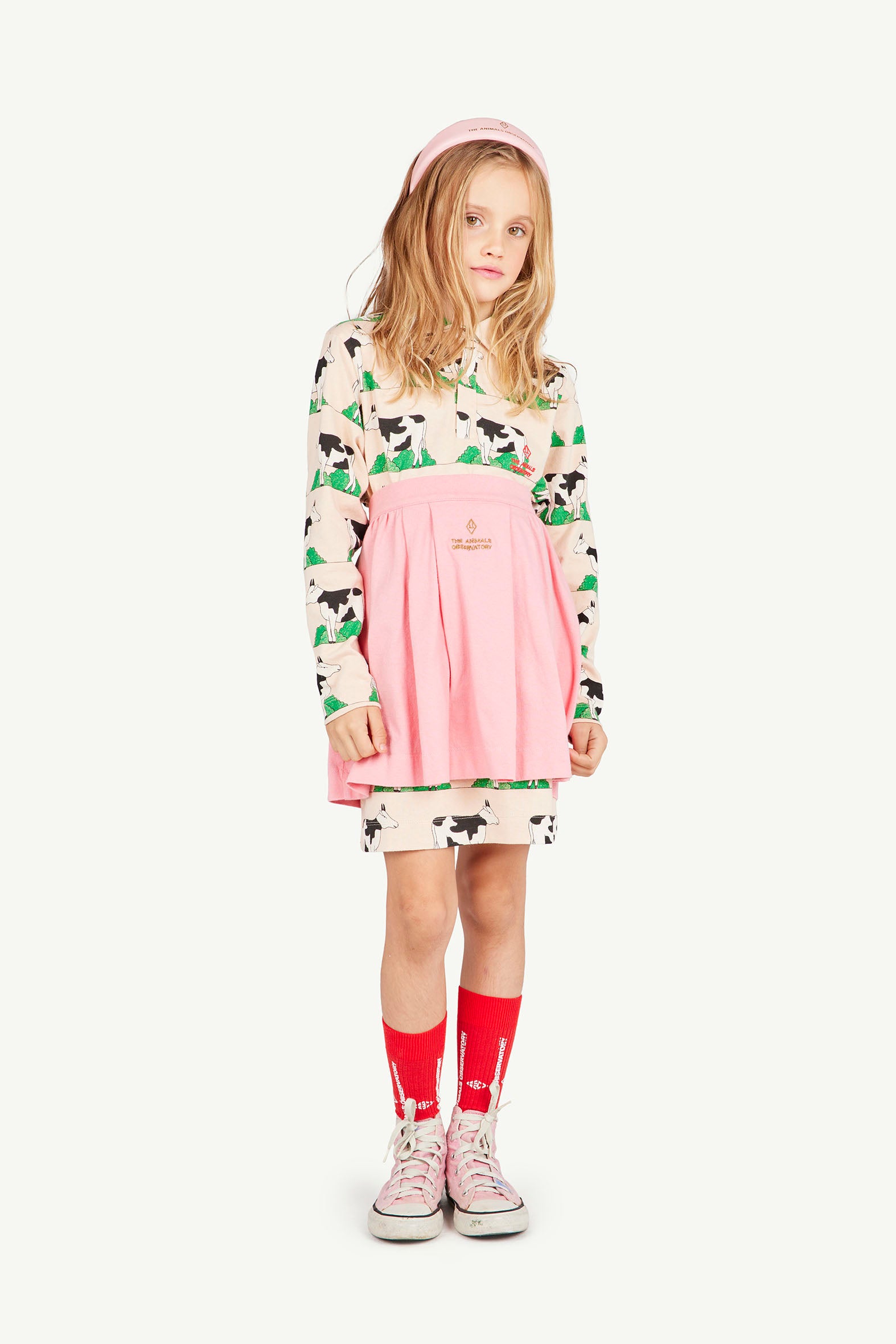 A pink pleated skirt for kids, with a cool skater vibe, featuring The Animals Observatory logo and symbol embroidered.