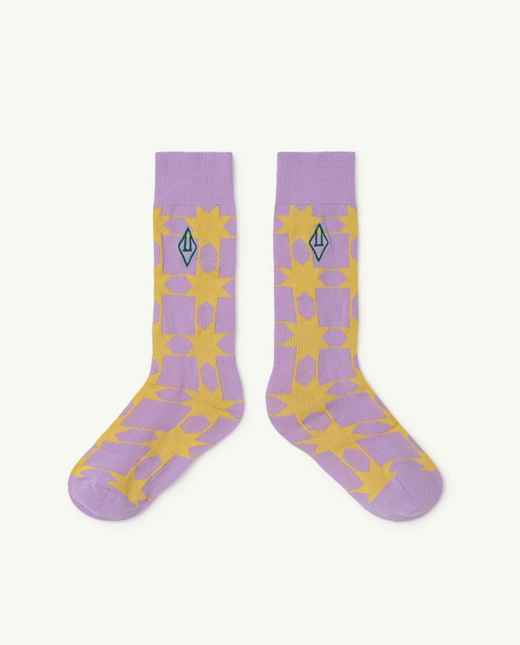 These cosy Purple Logo Hen Socks have a dreamy purple star pattern and feature The Animals Observatory logo.