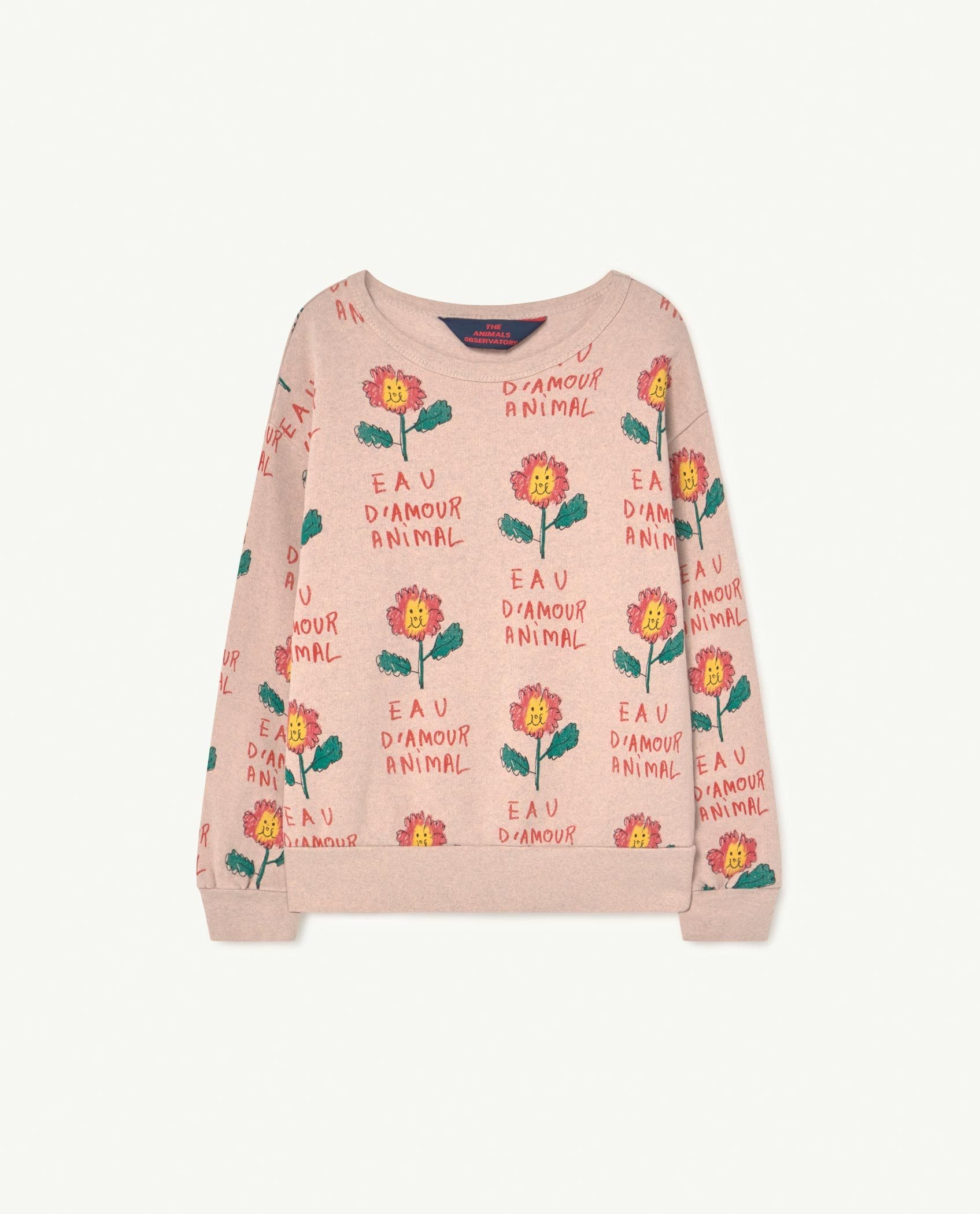 Recycled Soft Pink Flowers Bear Sweatshirt, a comfy and cosy sweatshirt with a repeated flower print and "Le Monde Vegetal" writing on front. 100% cotton (20% recycled cotton, our own re-worked cotton sourced between Spain and Portugal).