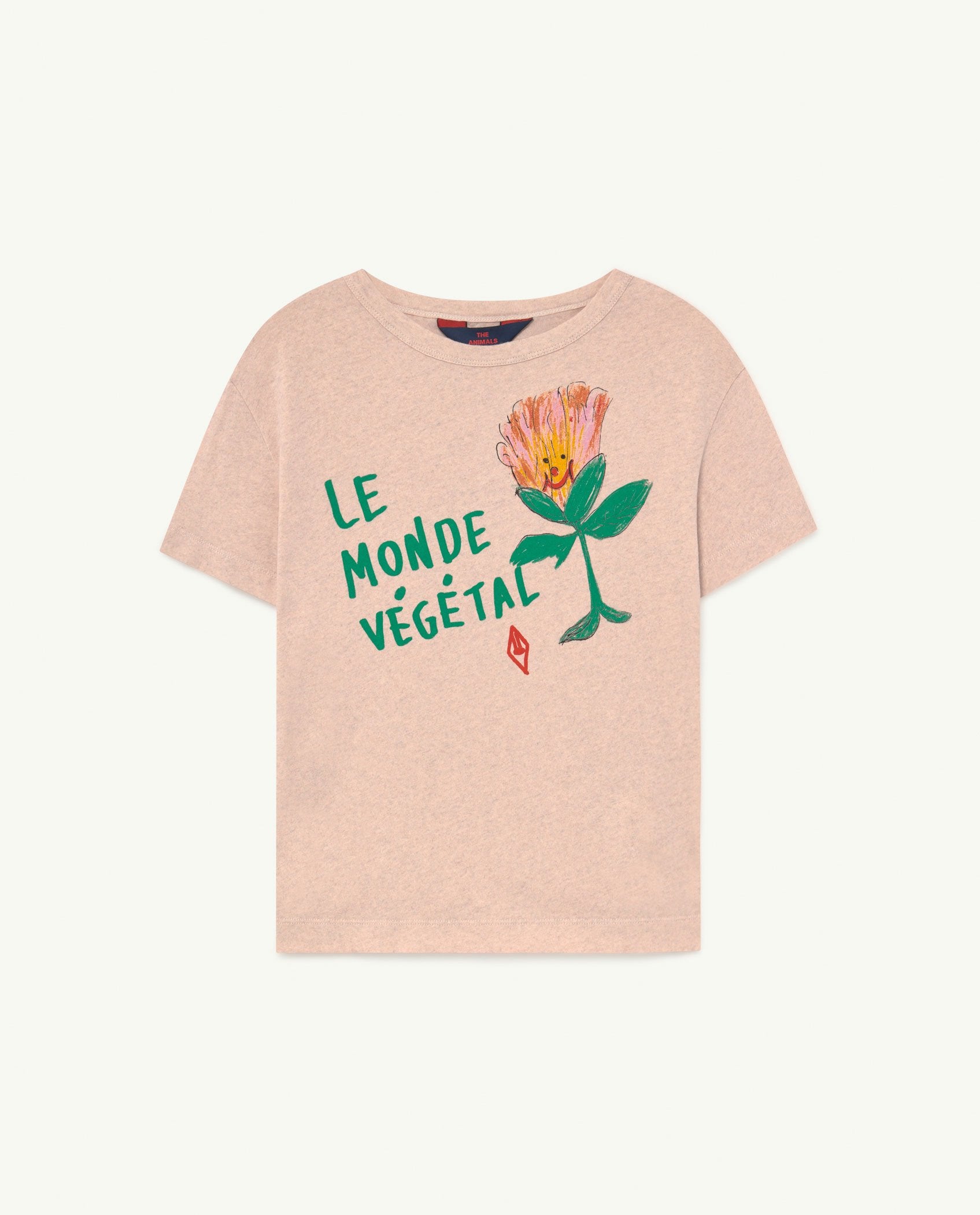 Recycled Soft Pink Le Monde Rooster T-Shirt, a classic design in soft cotton with a single flower print and "Le Monde Vegetal" writing on front. 100% cotton (20% recycled cotton, our own re-worked cotton sourced between Spain and Portugal).