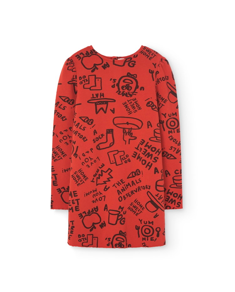 Red dress with black childlike drawings, playful and comfy for festive or everyday wear.