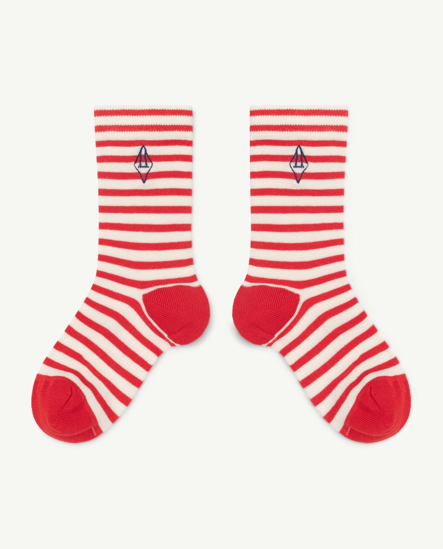 Keep their toes warm in cool red striped socks featuring The Animals Observatory logo.
