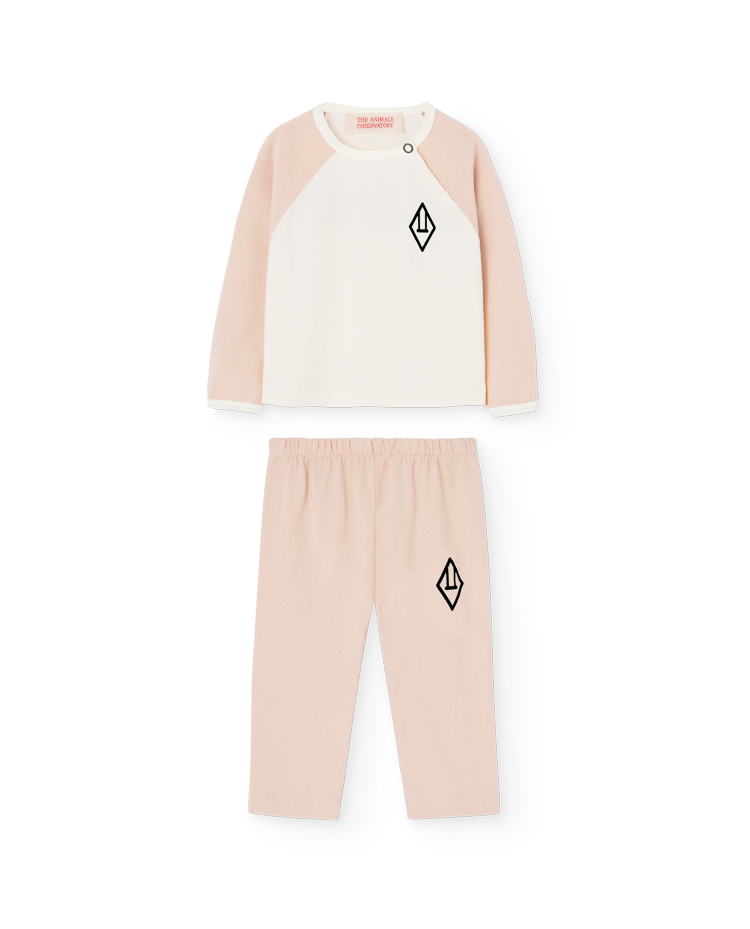 A basic yet elegant white and pink baby two piece featuring a raglan-sleeved T-shirt and a pair of comfy pants.