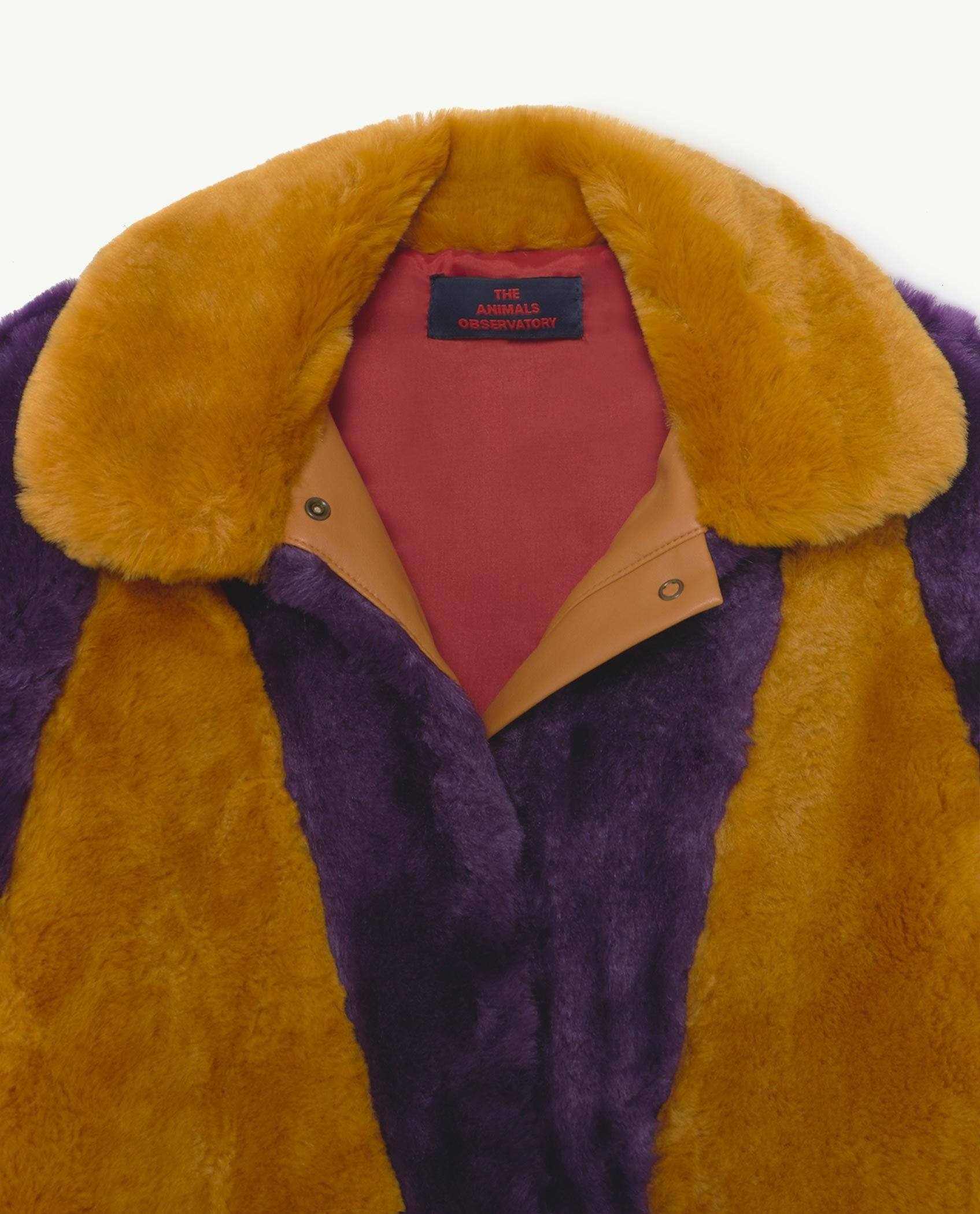 A fur coat with Peter Pan collar in an eye-catching purple and yellow geometric print. Age 14 size available.