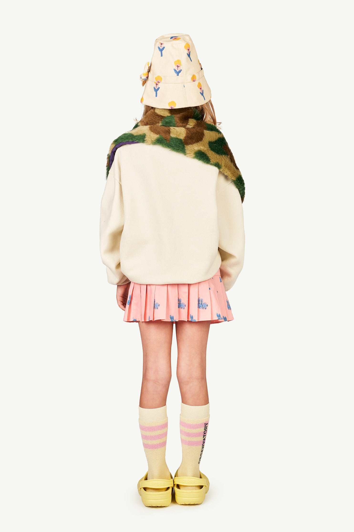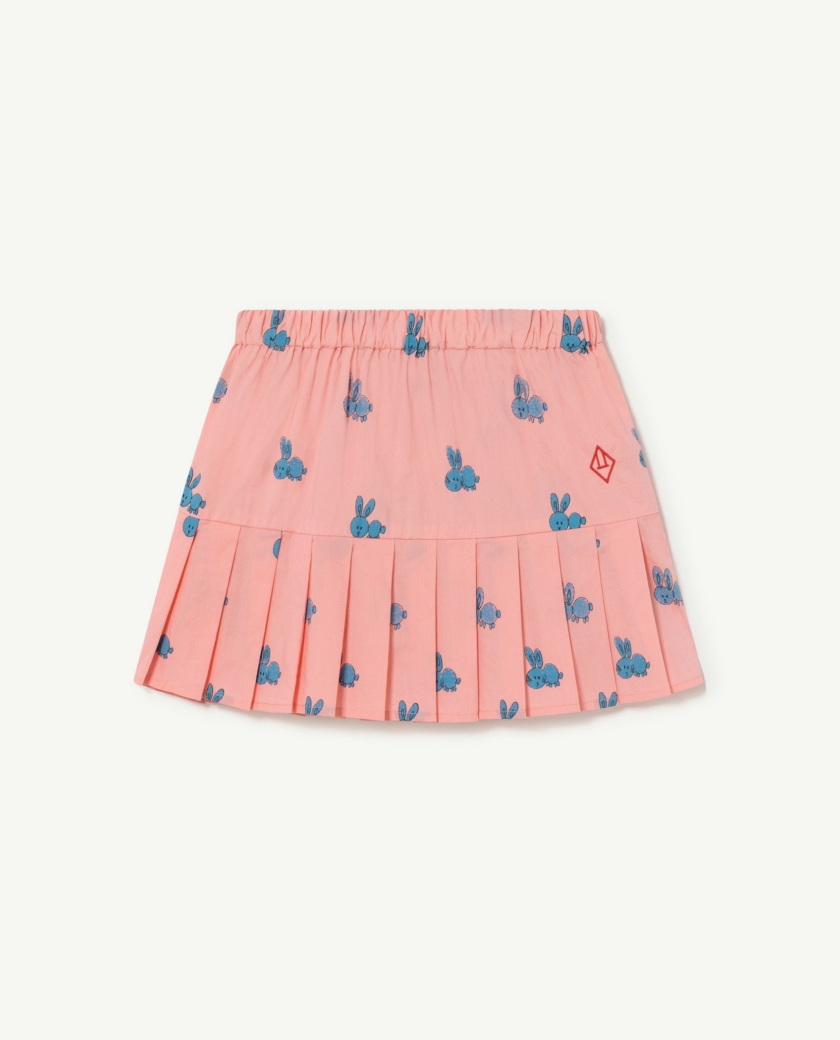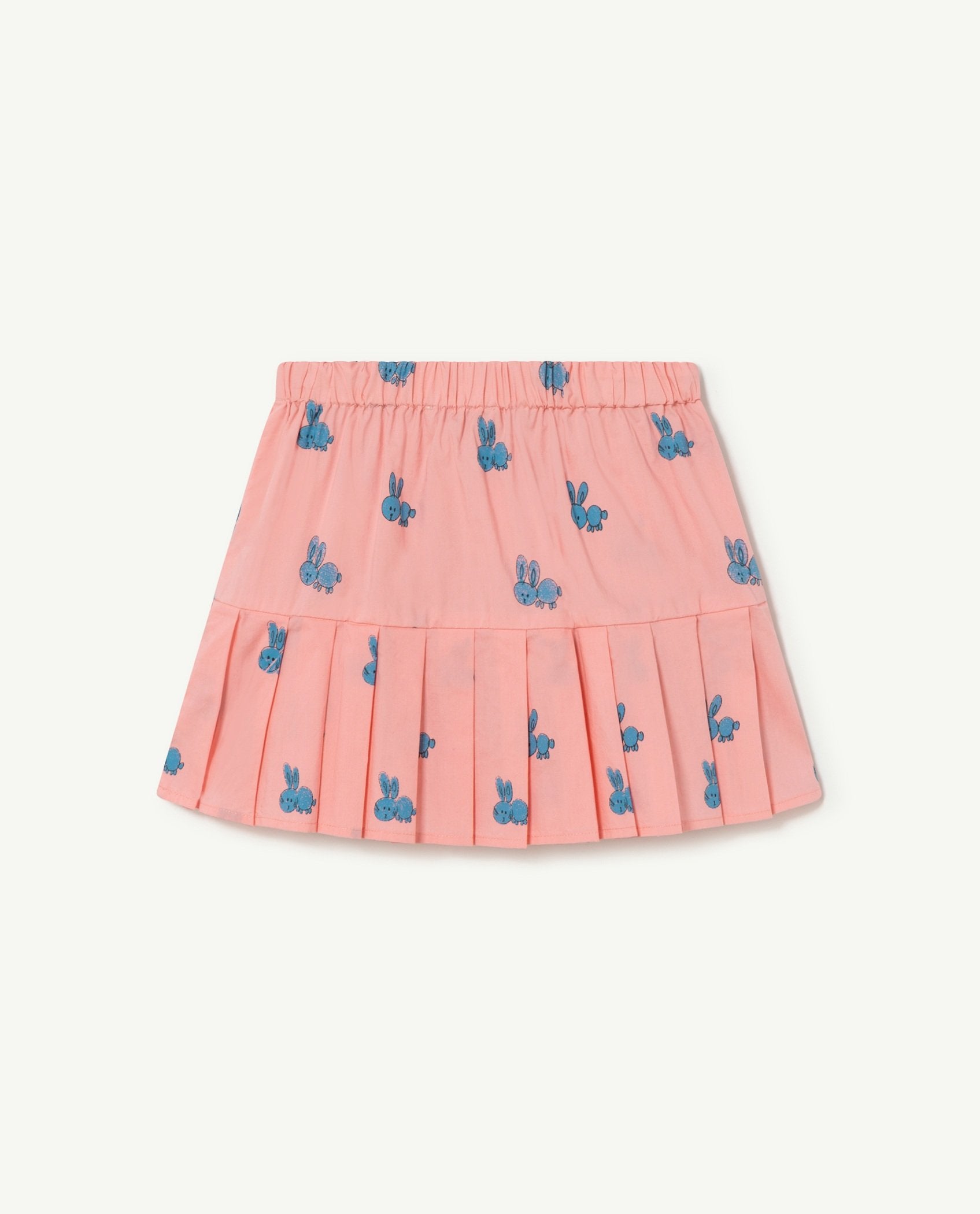 This Pink Bird Kids regular fit Skirt has blue rabbits all over. It is above-the-knee length and has The Animals Observatory red logo on the front side and an elastic waist rib. The model's height is 130 cm and is wearing size 8 years.