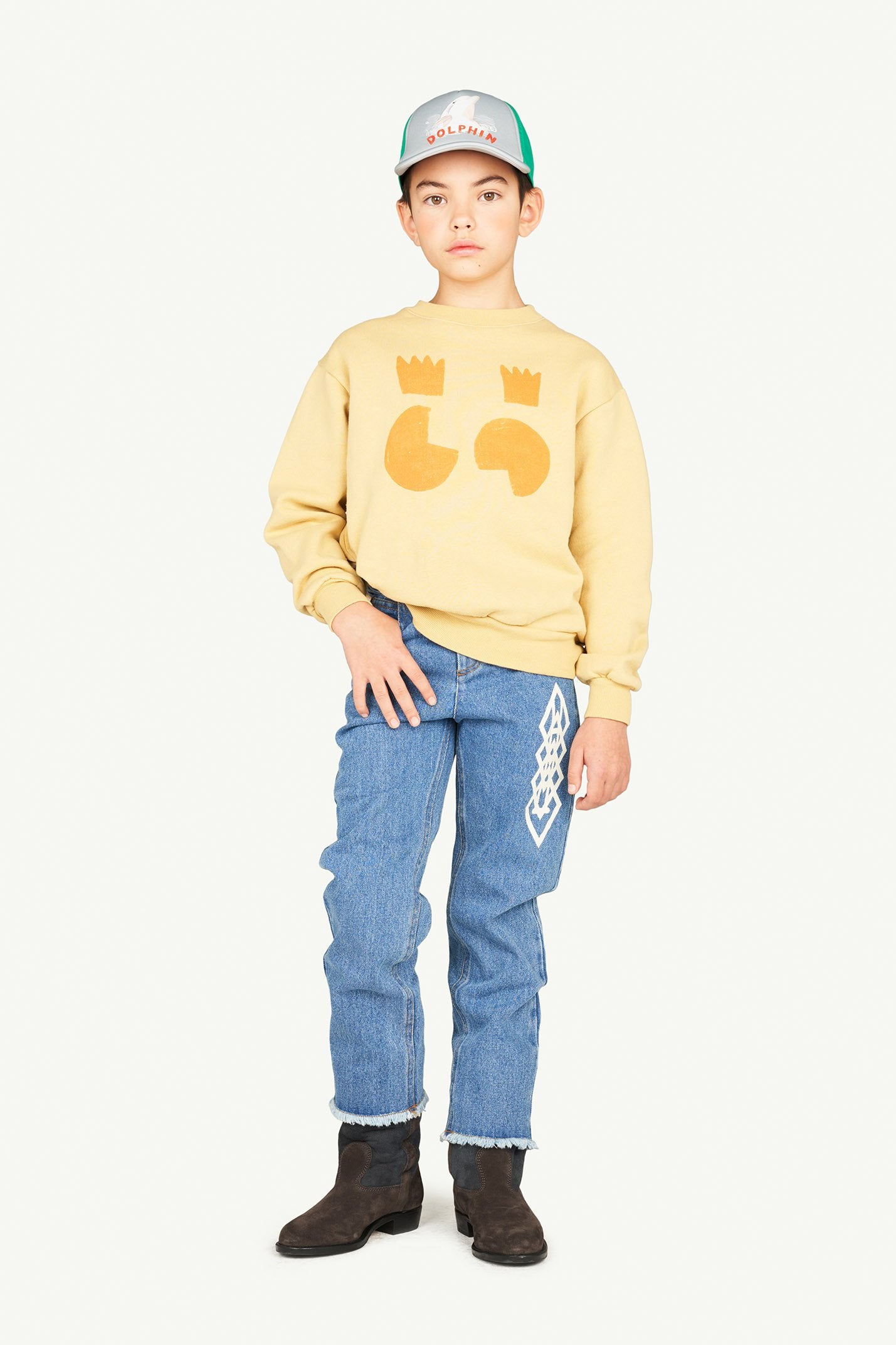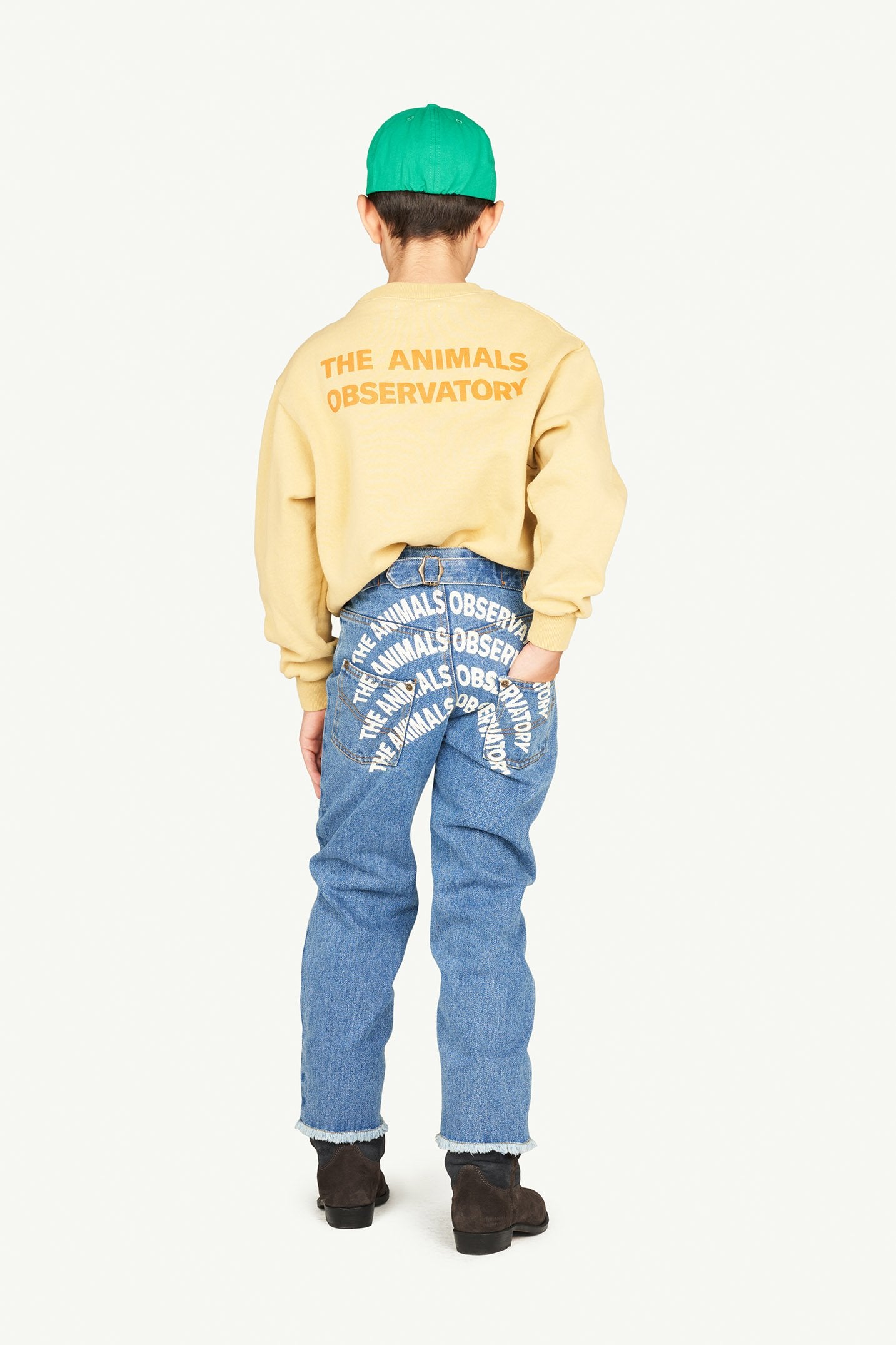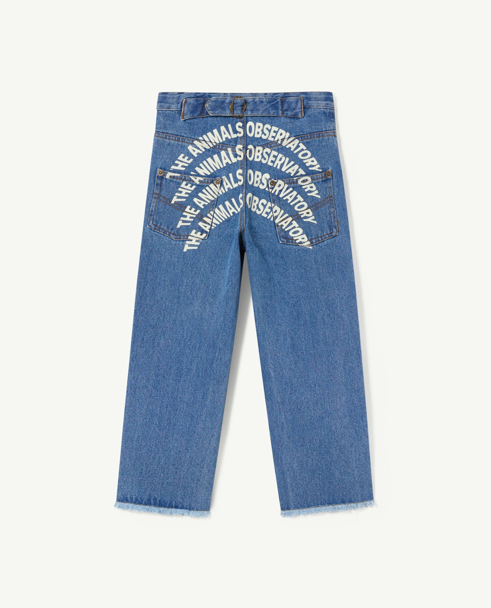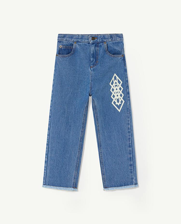 "The Soft Blue Ant Jeans are made in a regular fit as well as 100% cotton made. They also feature a cool tribal version of The Animals Observatory logo on the front, and the text ""The Animals"" on the back. The model's height is 134 cm and is wearing size 8 years."