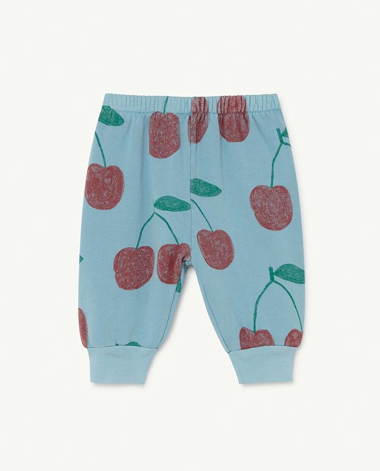 Loose fitting and so comfortable, they'll never be out of these blue Soft Blue Cherries Dromedary Baby Trousers featuring a red cherry print.