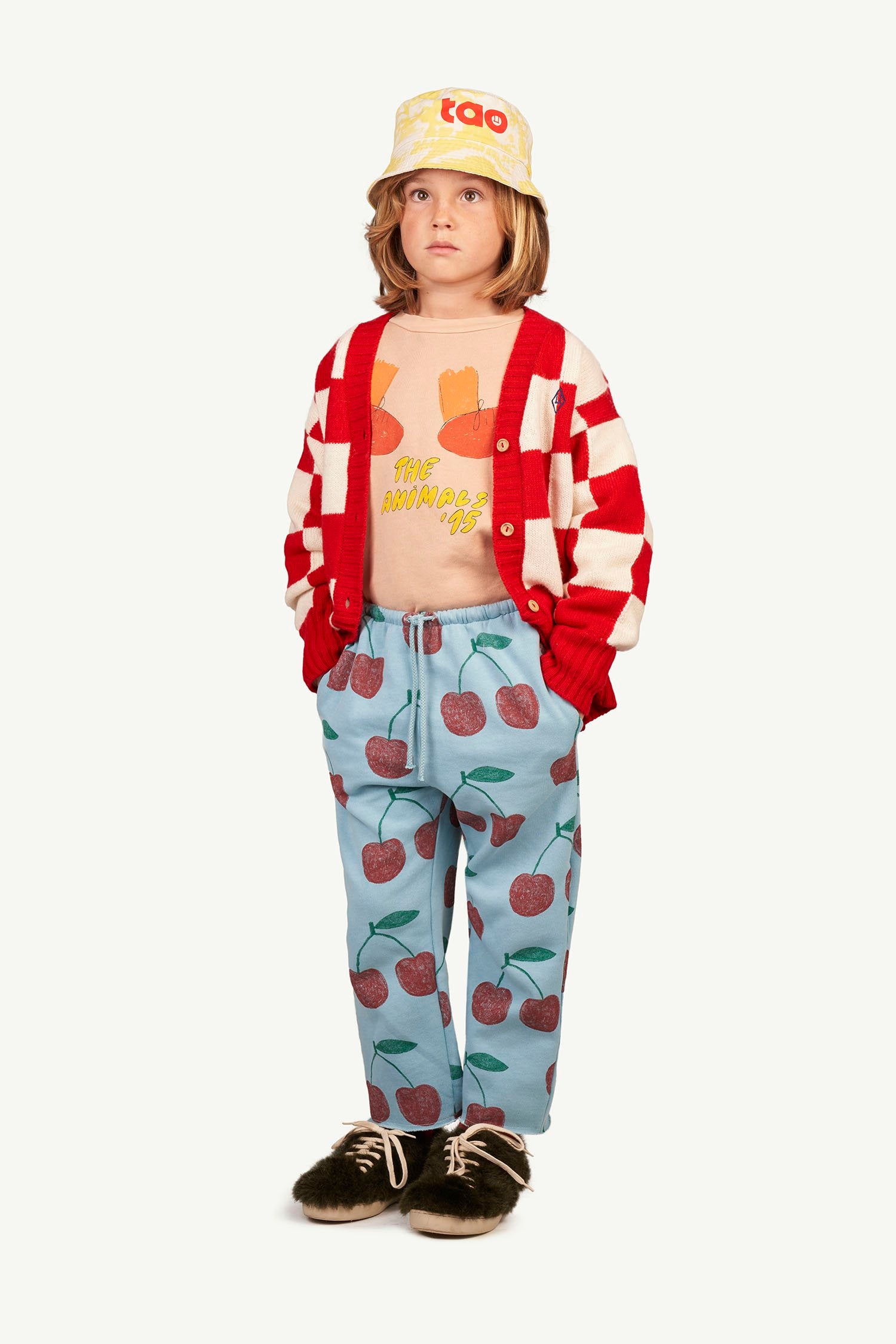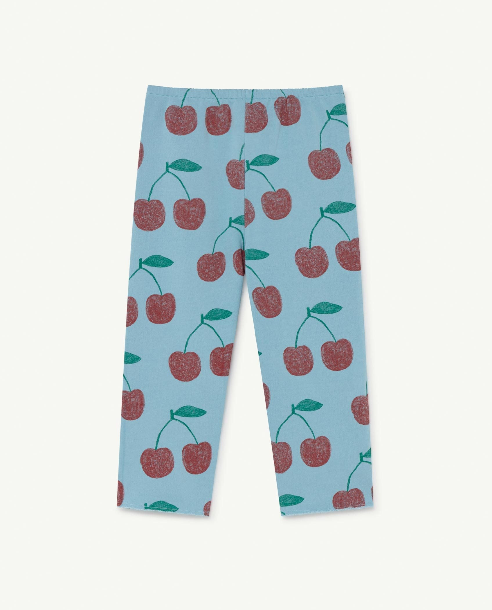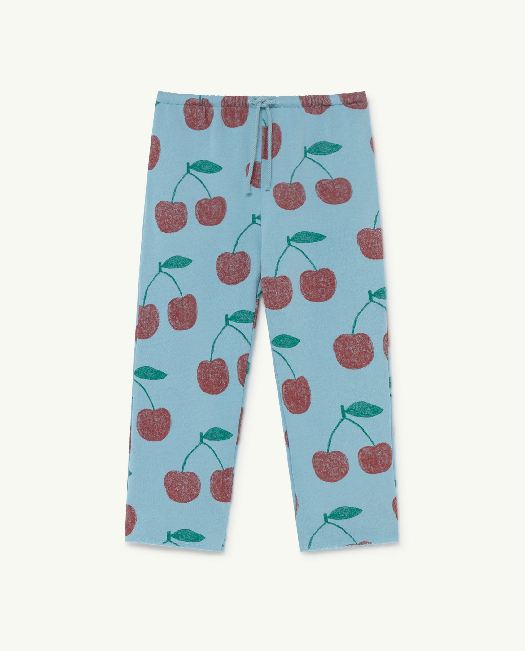 They'll love wearing these comfy drawstring Soft Blue Cherries Horse Trousers, in bright blue with a retro red cherry pattern.