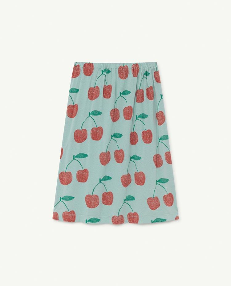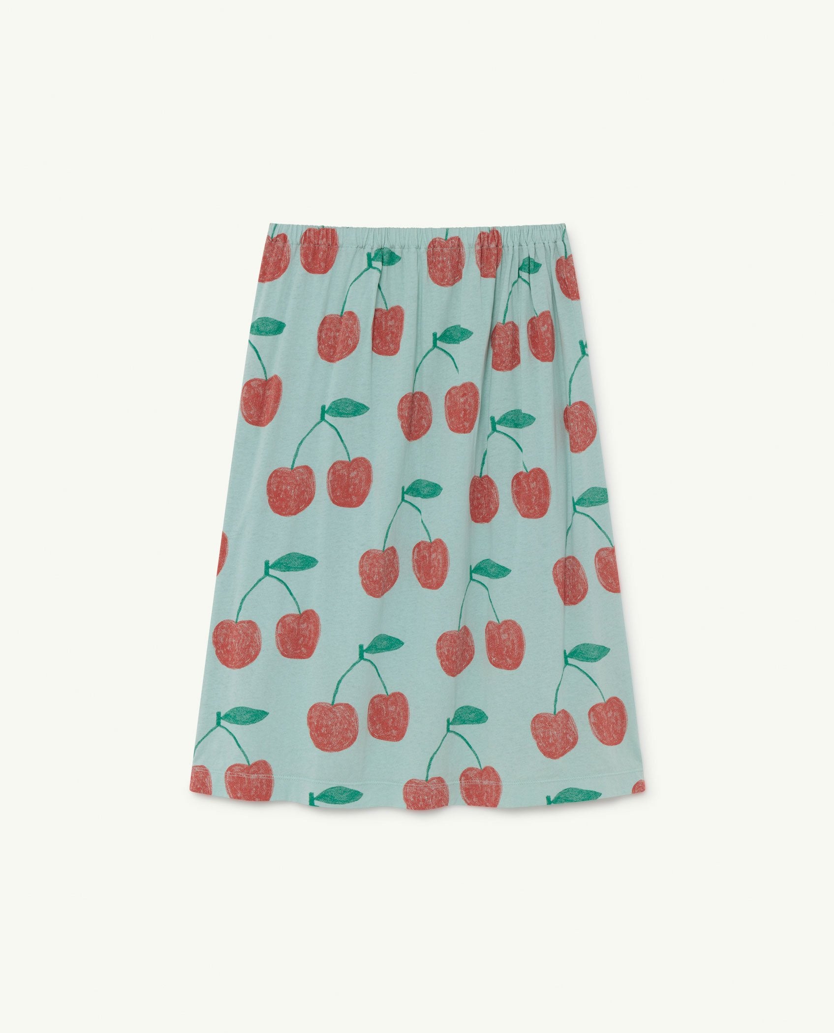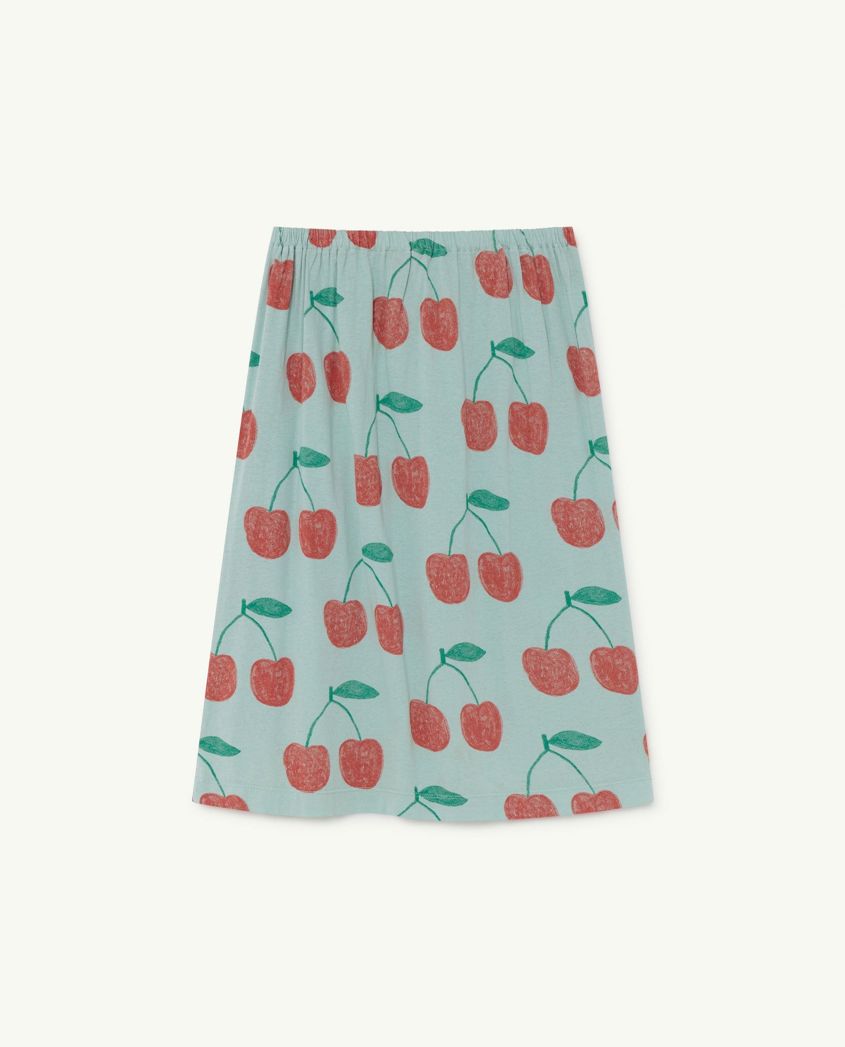 Long and loose, they'll love wearing this cotton Soft Blue Cherries Ladybug Skirt in bright blue with a retro red cherry pattern.