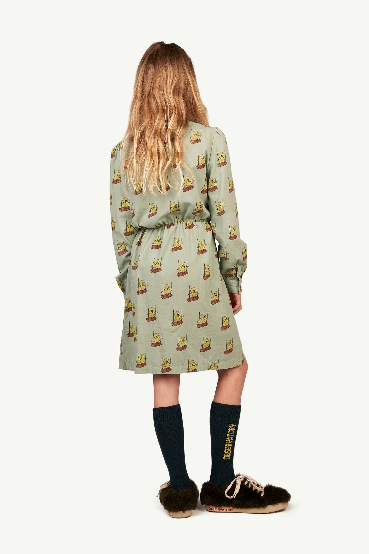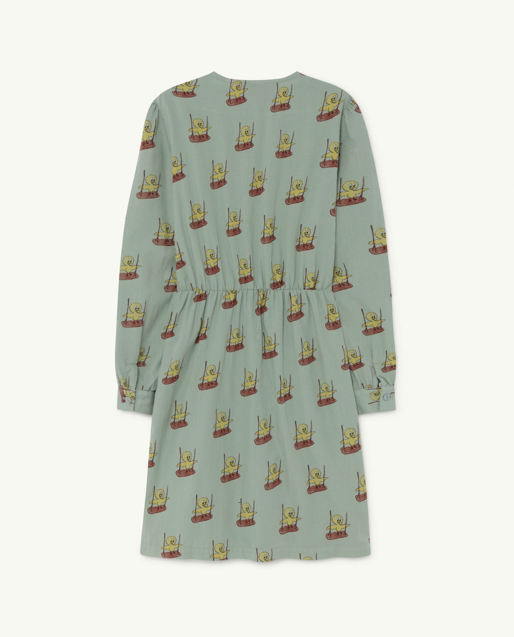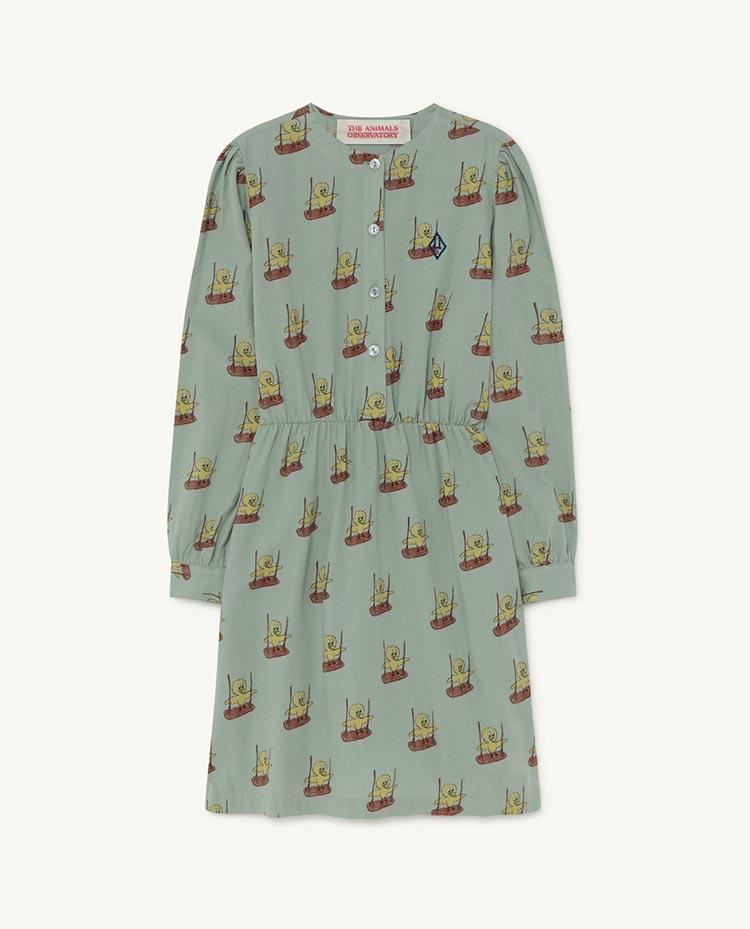 This long-sleeved, button-up Soft Green Birds Weasel Dress is so easy to wear. Featuring a unique bird print and The Animals Observatory logo.