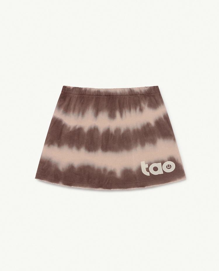"This Soft Pink Logo Dove Skirt has a retro vibe, featuring a dreamy pink and brown tie-dye pattern and the ""tao"" motif in white."