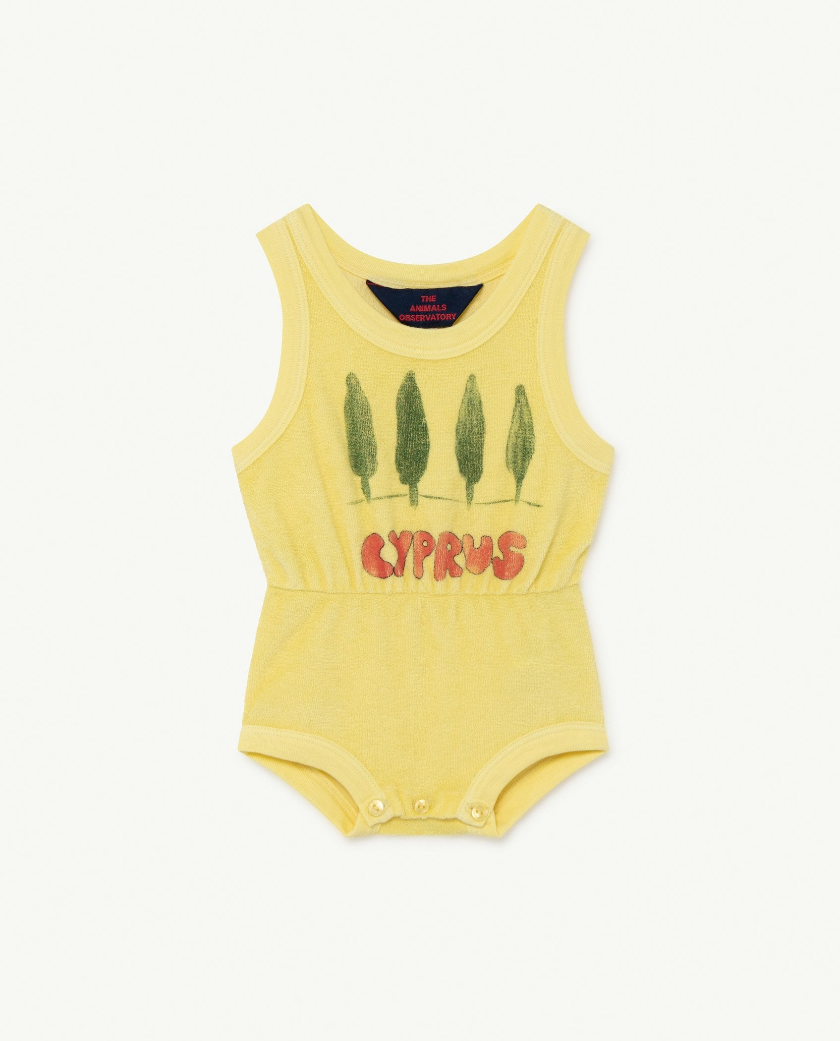 This 100% cotton body has a retro feel, in sunny yellow with a Cyprus motif.