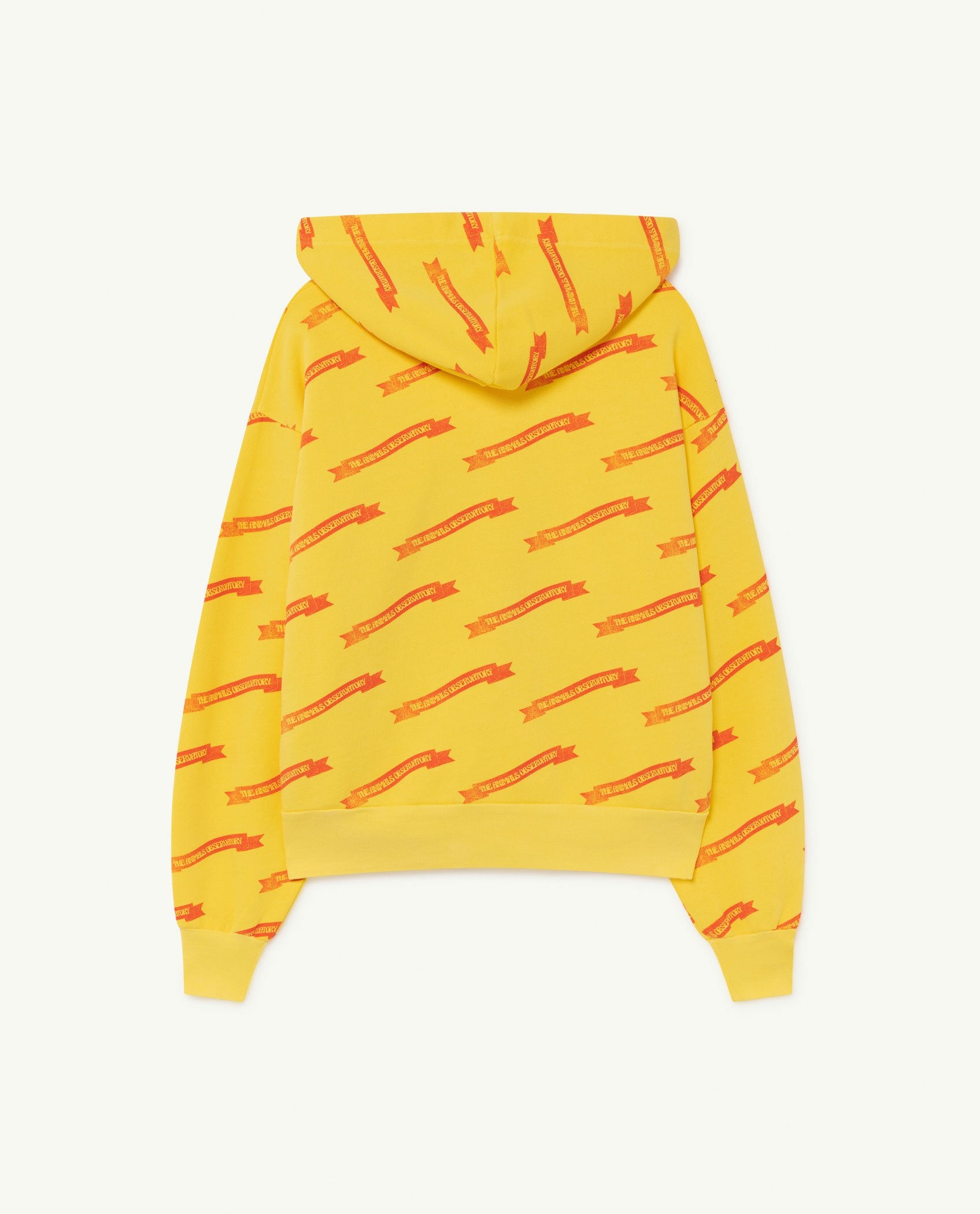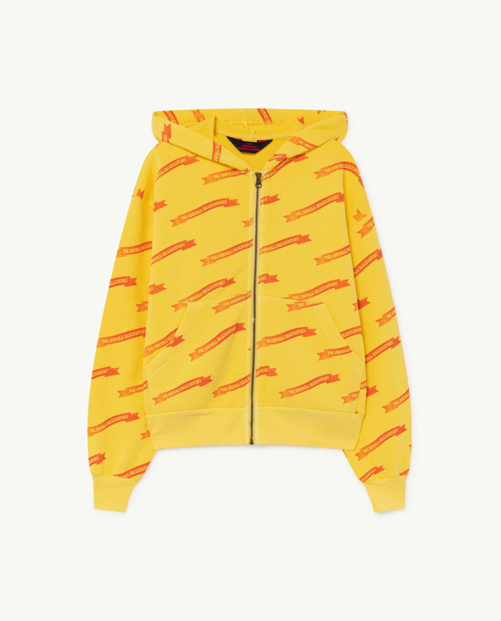 A hooded zip-up sweatshirt with a seriously sporty vibe in soft yellow with a ribbon print.