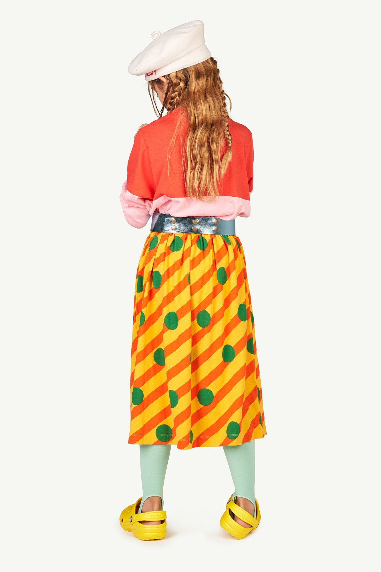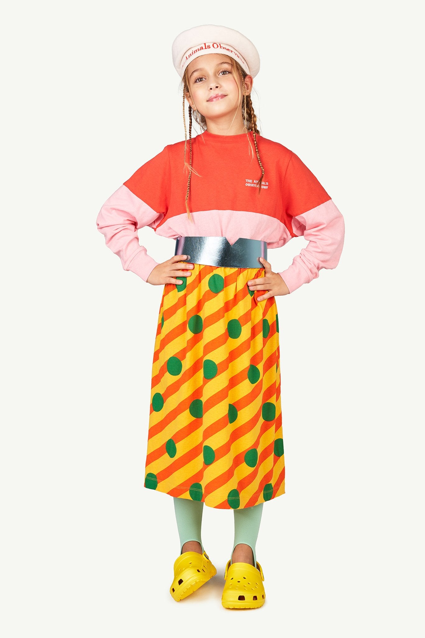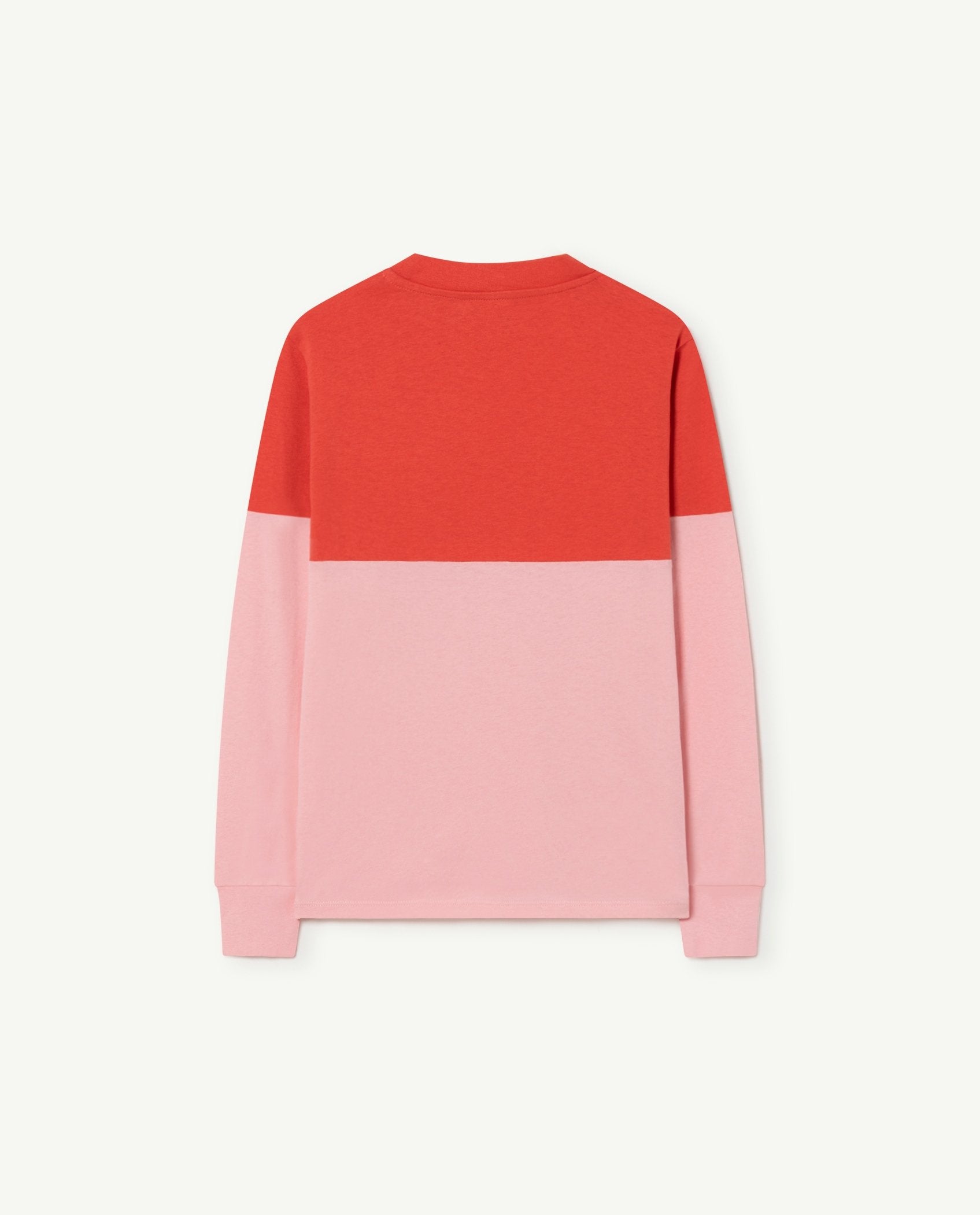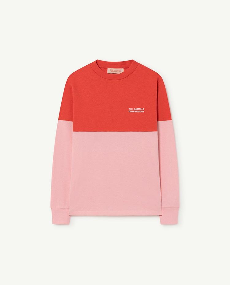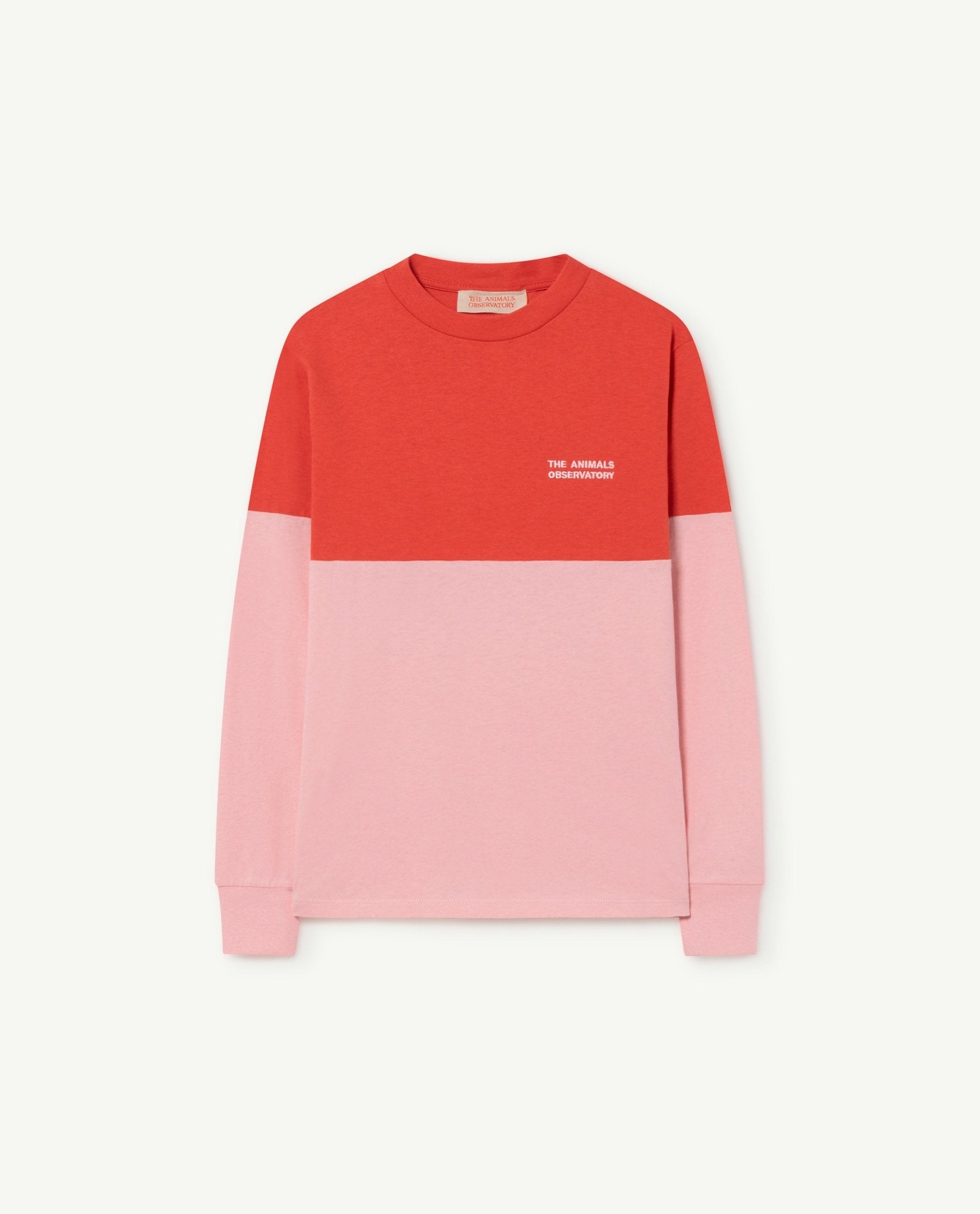 This long sleeves Pink Bicolor Dog Kids regular fit T-Shirt has a red chest side contrasted with a lighter pink in the rest of the piece. It is 100% cotton made and has elastic cuffs. The Animals Observatory capital letters are in the upper-right side. The model's height is 130 cm and is wearing size 8 years.