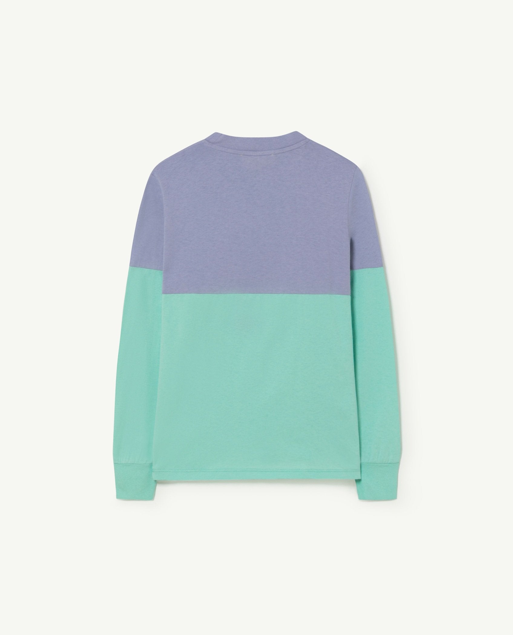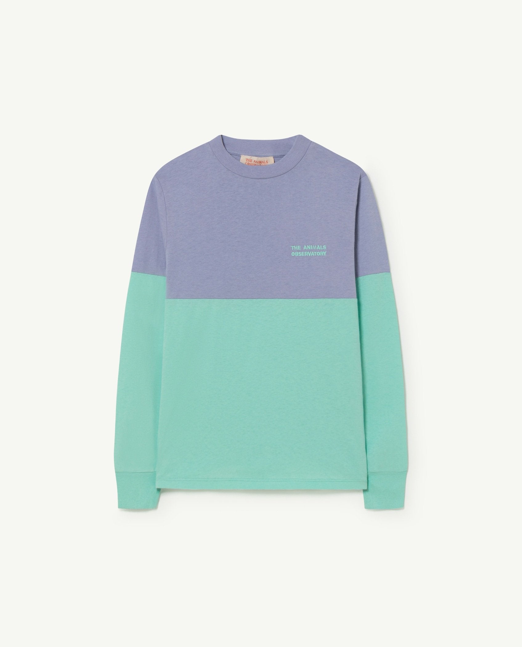 This long sleeves Turquoise Bicolor Dog Kids regular fit T-Shirt has a blue chest side contrasted with a lighter turquoise in the rest of the piece. It is 100% cotton made and has elastic cuffs. The Animals Observatory capital letters are in the upper-right side.