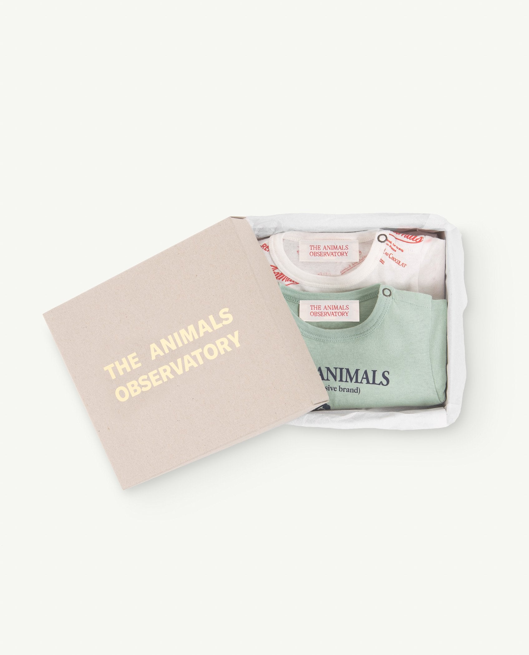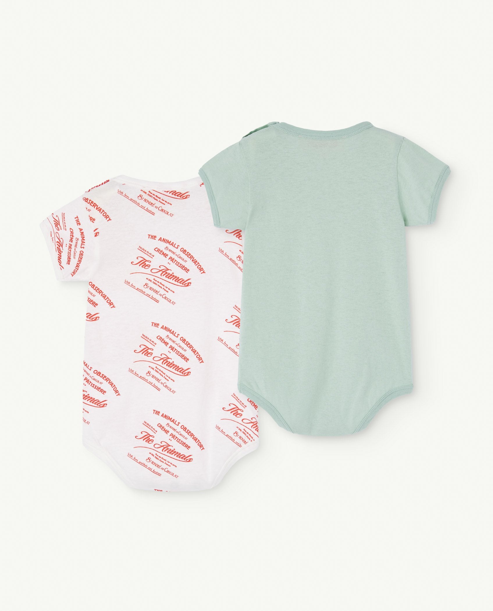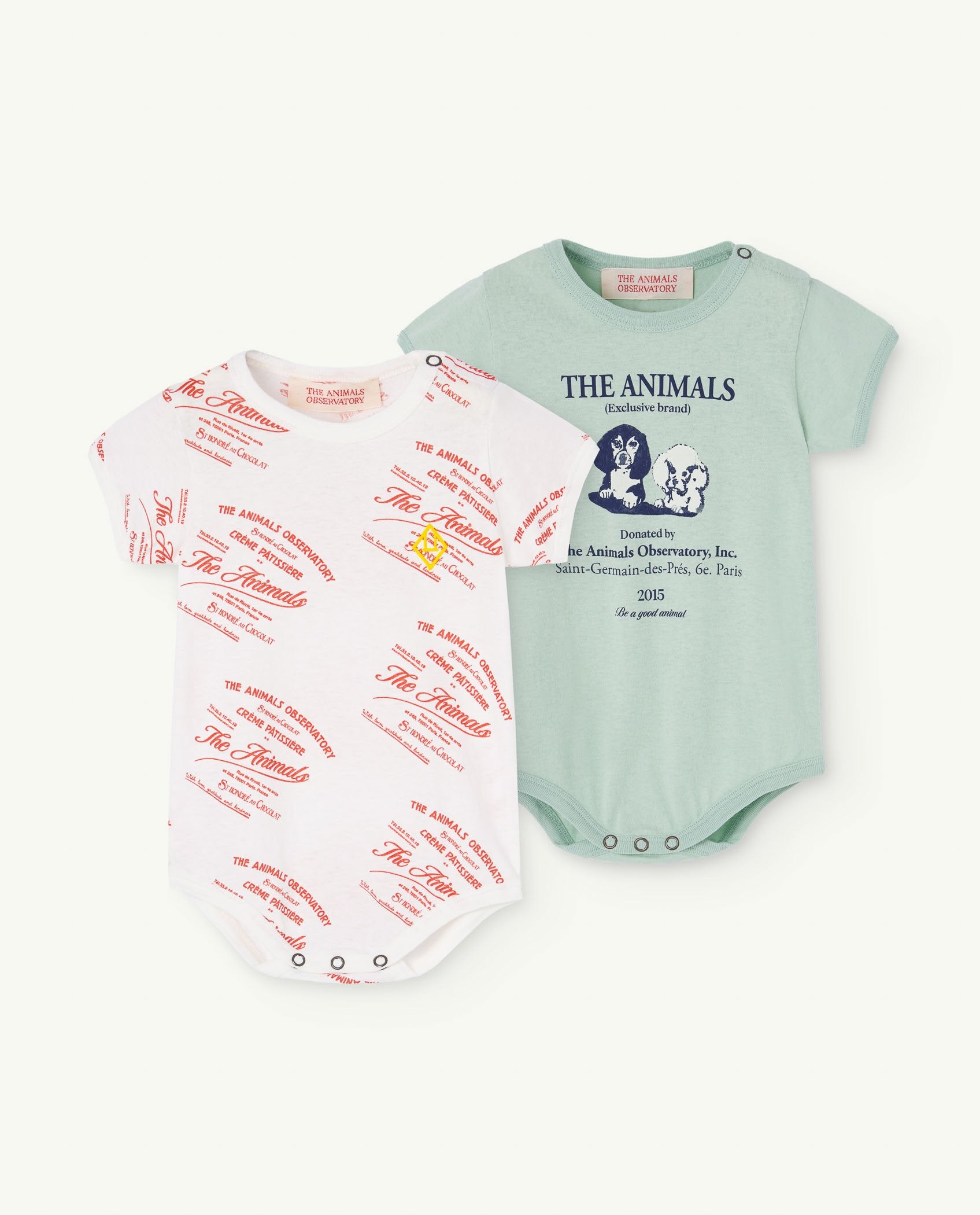 The Turquoise Pack Chimpanzee Baby Bodysuit includes two short-sleeved baby bodysuits, both 100% made of cotton and with the gentlest feel. The first one features the cutest puppies staring at you, and the second one a patterned print of a vintage French pâtisserie wrapping paper on a white canvass.