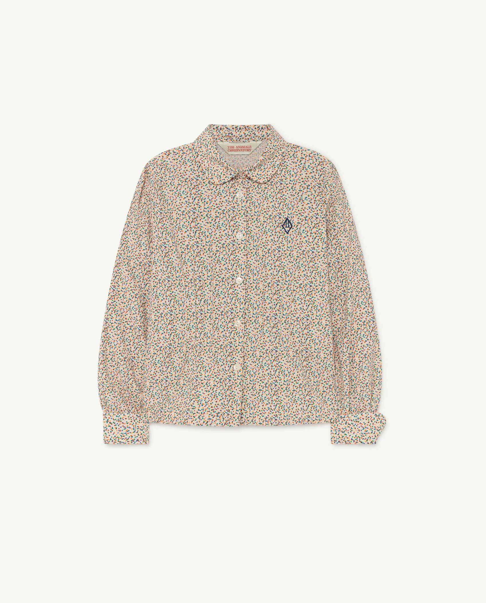 The Canary shirt features a peter pan collar. Made of 100% cotton, in a white dots print. Exclusively available on The Animals Observatory online shop.