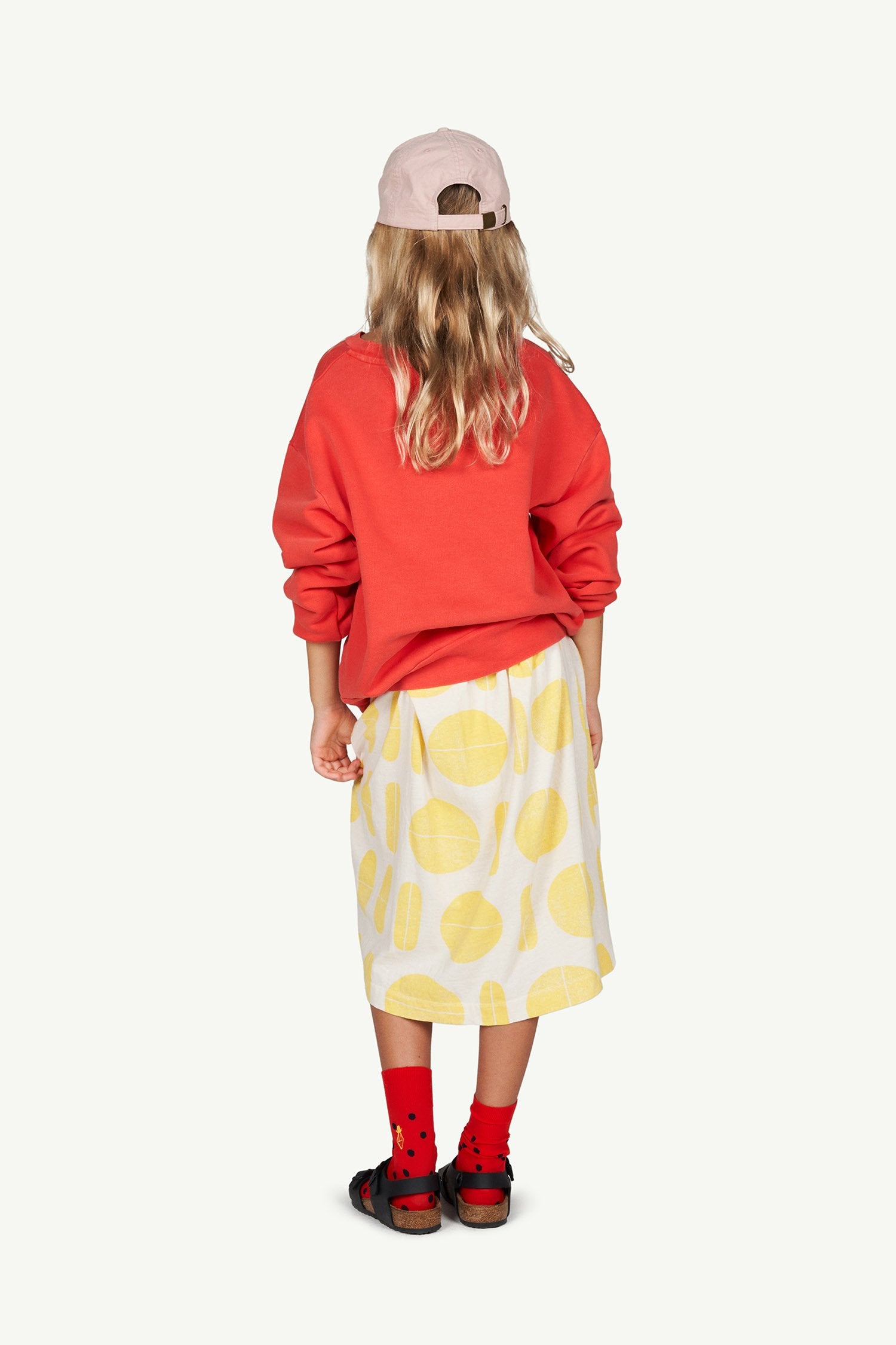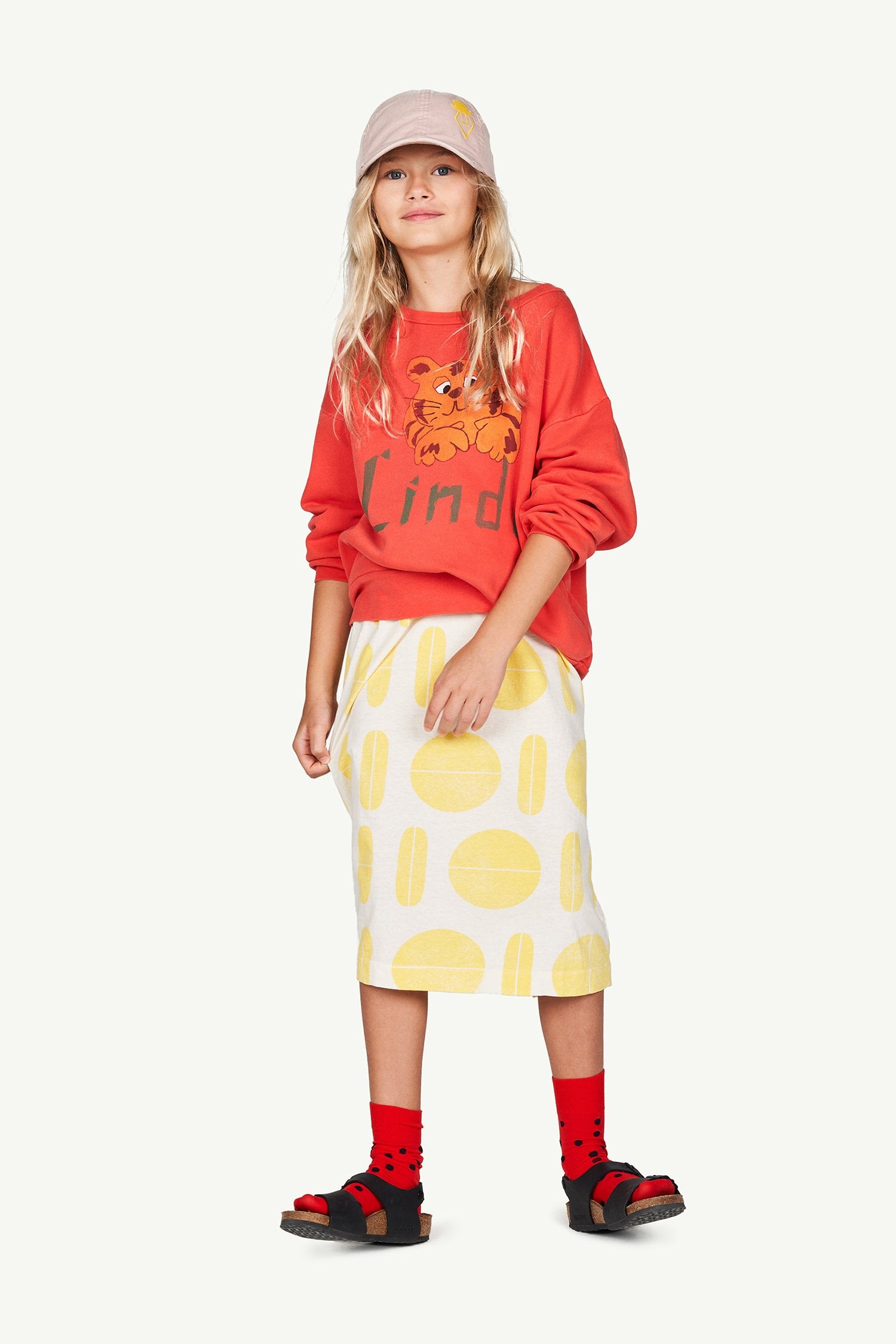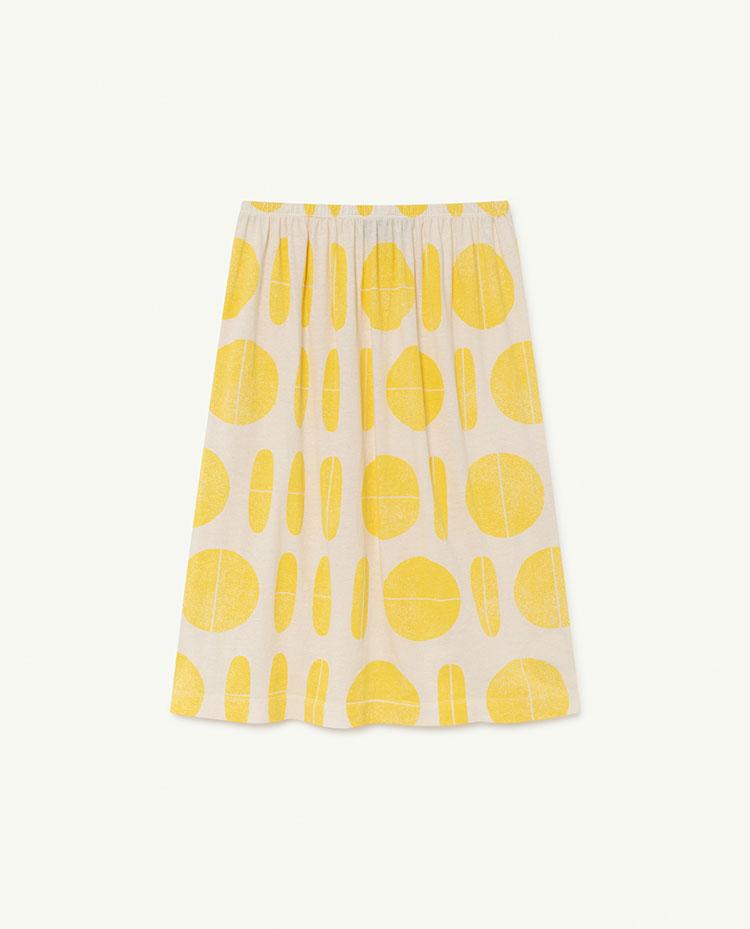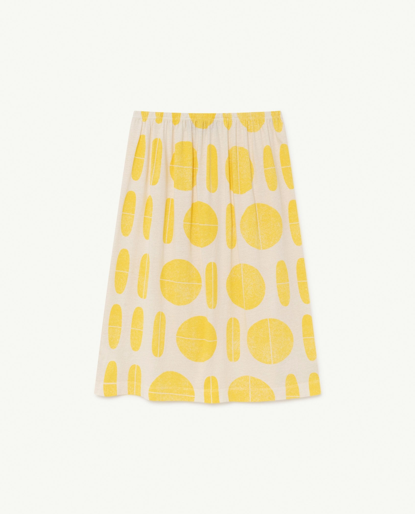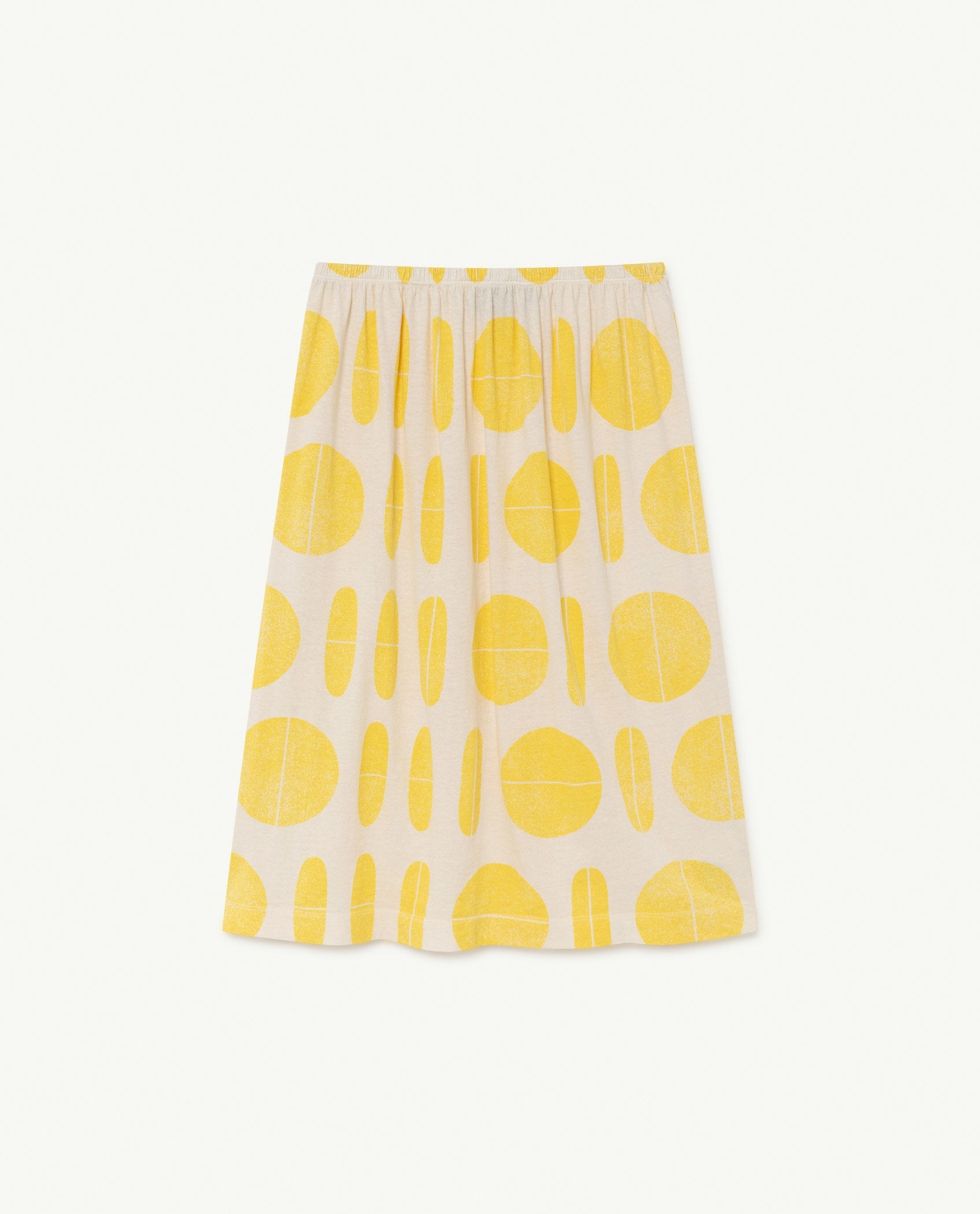 They'll be wearing this long jersey skirt all summer long, eye-catching in a yellow oval print.