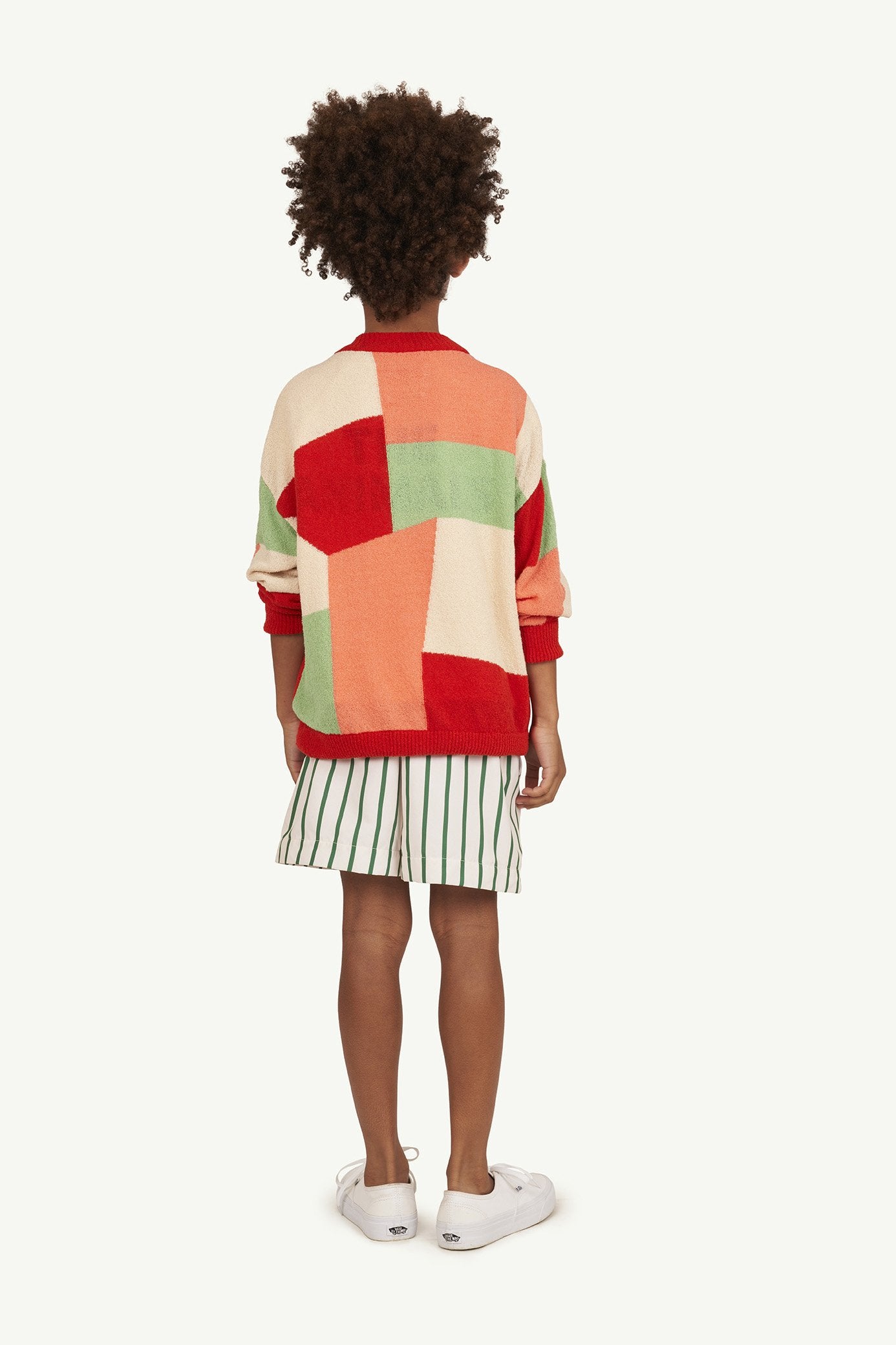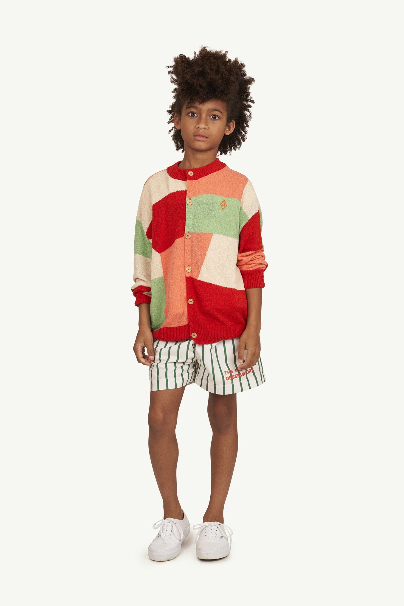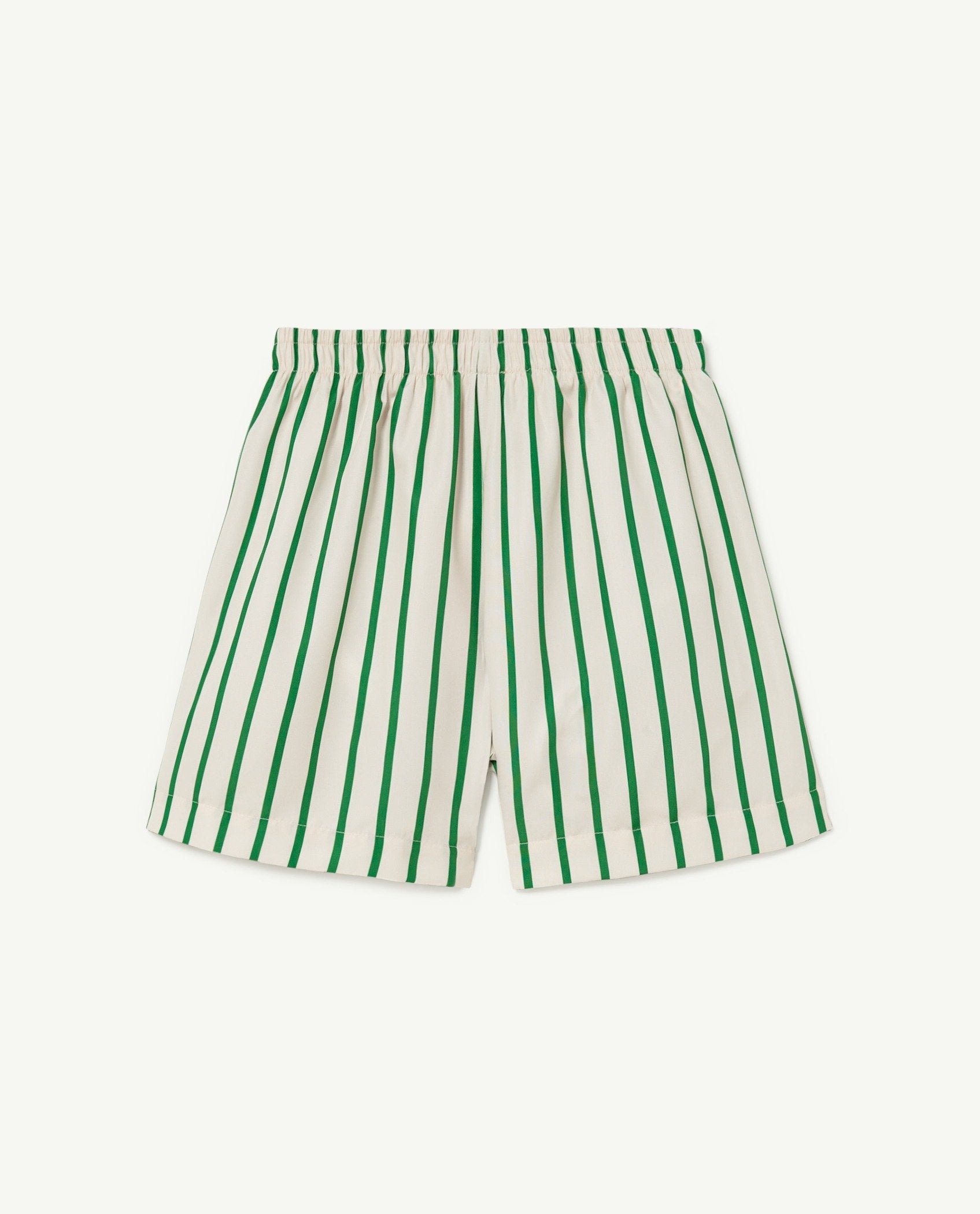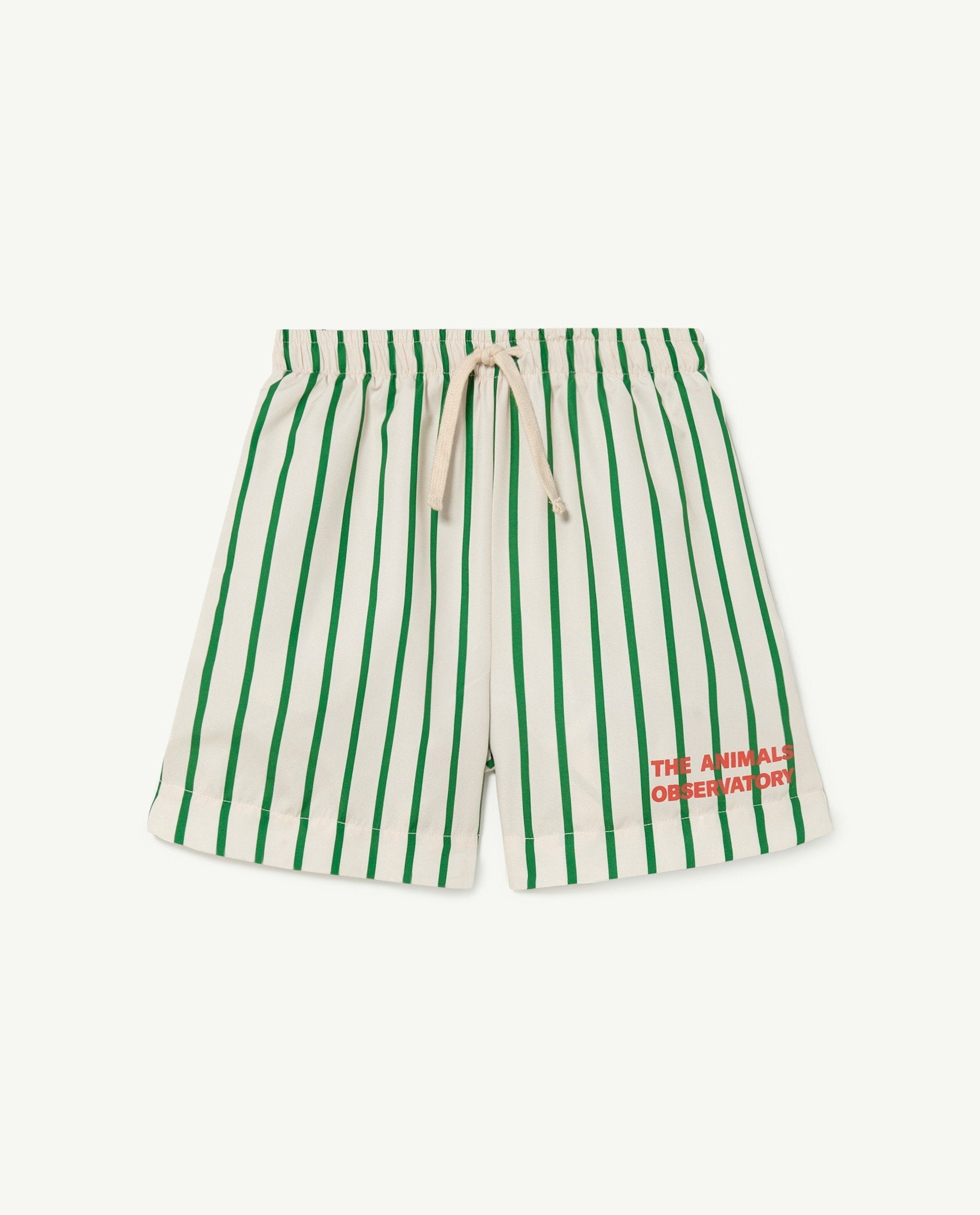 The White Puppy Swimsuit has a green stripes pattern and features The Animals Observatory in red capital letters on the front side. It features an elastic waistband and adjustable shoelaces. The model's height is 135 cm and is wearing size 8 years.