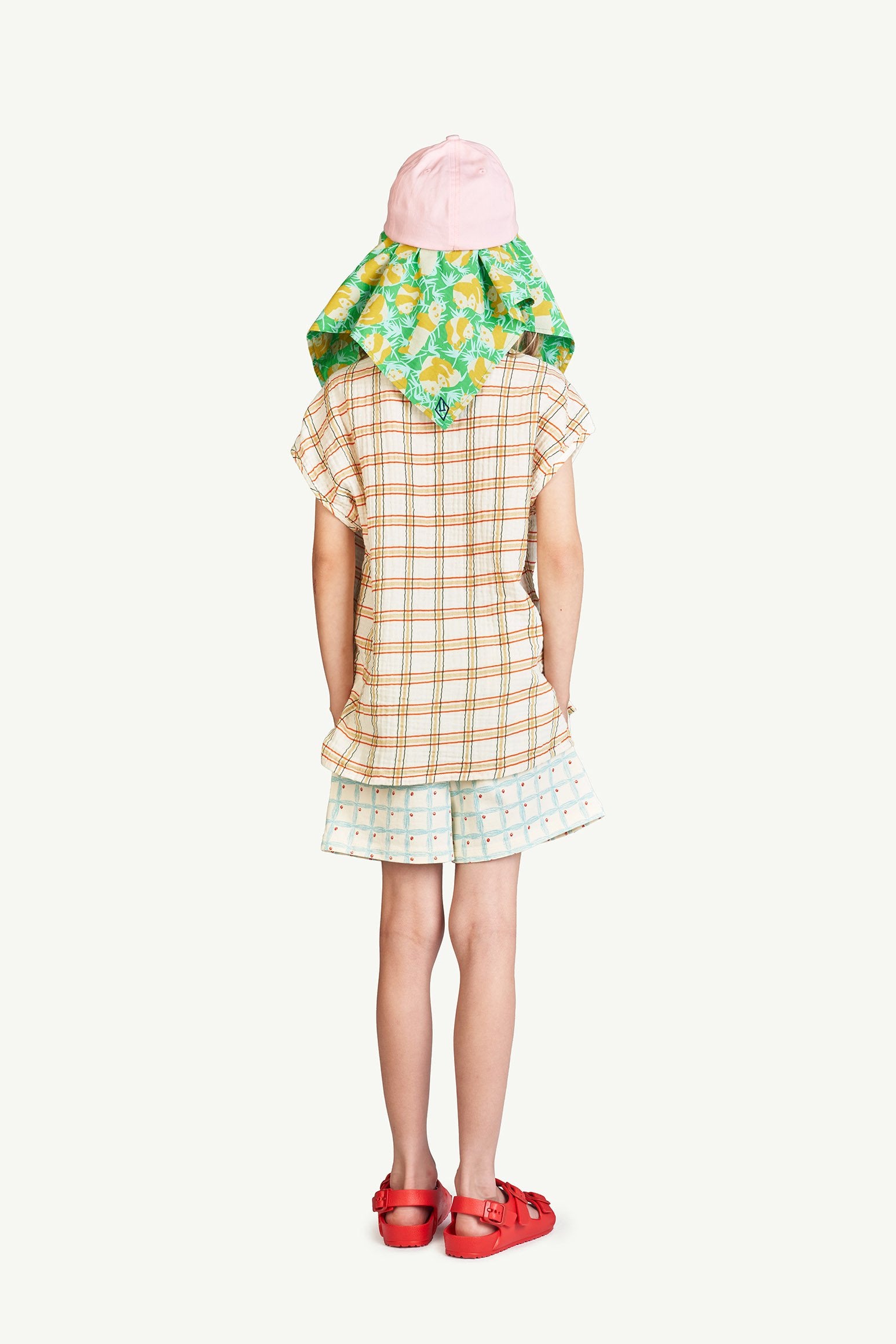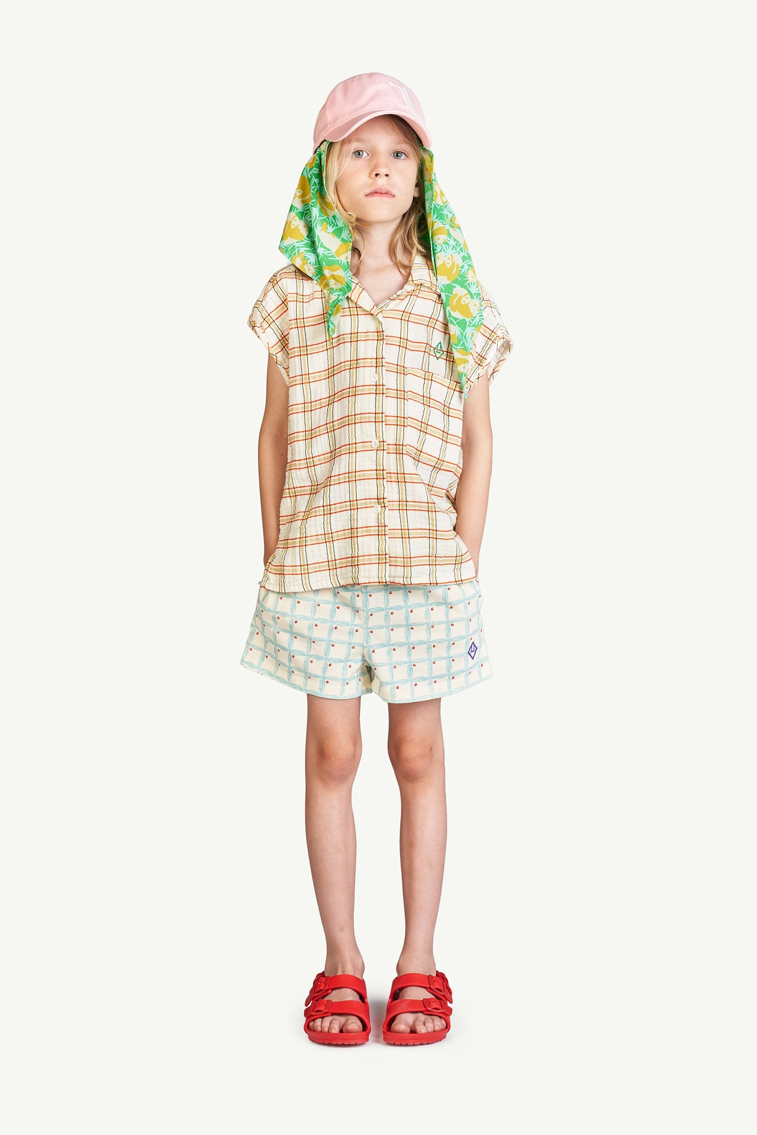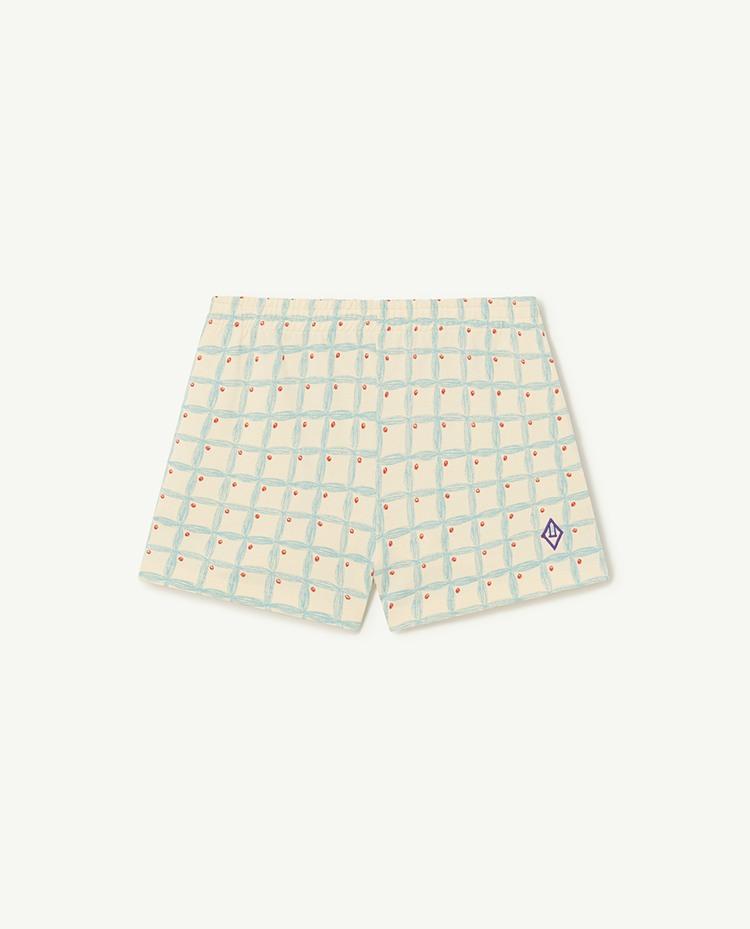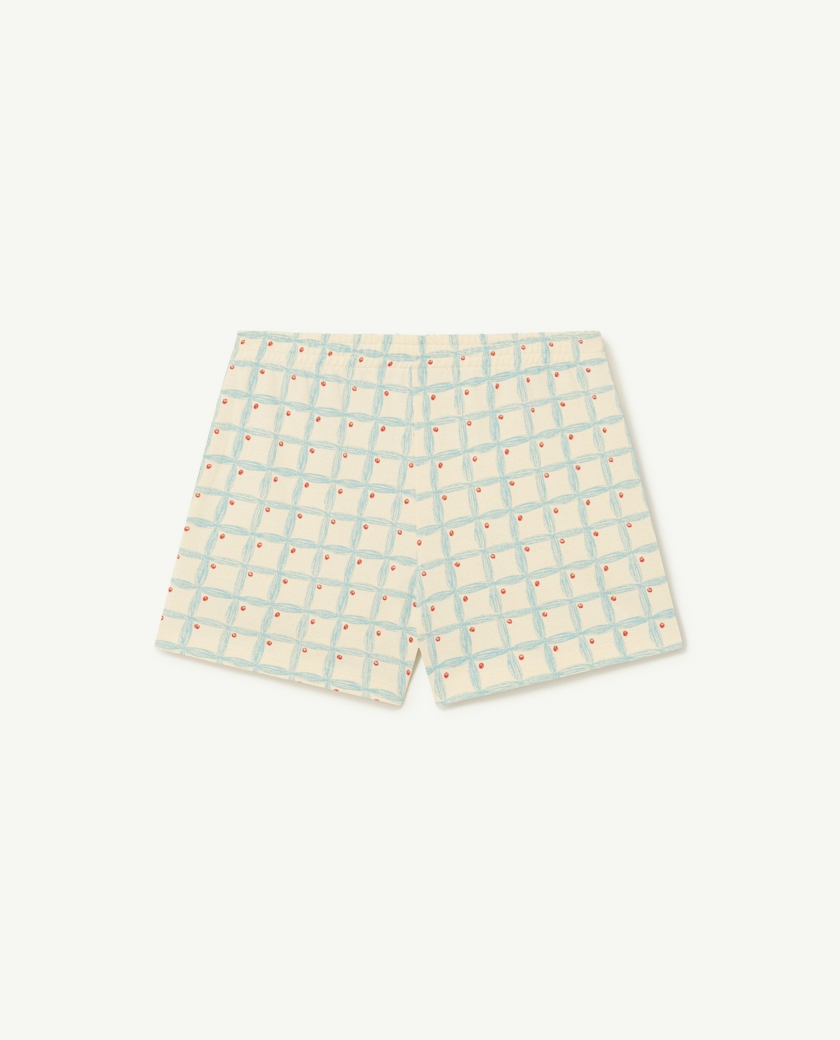 The White Square Poodle Pants feature a square pattern and The Animals Observatory logo on the lower-right front side. Fully cotton made and with an elastic waist. The model's height is 132 and is wearing size 8 years.