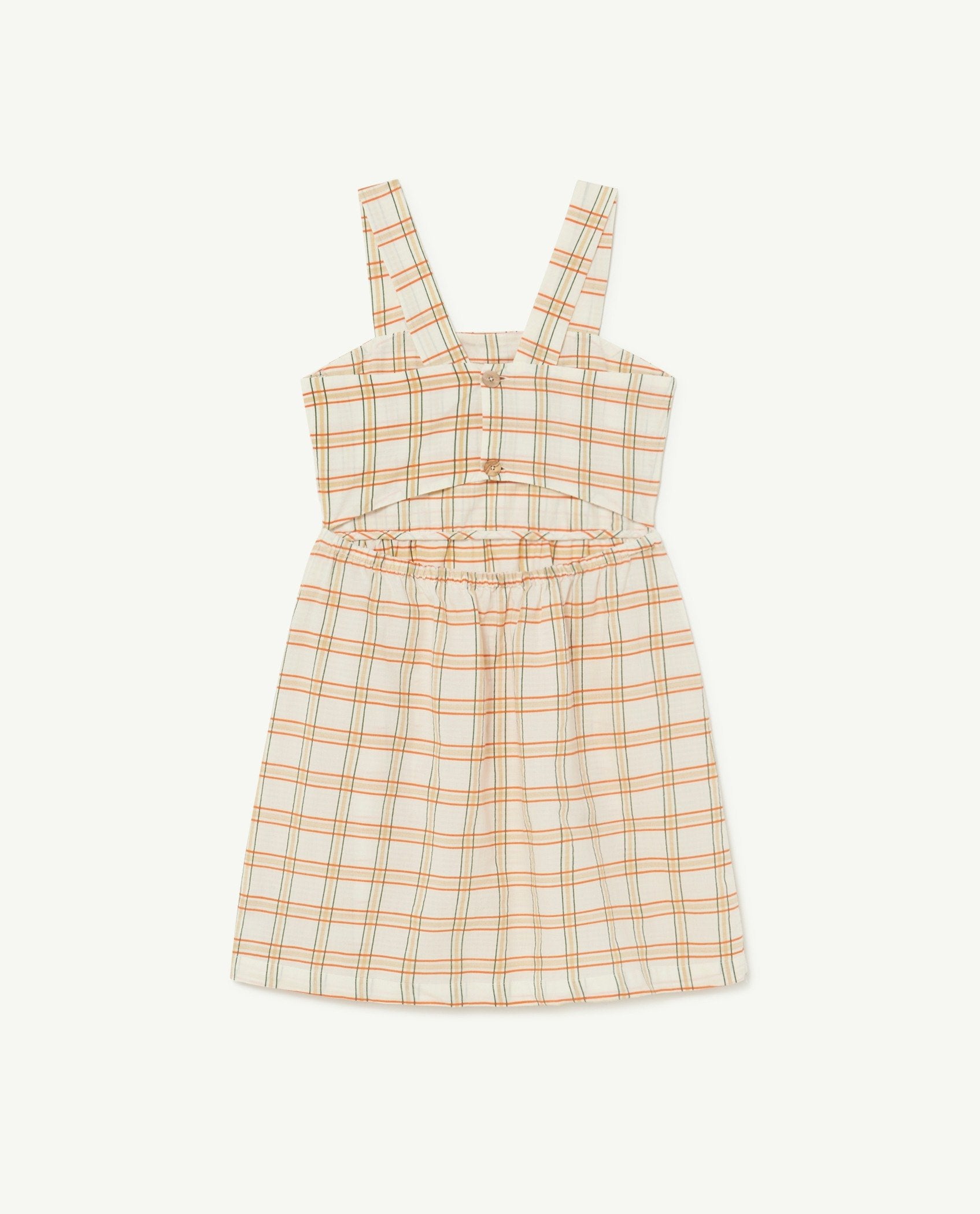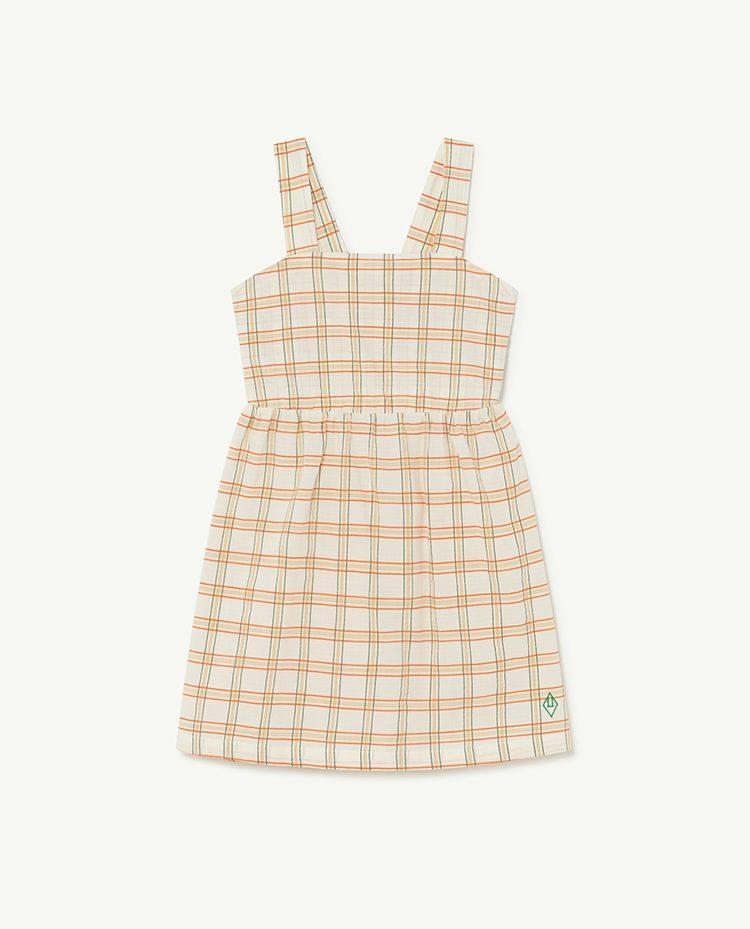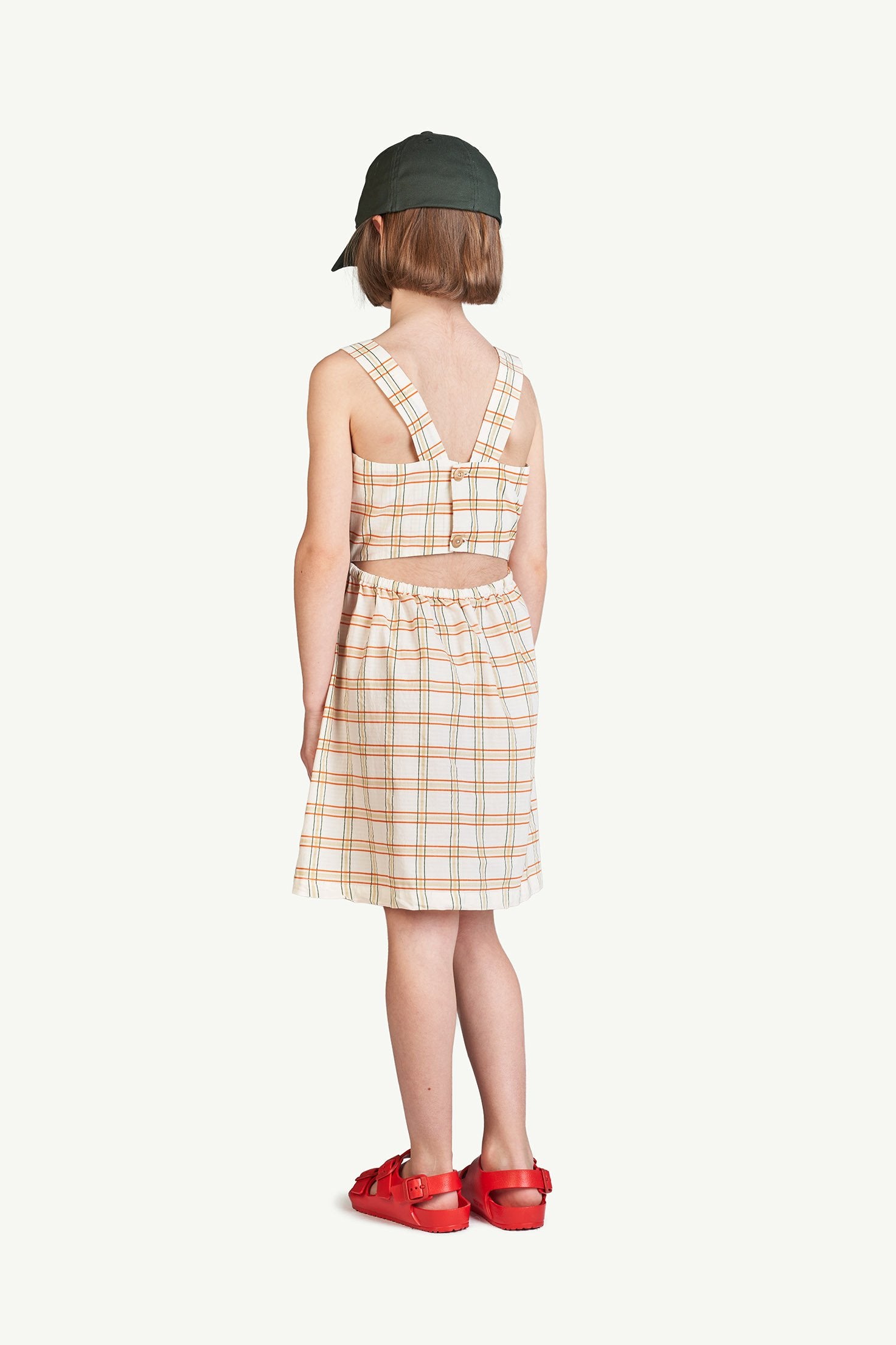 The White Squares Badger Dress is a strap dress with an open back and closed with a button up girdle. Deep into the spring with the Tattersall patter that covers the piece. The model's height is 130 cm and is wearing size 8 years.