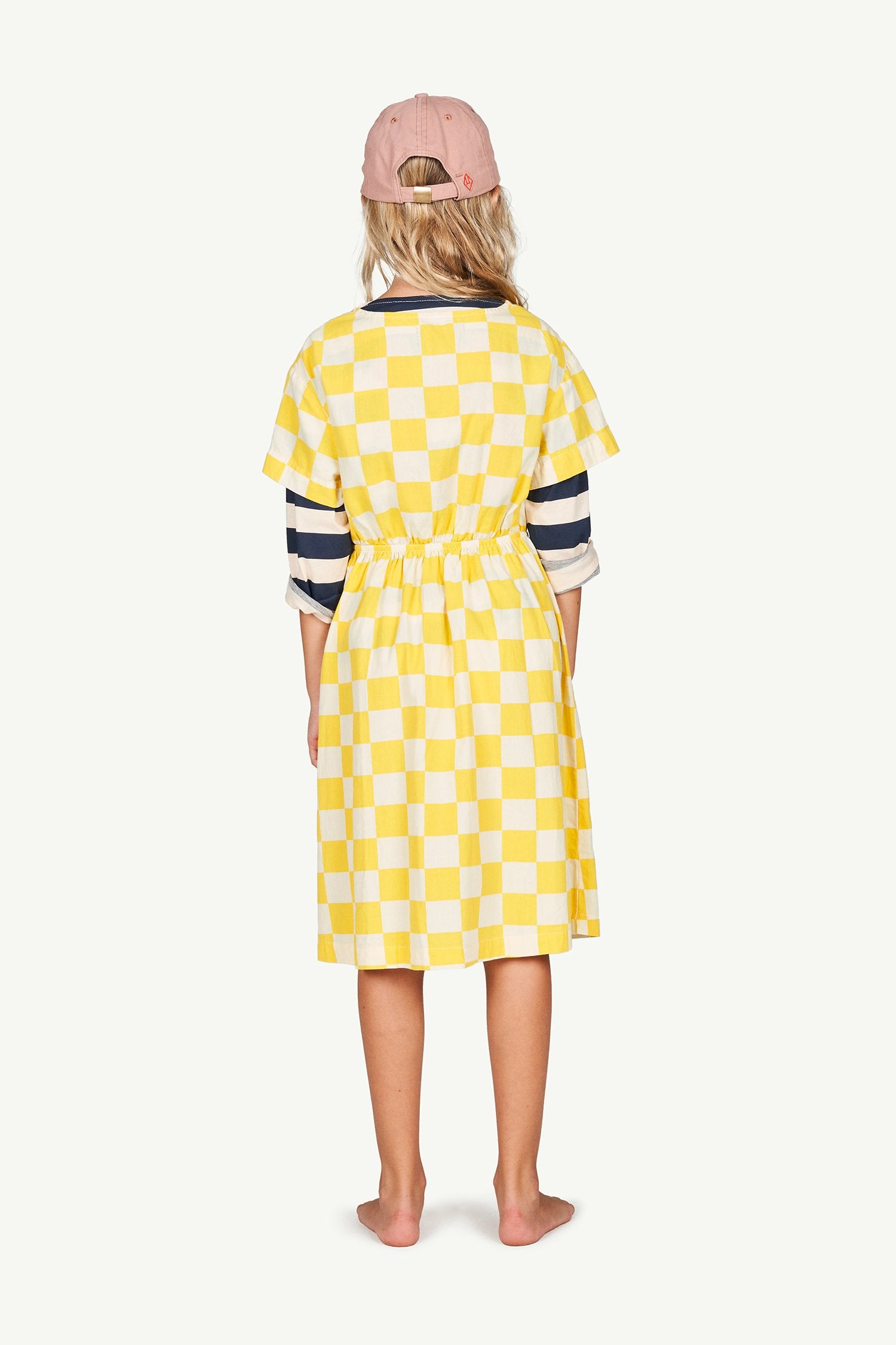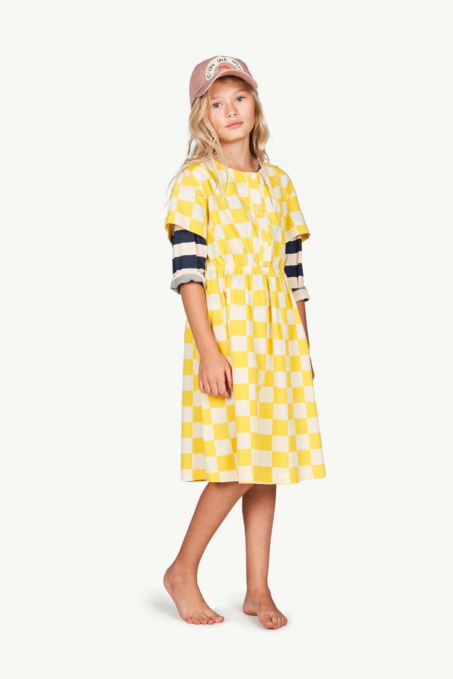 They'll love wearing this mid-length tea dress for playing with friends. Make a statement in a bold yellow and white geometric print.