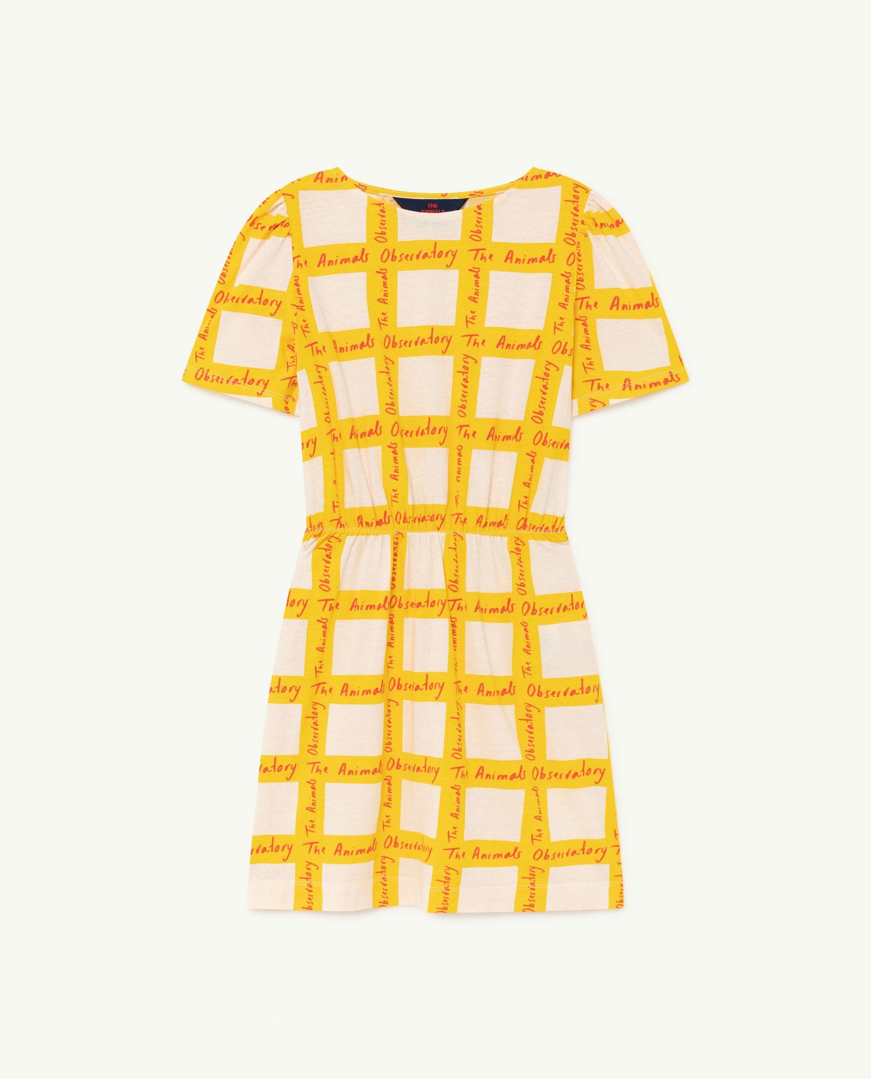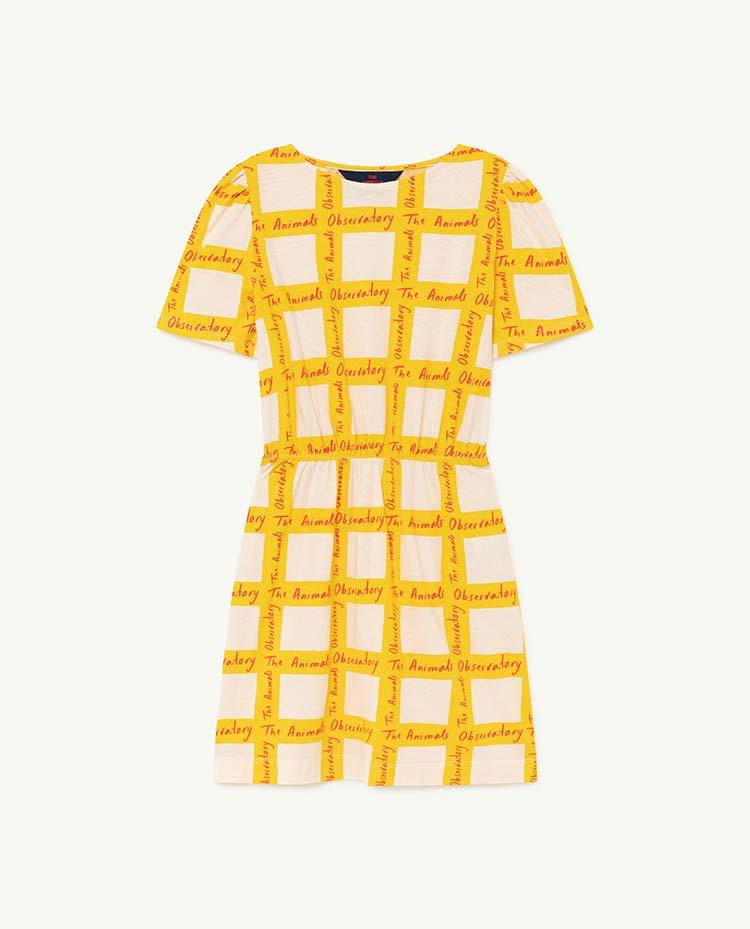This casual T-shirt dress is fitted at the waist and features a unique yellow and white square design.