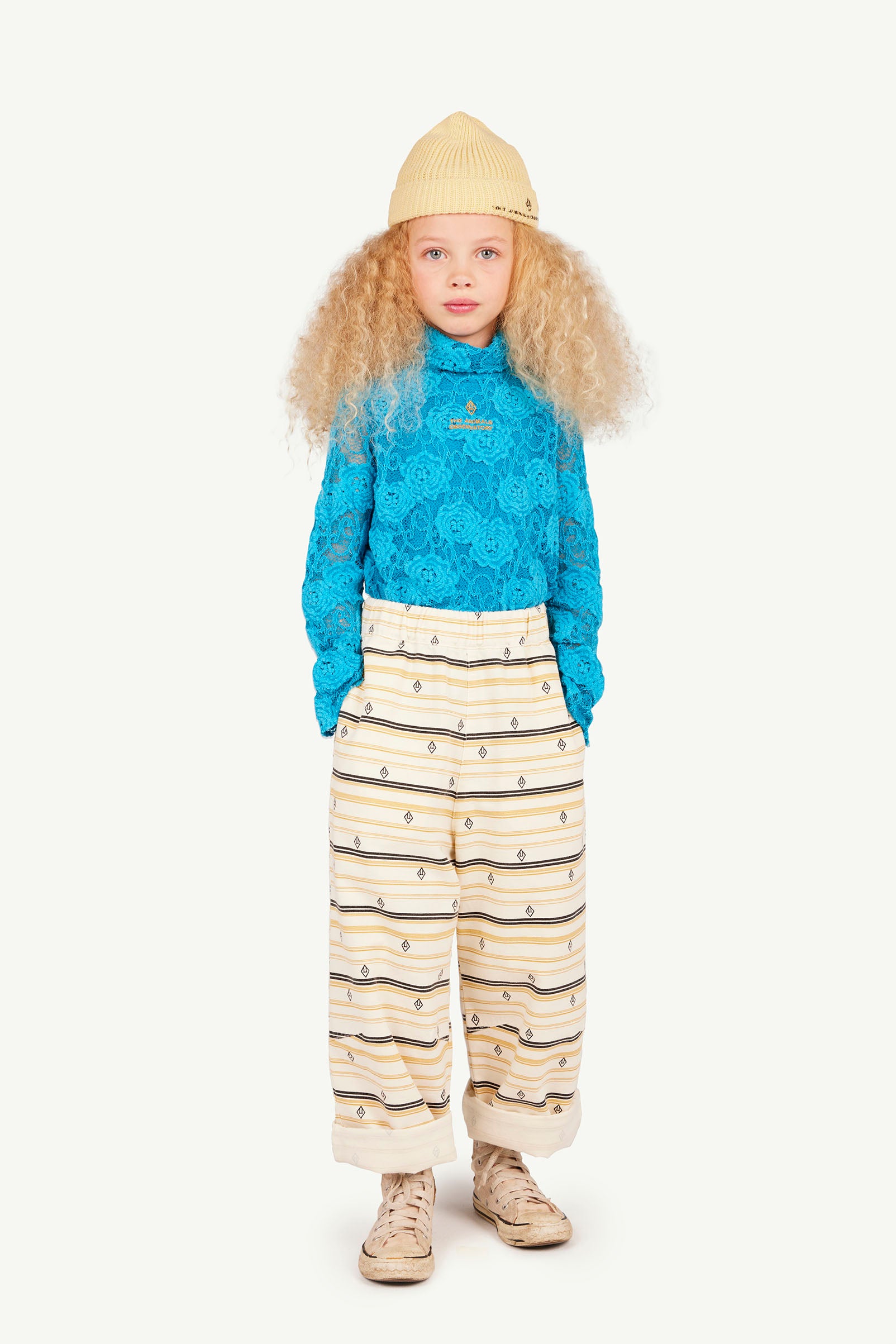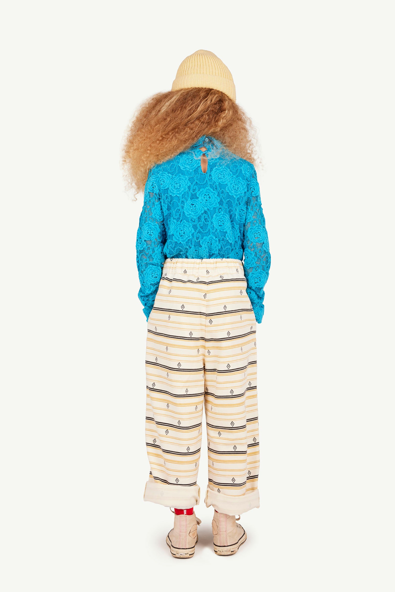These kids pants feature elastic hems and cuffs and some 80s-inspired golden stripes and symbols all over it.