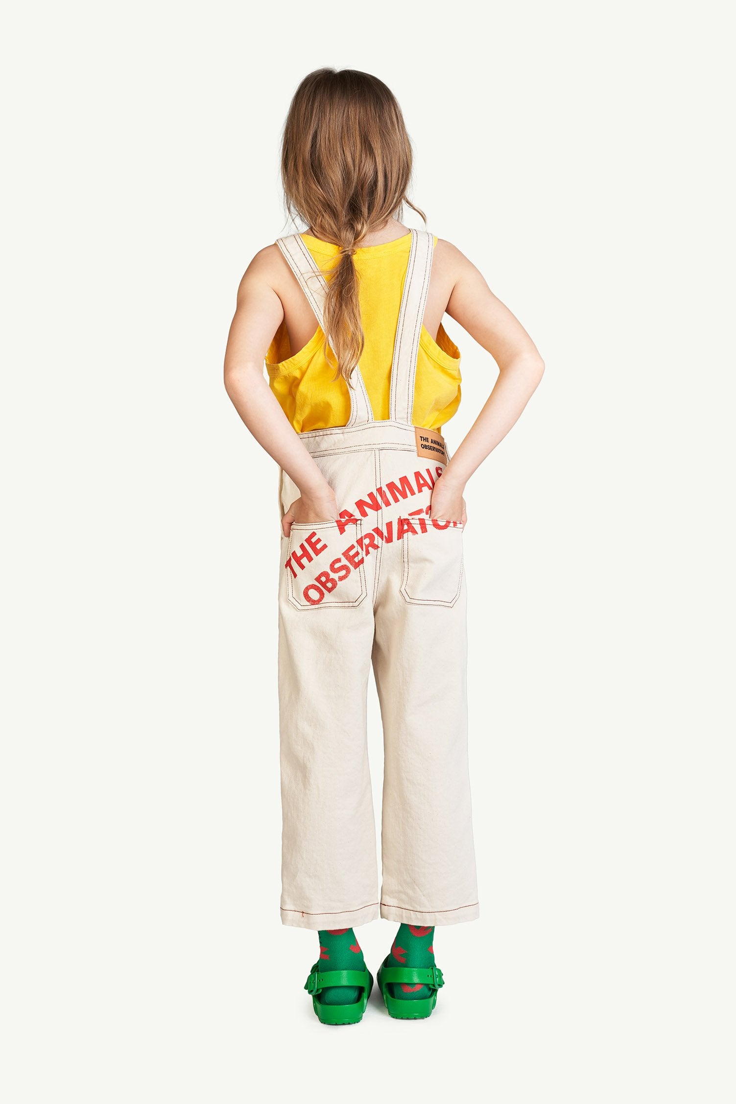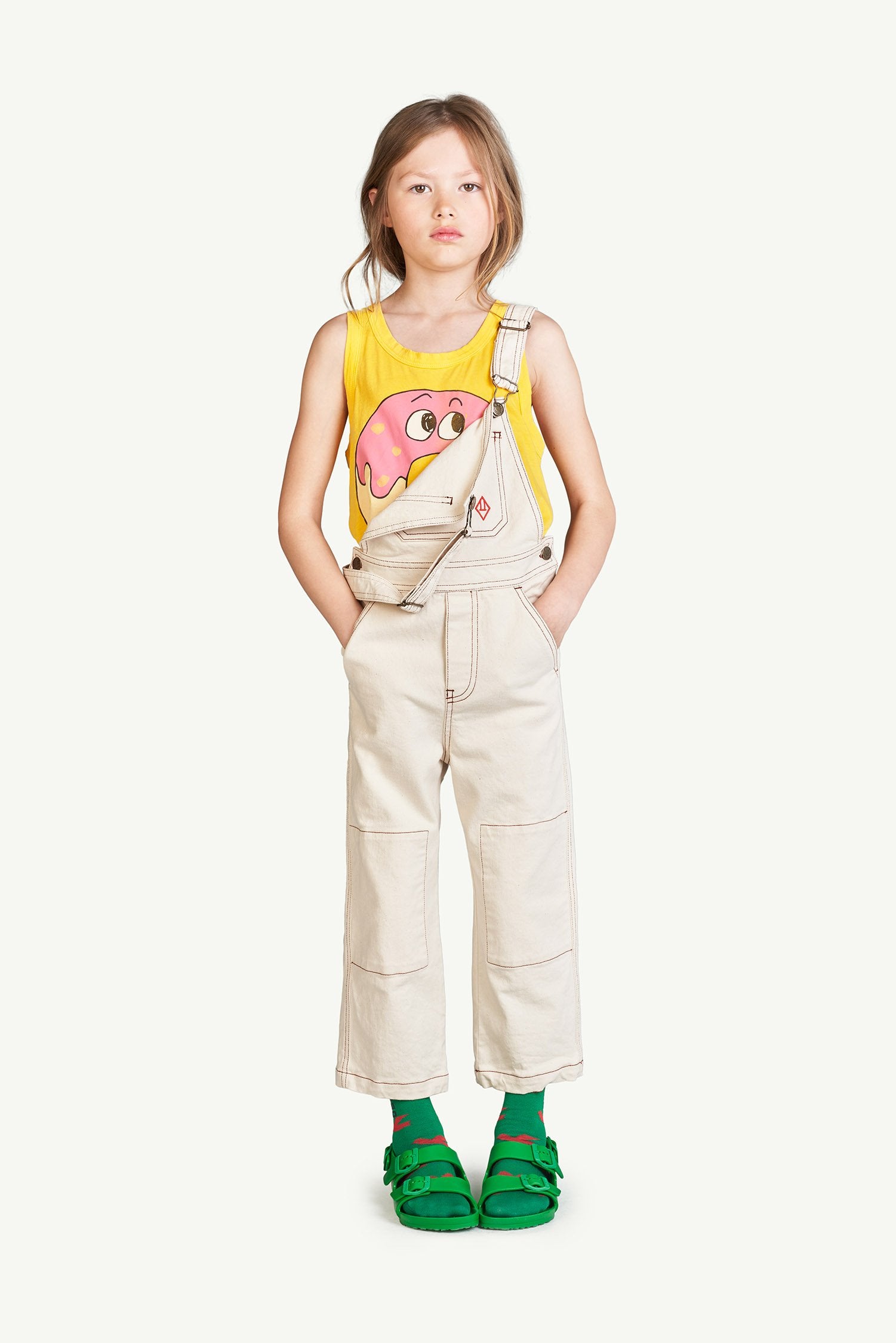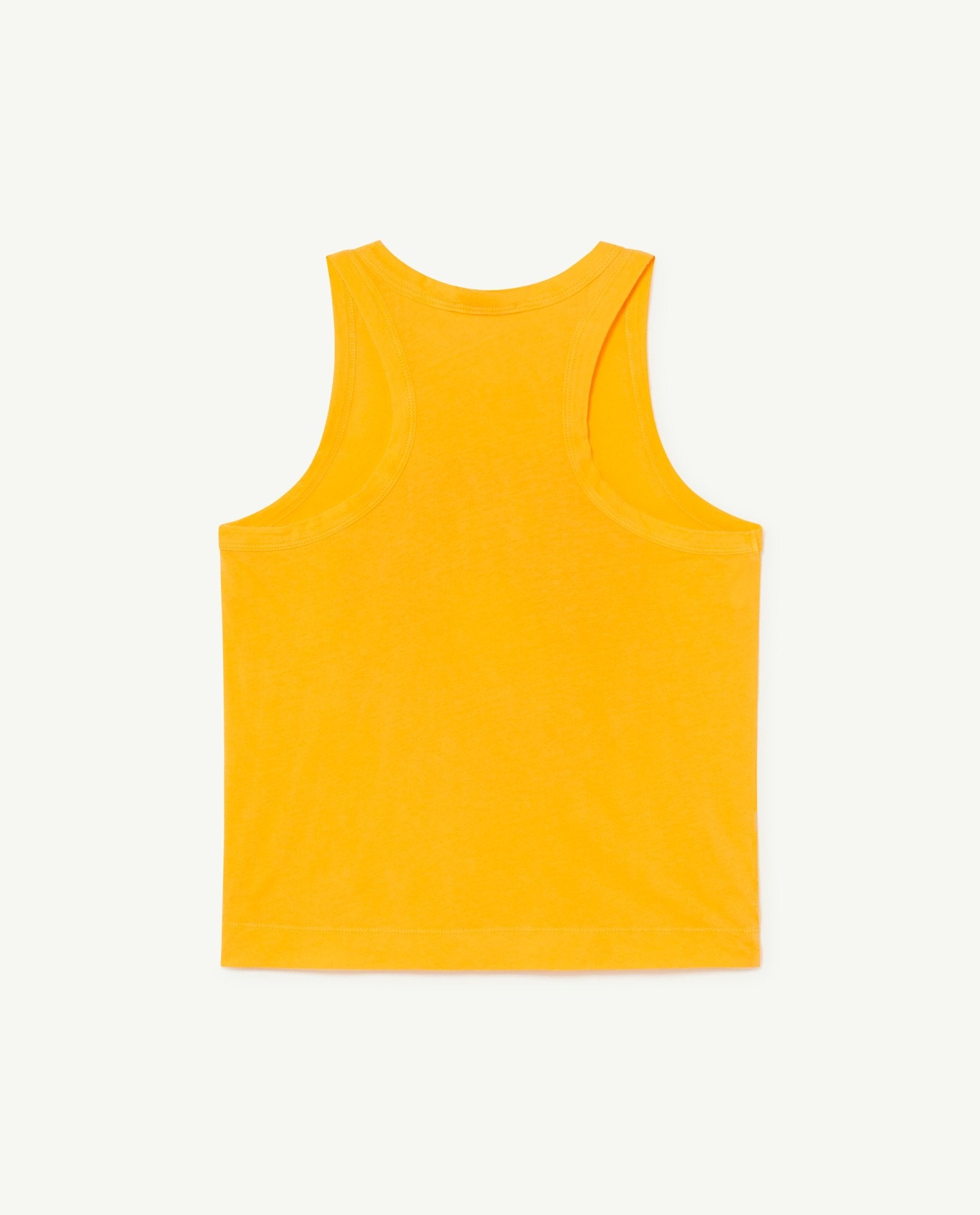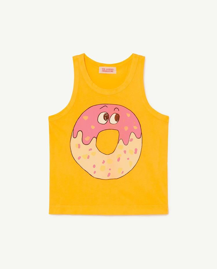 The Yellow Donut Frog T-Shirt is a yellow sleeveless 100% made t-shirt featuring a donut. A fun piece and easy to combine. The model's height is 132 cm and is wearing size 8 years.