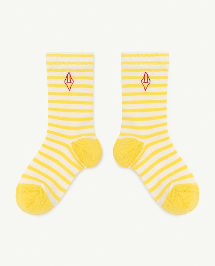 Keep their toes warm in cool yellow striped socks featuring The Animals Observatory logo.